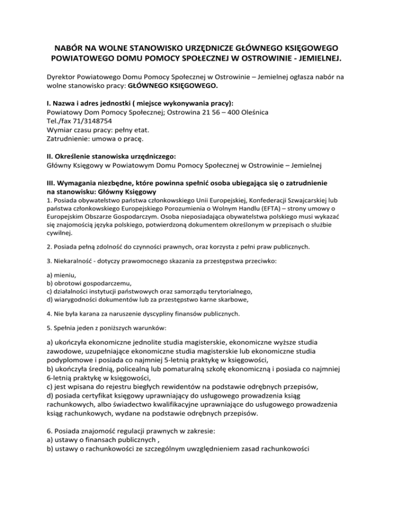 NABÓR NA WOLNE STANOWISKO URZĘDNICZE GŁÓWNEGO KSIĘGOWEGO POWIATOWEGO DOMU POMOCY SPOŁECZNEJ W OSTROWINIE ‐ JEMIELNEJ. Dyrektor Powiatowego Domu Pomocy Społecznej w Ostrowinie – Jemielnej ogłasza nabór na wolne stanowisko pracy: GŁÓWNEGO KSIĘGOWEGO. I. Nazwa i adres jednostki ( miejsce wykonywania pracy): Powiatowy Dom Pomocy Społecznej; Ostrowina 21 56 – 400 Oleśnica Tel./fax 71/3148754 Wymiar czasu pracy: pełny etat. Zatrudnienie: umowa o pracę. II. Określenie stanowiska urzędniczego: Główny Księgowy w Powiatowym Domu Pomocy Społecznej w Ostrowinie – Jemielnej III. Wymagania niezbędne, które powinna spełnić osoba ubiegająca się o zatrudnienie na stanowisku: Główny Księgowy 1. Posiada obywatelstwo państwa członkowskiego Unii Europejskiej, Konfederacji Szwajcarskiej lub państwa członkowskiego Europejskiego Porozumienia o Wolnym Handlu (EFTA) – strony umowy o Europejskim Obszarze Gospodarczym. Osoba nieposiadająca obywatelstwa polskiego musi wykazać się znajomością języka polskiego, potwierdzoną dokumentem określonym w przepisach o służbie cywilnej. 2. Posiada pełną zdolność do czynności prawnych, oraz korzysta z pełni praw publicznych. 3. Niekaralność ‐ dotyczy prawomocnego skazania za przestępstwa przeciwko: a) mieniu, b) obrotowi gospodarczemu, c) działalności instytucji państwowych oraz samorządu terytorialnego, d) wiarygodności dokumentów lub za przestępstwo karne skarbowe, 4. Nie była karana za naruszenie dyscypliny finansów publicznych. 5. Spełnia jeden z poniższych warunków: a) ukończyła ekonomiczne jednolite studia magisterskie, ekonomiczne wyższe studia zawodowe, uzupełniające ekonomiczne studia magisterskie lub ekonomiczne studia podyplomowe i posiada co najmniej 5‐letnią praktykę w księgowości, b) ukończyła średnią, policealną lub pomaturalną szkołę ekonomiczną i posiada co najmniej 6‐letnią praktykę w księgowości, c) jest wpisana do rejestru biegłych rewidentów na podstawie odrębnych przepisów, d) posiada certyfikat księgowy uprawniający do usługowego prowadzenia ksiąg rachunkowych, albo świadectwo kwalifikacyjne uprawniające do usługowego prowadzenia ksiąg rachunkowych, wydane na podstawie odrębnych przepisów. 6. Posiada znajomość regulacji prawnych w zakresie: a) ustawy o finansach publicznych , b) ustawy o rachunkowości ze szczególnym uwzględnieniem zasad rachunkowości obowiązujących w jednostkach sektora finansów publicznych, prowadzenia gospodarki finansowej jednostek budżetowych w tym DPS c) rozporządzenia Ministra Finansów o klasyfikacji dochodów i wydatków, d) klasyfikacji budżetowej dochodów i wydatków, e) ubezpieczeń społecznych oraz prawa podatkowego f) pomocy społecznej g) zamówień publicznych h) odpowiedzialności za naruszenie dyscypliny finansów publicznych oraz umiejętności ich właściwej interpretacji i stosowania. 7. Posiada znajomość zasad finansowania zadań pomocy społecznej na szczeblu jednostki organizacyjnej samorządu powiatowego. 8. Posiada stan zdrowia pozwalający na zatrudnienie na stanowisku głównego księgowego. 9. Posiada nieposzlakowaną opinię. IV. Wymagania dodatkowe: 1. Doświadczenie w zakresie prowadzenia gospodarki finansowej i księgowości w jednostkach samorządowych na stanowisku głównego księgowego. 2. Posiada znajomość programów finansowo – księgowych. 3. Posiada biegłą umiejętność obsługi komputera ( edytory tekstu, arkusze kalkulacyjne, itp.) 4. Posiada znajomość oprogramowania niezbędnego do sporządzania sprawozdawczości budżetowej, sprawozdawczości GUS, PFRON. 5. Posiada predyspozycje do pracy na stanowisku kierowniczym, organizowania pracy, współdziałania w grupie pracowniczej. V. Do zadań pracownika zatrudnionego na stanowisko głównego księgowego należy: 1. Prowadzenie gospodarki finansowej i rachunkowości jednostki zgodnie z obowiązującymi przepisami i zasadami w szczególności: a) opracowanie projektów przepisów wewnętrznych wydawanych przez kierownika jednostki dotyczących prowadzenia rachunkowości, b) prowadzenie ksiąg rachunkowych jednostki samorządowej, c) sporządzanie sprawozdań finansowych, budżetowych oraz innych związanych z realizacji zadań jednostki, d) zorganizowanie gromadzenia i przechowywania dokumentacji księgowej w sposób zabezpieczający ją przed dostępem osób nieuprawnionych, zaginięciem lub zniszczeniem, e) prawidłowe i terminowe dokonywanie rozliczeń finansowych, f) terminowe przekazywanie rzetelnych informacji ekonomicznych, g) nadzór nad terminowym i prawidłowym przeprowadzeniem inwentaryzacji składników majątkowych jednostki, h) kierowanie pracą w księgowości oraz nadzorowanie całokształtu prac z zakresu rachunkowości, wykonywanych przez pracowników jednostki. 2. Prowadzenie gospodarki finansowej jednostki zgodnie z zasadami gospodarowania środkami publicznymi: a) opracowywanie projektów planów finansowych jednostek budżetowych i ich zmian, b)dokonywanie bieżącej analizy wykonania planów finansowych i bieżące informowanie kierownika jednostki o stopniu realizacji dochodów i wydatków oraz o prawidłowości wykorzystania środków otrzymanych na wydatki z budżetu jednostki samorządu terytorialnego, c) wykonywanie dyspozycji środkami pieniężnymi zgodnie z przepisami dotyczącymi zasad dokonywania wydatków publicznych, d) nadzorowanie nad prawidłowością umów pod względem finansowym, e) przestrzeganie zasad rozliczeń pieniężnych i ochrony wartości pieniężnych. 3. Dokonywanie wstępnej kontroli: a) zgodności operacji gospodarczych i finansowych z planem finansowym. b) kompletności i rzetelności dokumentów dotyczących operacji gospodarczych i finansowych jednostki. VI. Wymagane dokumenty: W celu potwierdzenia spełniania wymagań kandydat przedstawia: 1. List motywacyjny. 2. Życiorys 3. Oświadczenie o niekaralności ( wyciąg z Krajowego Rejestru Karnego w przypa
