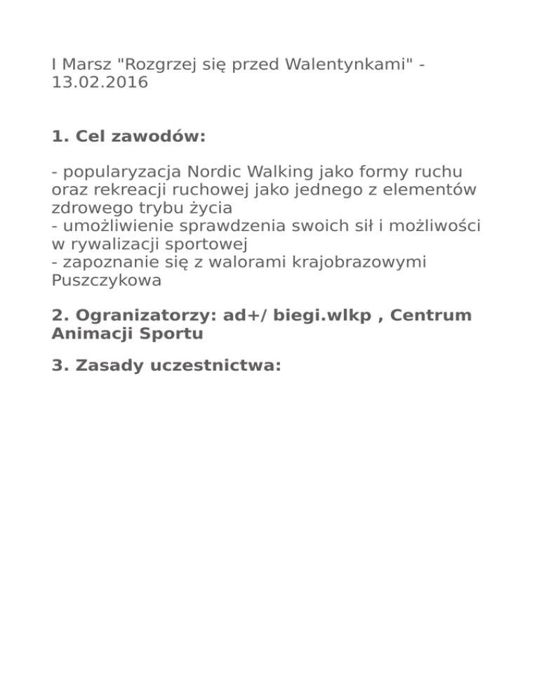 I Marsz "Rozgrzej się przed Walentynkami" 13.02.2016 1. Cel zawodów: - popularyzacja Nordic Walking jako formy ruchu oraz rekreacji ruchowej jako jednego z elementów zdrowego trybu życia - umożliwienie sprawdzenia swoich sił i możliwości w rywalizacji sportowej - zapoznanie się z walorami krajobrazowymi Puszczykowa 2. Ogranizatorzy: ad+/ biegi.wlkp , Centrum Animacji Sportu 3. Zasady uczestnictwa: - zawodnicy powyżej 18 roku życia podpisują oświadczenie o starcie na własną odpowiedzialność - osoby w wieku 15-18 lat (które w dniu biegu nie osiągnęły jeszcze pełnoletności) zobowiązane są do posiadania pozwolenia na udział od rodziców lub prawnych opiekunów, z ich podpisem i nr PESEL. - zgłoszenia można dokonać drogą elektroniczną poprzez formularz dostępny na stronie - limit uczestników wynosi 150 osób - osobę liczy się jako zgłoszoną, gdy wypełni formularz oraz dokona wpłaty startowego - zgłaszając się poprzez formularz uczestnik akceptuje niniejszy regulamin - każdy zawodnik zobowiązany jest do uiszczenia startowego, o czym szerzej w kolejnym punkcie 4. Zasady finansowania: - wpisowe wynosi : 25 zł (do dnia 5 lutego) 30 zł (od 6 do 12 lutego) 35 zł (w dniu zawodów) - wpisowe należy uiścić na konto: ad+ Ulica:UL. NADWARCIAŃSKA Nr posesji i lokalu: 42 Kod pocztowy: 62-040 Miejscowość: PUSZCZYKOWO 23 1090 2590 0000 0001 3128 0547 z dopiskiem marsz + imię i nazwisko 5. Termin i miejsce: - miejsce zawodów: Puszczykowo, start,meta i parking w bezpośrednim sąsiedztwie Centrum Animacji Sportu na ul. Kościelnej biuro zawodów: Centrum Animacji Sportu przy ul. Kościelnej (Puszczykowo) - termin biegu: 13.02.16 start: 17:00, otwarcie biura zawodów: 15:00 6. Trasa: Trasa marszu to dwie lub jedna pętla (4 km) w zależności od wybranego dystansu po ścieżkach gruntowych na oznaczonej trasie 7. Nagrody i klasyfikacje: Dekoracje przeprowadzone zostaną dla następujących kategorii : OPEN mężczyzn (nagradzane miejsca 1-5) OPEN kobiet (nagradzane miejsca 1-5) Każdy zawodnik otrzyma na mecie pamiątkowy medal 8. Wyżywienie: Organizator zapewnia ciepłe napoje oraz bufet po biegu. 9. Opieka medyczna Organizator zapewnia opiekę medyczną w postaci kwalifikowanego ratownika w czasie trwania biegu oraz po jego zakończeniu W biurze zawodów zawodnik zobowiązany jest okazać aktualne badania lekarskie bądź też podpisać oświadczenie o starcie na własną odpowiedzialność. 10. Postanowienia dodatkowe - Ostateczna interpretacja regulaminu należy do organizatora - Organizator zastrzega sobie prawo do dyskwalifikacji zawodnika w wypadku celowego "skrócenia" trasy lub też innego niesportowego zachowania wobec innych uczestników marszu