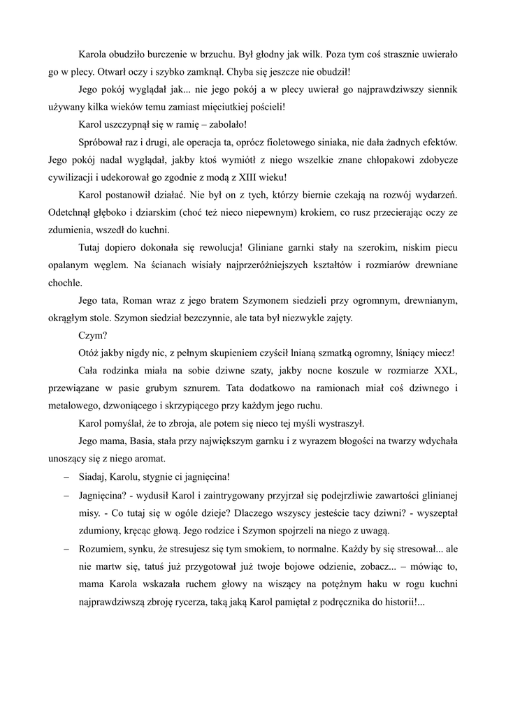 Karola obudziło burczenie w brzuchu. Był głodny jak wilk. Poza tym coś strasznie uwierało go w plecy. Otwarł oczy i szybko zamknął. Chyba się jeszcze nie obudził! Jego pokój wyglądał jak... nie jego pokój a w plecy uwierał go najprawdziwszy siennik używany kilka wieków temu zamiast mięciutkiej pościeli! Karol uszczypnął się w ramię – zabolało! Spróbował raz i drugi, ale operacja ta, oprócz fioletowego siniaka, nie dała żadnych efektów. Jego pokój nadal wyglądał, jakby ktoś wymiótł z niego wszelkie znane chłopakowi zdobycze cywilizacji i udekorował go zgodnie z modą z XIII wieku! Karol postanowił działać. Nie był on z tych, którzy biernie czekają na rozwój wydarzeń. Odetchnął głęboko i dziarskim (choć też nieco niepewnym) krokiem, co rusz przecierając oczy ze zdumienia, wszedł do kuchni. Tutaj dopiero dokonała się rewolucja! Gliniane garnki stały na szerokim, niskim piecu opalanym węglem. Na ścianach wisiały najprzeróżniejszych kształtów i rozmiarów drewniane chochle. Jego tata, Roman wraz z jego bratem Szymonem siedzieli przy ogromnym, drewnianym, okrągłym stole. Szymon siedział bezczynnie, ale tata był niezwykle zajęty. Czym? Otóż jakby nigdy nic, z pełnym skupieniem czyścił lnianą szmatką ogromny, lśniący miecz! Cała rodzinka miała na sobie dziwne szaty, jakby nocne koszule w rozmiarze XXL, przewiązane w pasie grubym sznurem. Tata dodatkowo na ramionach miał coś dziwnego i metalowego, dzwoniącego i skrzypiącego przy każdym jego ruchu. Karol pomyślał, że to zbroja, ale potem się nieco tej myśli wystraszył. Jego mama, Basia, stała przy największym garnku i z wyrazem błogości na twarzy wdychała unoszący się z niego aromat. − Siadaj, Karolu, stygnie ci jagnięcina! − Jagnięcina? - wydusił Karol i zaintrygowany przyjrzał się podejrzliwie zawartości glinianej misy. - Co tutaj się w ogóle dzieje? Dlaczego wszyscy jesteście tacy dziwni? - wyszeptał zdumiony, kręcąc głową. Jego rodzice i Szymon spojrzeli na niego z uwagą. − Rozumiem, synku, że stresujesz się tym smokiem, to normalne. Każdy by się stresował... ale nie martw się, tatuś już przygotował już twoje bojowe odzienie, zobacz... – mówiąc to, mama Karola wskazała ruchem głowy na wiszący na potężnym haku w rogu kuchni najprawdziwszą zbroję rycerza, taką jaką Karol pamiętał z podręcznika do historii!...