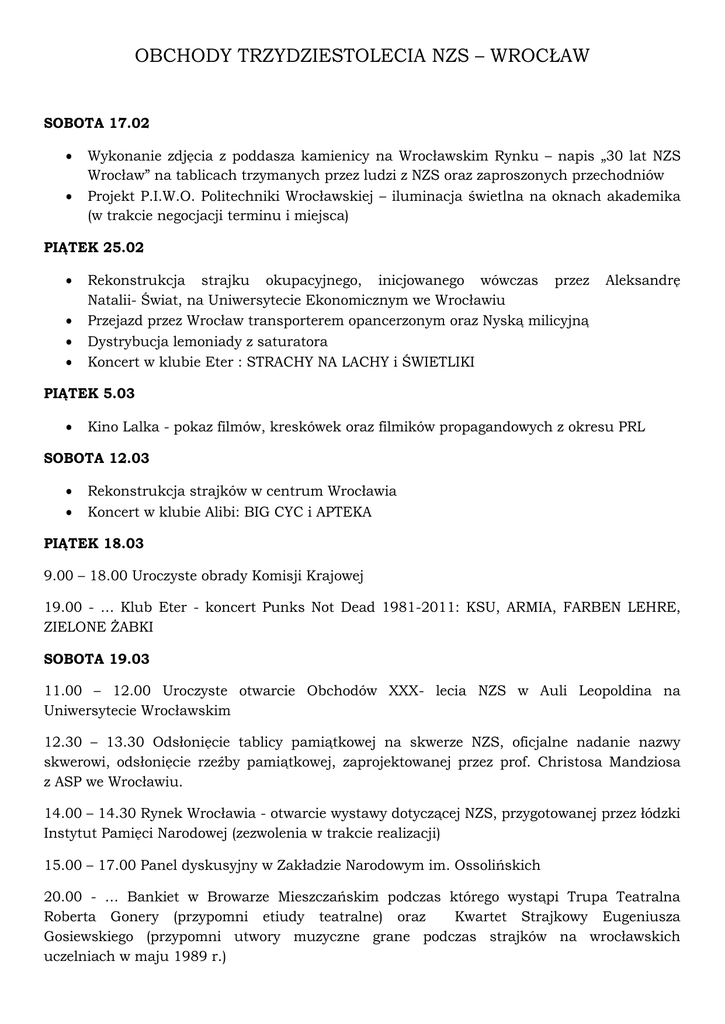 OBCHODY TRZYDZIESTOLECIA NZS – WROCŁAW SOBOTA 17.02 Wykonanie zdjęcia z poddasza kamienicy na Wrocławskim Rynku – napis „30 lat NZS Wrocław” na tablicach trzymanych przez ludzi z NZS oraz zaproszonych przechodniów Projekt P.I.W.O. Politechniki Wrocławskiej – iluminacja świetlna na oknach akademika (w trakcie negocjacji terminu i miejsca) PIĄTEK 25.02 Rekonstrukcja strajku okupacyjnego, inicjowanego wówczas przez Natalii- Świat, na Uniwersytecie Ekonomicznym we Wrocławiu Przejazd przez Wrocław transporterem opancerzonym oraz Nyską milicyjną Dystrybucja lemoniady z saturatora Koncert w klubie Eter : STRACHY NA LACHY i ŚWIETLIKI Aleksandrę PIĄTEK 5.03 Kino Lalka - pokaz filmów, kreskówek oraz filmików propagandowych z okresu PRL SOBOTA 12.03 Rekonstrukcja strajków w centrum Wrocławia Koncert w klubie Alibi: BIG CYC i APTEKA PIĄTEK 18.03 9.00 – 18.00 Uroczyste obrady Komisji Krajowej 19.00 - … Klub Eter - koncert Punks Not Dead 1981-2011: KSU, ARMIA, FARBEN LEHRE, ZIELONE ŻABKI SOBOTA 19.03 11.00 – 12.00 Uroczyste otwarcie Obchodów XXX- lecia NZS w Auli Leopoldina na Uniwersytecie Wrocławskim 12.30 – 13.30 Odsłonięcie tablicy pamiątkowej na skwerze NZS, oficjalne nadanie nazwy skwerowi, odsłonięcie rzeźby pamiątkowej, zaprojektowanej przez prof. Christosa Mandziosa z ASP we Wrocławiu. 14.00 – 14.30 Rynek Wrocławia - otwarcie wystawy dotyczącej NZS, przygotowanej przez łódzki Instytut Pamięci Narodowej (zezwolenia w trakcie realizacji) 15.00 – 17.00 Panel dyskusyjny w Zakładzie Narodowym im. Ossolińskich 20.00 - … Bankiet w Browarze Mieszczańskim podczas którego wystąpi Trupa Teatralna Roberta Gonery (przypomni etiudy teatralne) oraz Kwartet Strajkowy Eugeniusza Gosiewskiego (przypomni utwory muzyczne grane podczas strajków na wrocławskich uczelniach w maju 1989 r.) NIEDZIELA 20.03 11.00 – 12.00 Msza Święta w Kościele św. Macieja 13.00 – 14.30 Zakończenie uroczystej części Obchodów XXX- lecia Powstania NZS w siedzibie Dolnośląskiej Solidarności 16.00 – 17.30 Popołudnie z książką „Od SKS do NZS Niezależne Zrzeszenie Studentów we Wrocławiu 1980-2010” Jolanty i Krzysztofa Popińskich w księgarni Tajne Komplety 19.00 - … koncert ZESPOŁU REPREZENTACYJNEGO w Ośrodku Działań Artystycznych „Firlej” PIĄTEK 25.03, godz.19.00 Koncert w klubie Alibi - HURT i HABAKUK PIĄTEK 1.04, godz.19.00 Koncert w klubie Alibi - LECH JANERKA i KIM NOWAK SOBOTA 2.04 Sala Impart – Finał Salonu Jacka Kaczmarskiego: „Źródło - przyjaciele śpiewają Jackowi Kaczmarskiemu” SOBOTA 9.04, godz.18.00 IDZIE NOWE… - koncert w klubie Alibi: MUCHY, KUMKA OLIK, CF98, BETHEL Dodatkowo odbędzie się również rejs statkiem po Odrze, podczas którego odtworzymy film „Rejs”, a następnie będziemy się bawić na prywatce przy muzyce z tamtych lat (planowany na zakończenie wrocławskich obchodów, w terminie zależnym od warunków atmosferycznych).