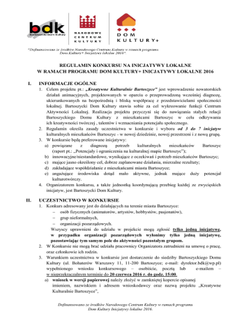 REGULAMIN KONKURSU NA INICJATYWY LOKALNE W RAMACH PROGRAMU DOM KULTURY+ INICJATYWY LOKALNE 2016 I. INFORMACJE OGÓLNE 1. Celem projektu pt.: „Kreatywne Kulturalnie Bartoszyce” jest wprowadzenie nowatorskich działań animacyjnych, projektowanych w oparciu o przeprowadzoną wcześniej diagnozę, ukierunkowanych na bezpośrednią i bliską współpracę z przedstawicielami społeczności lokalnej. Bartoszycki Dom Kultury stawia sobie za cel wykreowanie funkcji Centrum Aktywności Lokalnej. Realizacja projektu przyczyni się do nawiązania stałych relacji Bartoszyckiego Domu Kultury z mieszkańcami Bartoszyc w celu odkrywania ich kreatywności twórczej , talentów i wzmacniania potencjału społecznego. 2. Regulamin określa zasady uczestnictwa w konkursie i wyboru od 3 do 7 inicjatyw kulturalnych mieszkańców Bartoszyc - w nowej dziedzinie, nowej przestrzeni i z nową grupą. 3. W konkursie będą preferowane inicjatywy: a) powiązane z diagnozą potrzeb kulturalnych mieszkańców Bartoszyc (raport pt.: ,,Potencjały i ograniczenia na kulturalnej mapie Bartoszyc”); b) innowacyjne/niestandardowe, wynikające z oczekiwań i potrzeb mieszkańców Bartoszyc; c) mające jasno określony cel, dobrze zaplanowane działania, mierzalne rezultaty; d) zakładające współdziałanie z mieszkańcami miasta Bartoszyce; e) angażujące środowiska dotąd mało aktywne, jednak mające duży potencjał kulturotwórczy. 4. Organizatorem konkursu, a także jednostką koordynującą przebieg każdej ze zwycięskich inicjatyw, jest Bartoszycki Dom Kultury. II. UCZESTNICTWO W KONKURSIE 1. Konkurs adresowany jest do działających na terenie miasta Bartoszyce: osób fizycznych (animatorów, artystów, hobbystów, pasjonatów), grup nieformalnych, organizacji pozarządowych. Wszyscy uprawnieni do udziału w projekcie mogą zgłosić tylko jedną inicjatywę, w przypadku organizacji pozarządowych wyłonimy tylko jedną inicjatywę, pozostawiając tym samym pole do aktywności pozostałym grupom. 2. W Konkursie nie mogą brać udziału pracownicy Organizatora zatrudnieni na umowę o pracę, oraz członkowie ich rodzin. 3. Warunkiem uczestnictwa w konkursie jest dostarczenie do siedziby Bartoszyckiego Domu Kultury (ul. Bohaterów Warszawy 11, 11-200 Bartoszyce; e-mail: [email protected]) wypełnionego wniosku konkursowego – osobiście, pocztą lub e-mailem – w nieprzekraczalnym terminie do 20 czerwca 2016 r. do godz. 15:00. a) wniosek w wersji papierowej należy złożyć w zamkniętej kopercie opisanej imieniem, nazwiskiem i adresem wnioskodawcy oraz nazwą projektu „Kreatywne Kulturalnie Bartoszyce”, Dofinansowano ze środków Narodowego Centrum Kultury w ramach programu Dom Kultury Inicjatywy lokalne 2016. 4. 5. 6. 7. 8. III. b) wniosek w wersji elektronicznej należy przesłać drogą e-mailową wpisując w temacie imię i nazwisko wnioskodawcy oraz nazwę projektu „Kreatywne Kulturalnie Bartoszyce”. Wniosek powinien być wypełniony czytelnie, bez skreśleń i poprawek. Wnioskodawcy, których wnioski nie będę spełniać wszystkich wymagań formalnych mogą zostać wezwani do wniesienia poprawek w terminie 3 dni od złożenia wniosku. Wnioski złożone po ww. terminie nie będą objęte procedurą konkursową. Zgłoszenie projektu do konkursu jest równoznaczne z akceptacją Regulaminu konkursu. Formularz wniosku dostępny jest na stronie Bartoszyckiego Domu Kultury http://www.bdkbartoszyce.pl/ i na Facebooku od 3 czerwca 2016 r. WARUNKI KONKURSU 1. Wnioski zostaną poddane ocenie formalnej w oparciu o następujące kryteria: projekt został złożony w terminie, tj. do dnia 20 czerwca 2016 r. do godz. 15:00, projekt jest napisany zgodnie z formularzem wniosku, jest czytelny i kompletny, projekt będzie realizowany na obszarze miasta Bartoszyce z udziałem mieszkańców miasta, projekt zostanie zrealizowany w okresie od 31 lipca do 21 listopada 2016r. przedstawiony we wniosku budżet nie zawiera błędów rachunkowych, projekt wyklucza prowadzenie działalności komercyjnej, nastawionej na zysk. 2. Wnioski, które spełnią wszystkie powyższe wymagania formalne, zostaną przekazane do oceny merytorycznej Komisji Konkursowej. 3. Komisja oceni i wybierze od 3 do 7 inicjatyw kulturalnych, które zostaną zrealizowane w okresie od 31 lipca do 21 listopada. Wybór zostanie podany do wiadomości publicznej wiadomości (na stronie : http://www.bdkbartoszyce.pl/ i na Facebooku: https://www.facebook.com/bdkbartoszyce) do dnia 28 czerwca 2016 r. 4. Podczas oceny merytorycznej projektów będą brane pod uwagę: zgodność z założeniami konkursu, zgodność z celami statutowymi Bartoszyckiego Domu Kultury, innowacyjność pomysłu i sposobu realizacji projektu, realna możliwość wykonania planowanych działań, możliwość kontynuacji projektu, stopień zaangażowania mieszkańców Bartoszyc w realizację projektu, adekwatny do zaplanowanych działań budżet (racjonalne i efektywne koszty). 5. Decyzje Komisji Konkursowej są nieodwołalne. 6. Ostateczną decyzję o przyznaniu środków finansowych podejmuje Komisja Konkursowa. 7. W przypadku projektów innowacyjnych, ciekawych tematycznie, które nie otrzymają dofinansowania z powodu wyczerpania puli środków finansowych, Dyrektor Bartoszyckiego Domu Kultury może zadeklarować finansowe zabezpieczenie przy realizacji w/w projektów w kolejnym roku artystycznym. IV. FINANSOWANIE INICJATYW 1. Projekty będą finansowane ze środków Narodowego Centrum Kultury w ramach programu Dom Kultury+ Inicjatywy lokalne 2016. 2. Przewidywany łączny budżet wytypowanych inicjatyw : 22 000 zł. Dofinansowano ze środków Narodowego Centrum Kultury w ramach programu Dom Kultury Inicjatywy lokalne 2016. 3. W ramach projektu dofinansowanych zostanie od 3 do 7 inicjatyw. 4. Maksymalna kwota dofinansowania jednej inicjatywy - 3 000 zł brutto. 5. Komisja Konkursu może podjąć decyzję dotyczącą zwiększenia lub zmniejszenia kwoty dofinansowania złożon
