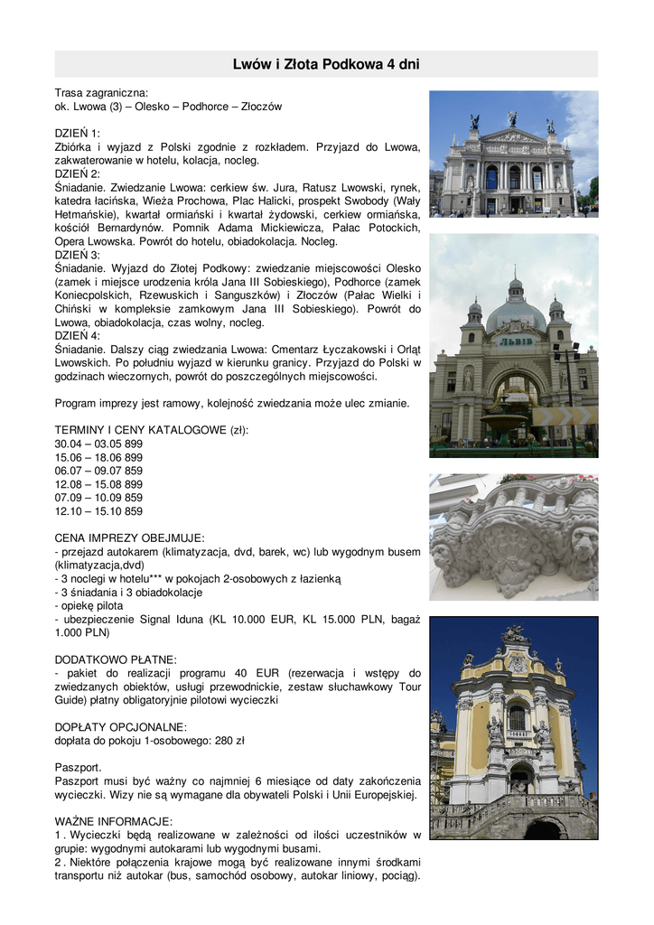 Lwów i Złota Podkowa 4 dni Trasa zagraniczna: ok. Lwowa (3) – Olesko – Podhorce – Złoczów DZIEŃ 1: Zbiórka i wyjazd z Polski zgodnie z rozkładem. Przyjazd do Lwowa, zakwaterowanie w hotelu, kolacja, nocleg. DZIEŃ 2: Śniadanie. Zwiedzanie Lwowa: cerkiew św. Jura, Ratusz Lwowski, rynek, katedra łacińska, Wieża Prochowa, Plac Halicki, prospekt Swobody (Wały Hetmańskie), kwartał ormiański i kwartał żydowski, cerkiew ormiańska, kościół Bernardynów. Pomnik Adama Mickiewicza, Pałac Potockich, Opera Lwowska. Powrót do hotelu, obiadokolacja. Nocleg. DZIEŃ 3: Śniadanie. Wyjazd do Złotej Podkowy: zwiedzanie miejscowości Olesko (zamek i miejsce urodzenia króla Jana III Sobieskiego), Podhorce (zamek Koniecpolskich, Rzewuskich i Sanguszków) i Złoczów (Pałac Wielki i Chiński w kompleksie zamkowym Jana III Sobieskiego). Powrót do Lwowa, obiadokolacja, czas wolny, nocleg. DZIEŃ 4: Śniadanie. Dalszy ciąg zwiedzania Lwowa: Cmentarz Łyczakowski i Orląt Lwowskich. Po południu wyjazd w kierunku granicy. Przyjazd do Polski w godzinach wieczornych, powrót do poszczególnych miejscowości. Program imprezy jest ramowy, kolejność zwiedzania może ulec zmianie. TERMINY I CENY KATALOGOWE (zł): 30.04 – 03.05 899 15.06 – 18.06 899 06.07 – 09.07 859 12.08 – 15.08 899 07.09 – 10.09 859 12.10 – 15.10 859 CENA IMPREZY OBEJMUJE: - przejazd autokarem (klimatyzacja, dvd, barek, wc) lub wygodnym busem (klimatyzacja,dvd) - 3 noclegi w hotelu*** w pokojach 2-osobowych z łazienką - 3 śniadania i 3 obiadokolacje - opiekę pilota - ubezpieczenie Signal Iduna (KL 10.000 EUR, KL 15.000 PLN, bagaż 1.000 PLN) DODATKOWO PŁATNE: - pakiet do realizacji programu 40 EUR (rezerwacja i wstępy do zwiedzanych obiektów, usługi przewodnickie, zestaw słuchawkowy Tour Guide) płatny obligatoryjnie pilotowi wycieczki DOPŁATY OPCJONALNE: dopłata do pokoju 1-osobowego: 280 zł Paszport. Paszport musi być ważny co najmniej 6 miesiące od daty zakończenia wycieczki. Wizy nie są wymagane dla obywateli Polski i Unii Europejskiej. WAŻNE INFORMACJE: 1 . Wycieczki będą realizowane w zależności od ilości uczestników w grupie: wygodnymi autokarami lub wygodnymi busami. 2 . Niektóre połączenia krajowe mogą być realizowane innymi środkami transportu niż autokar (bus, samochód osobowy, autokar liniowy, pociąg). Trasy antenowe obsługiwane są bez pilota. 3. Wyjazd *antenkowy za dopłatą z wybranego miasta organizowany przy minimum 6 os. wsiadających. W przypadku braku wymaganego min. 6 osób PBP OLSZTYN ma prawo anulować wyjazd z danej miejscowości. Anulacja wyjazdu nie upoważnia do bezkosztowej rezygnacji z wycieczki. W takim przypadku Klient wybiera wyjazd z innej miejscowości gwarantowanej. 4 . Podczas przejazdów krajowych w ramach niektórych wycieczek możliwe są przesiadki. 5 . Godziny i miejsca wsiadania mogą ulec zmianie, po wcześniejszym poinformowaniu Klienta. 6 . Pakiet do realizacji programu (rezerwacje i wstępy do zwiedzanych obiektów, usługi przewodnickie, bilety komunikacji miejskiej, opłaty klimatyczne oraz koszty zestawu słuchawkowego Tour Guide lub inne) nie jest ujęty w cenie imprezy wyrażonej w PLN. Cena pakietu do realizacji programu podana jest przy opisach poszczególnych wycieczek. Obligatoryjny koszt pakietu dotyczący realizacji programu jest kalkulowany przy grupie min. 40 osób. Przy mniejszej ilości uczestników cena pakietu zostanie przeliczona na odpowiednią ilość osób w grupie i podana do wiadomości uczestników przed wycieczką. Cena pakietu może być podwyższona maksymalnie o 25% podanej ceny w EUR/GBP/inna waluta. Powyższa zmiana nie upoważnia Klienta do rezygnacji z uczestnictwa w wycieczce. 7 . Osoby podróżujące samotnie, które nie chcą dopłacać do pokoju 1– osobowego, będą dokwaterowane do innej osoby tej samej płci w pokoju 2–osobowym. W przypadku braku drugiej osoby na dokwaterowanie Klient będzie musiał zapłacić połowę stawki dopłaty do pokoju 1 – osobowego. 8 . Kolejność zapisów na wycieczkę decyduje o zajmowaniu miejsc w głównym transporcie.