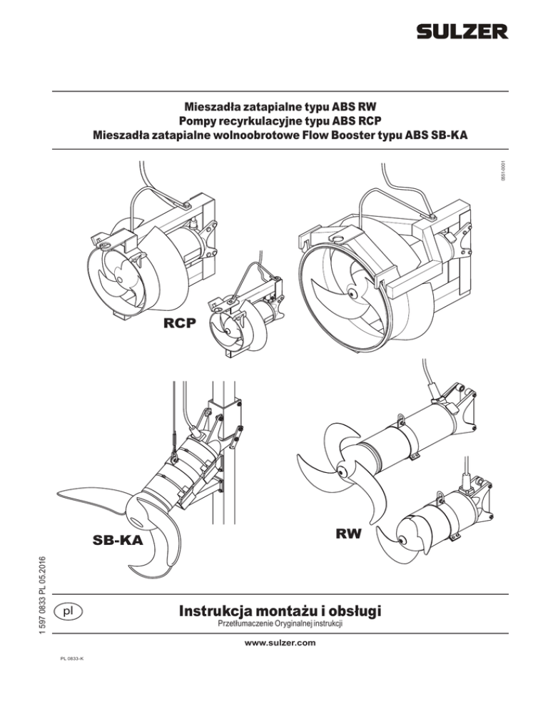 0551-0001 Mieszadła zatapialne typu ABS RW Pompy recyrkulacyjne typu ABS RCP Mieszadła zatapialne wolnoobrotowe Flow Booster typu ABS SB-KA RCP RW 1 597 0833 PL 05.2016 SB-KA pl Instrukcja montażu i obsługi Przetłumaczenie Oryginalnej instrukcji www.sulzer.com PL 0833-K Instrukcja montażu i obsługi RW 300/400/650/900 | RCP 250/400/500/800 | SB 1200 KA Instrukcja montażu i obsługi mieszadeł: Mieszadła zatapialne typu ABS RW, Pompy recyrkulacyjne typu ABS RCP, Mieszadła zatapialne wolnoobrotowe Flow Booster typu ABS SB-KA RW 300 RW 400 RW 650 RW 400 LW RW 550 DM RW 650 LW RCP 250 RCP 400 RCP 500 SB 1236 KA SB 1237 KA RW 900 RCP 800 Zmiany wynikające z postępu technicznego zastrzeżone ! 50 PL 0833-K Instrukcja montażu i obsługi RW 300/400/650/900 | RCP 250/400/500/800 | SB 1200 KA Spis treści 1 Uwagi ogólne........................................................................................................................................ 53 1.1 Wprowadzenie....................................................................................................................................... 53 1.2 Zastosowanie zgodne z przeznaczeniem.............................................................................................. 53 1.3 Granice zastosowania RW/RCP/SB-KA................................................................................................. 53 1.4 Zakres zastosowania ............................................................................................................................ 54 1.4.1 Zakres zastosowania RW...................................................................................................................... 54 1.4.2 Zakresy zastosowania RCP................................................................................................................... 55 1.4.3 Zakres zastosowania SB-KA.................................................................................................................. 55 1.5 Klucz kodu oznaczenia typu urządzenia................................................................................................ 55 1.6 Dane techniczne.................................................................................................................................... 55 1.6.1 Dane techniczne RW 50 Hz................................................................................................................... 56 1.6.2 Dane techniczne RW 60 Hz................................................................................................................... 57 1.6.3 Dane techniczne wersji specjalnych RW............................................................................................... 58 1.6.4 Dane techniczne RCP 50 Hz................................................................................................................. 58 1.6.5 Dane techniczne RCP 60 Hz................................................................................................................. 59 1.6.6 Dane techniczne SB-KA......................................................................................................................... 59 1.7 Wymiary i masa...................................................................................................................................... 60 1.7.1 Wymiary konstrukcyjne RW................................................................................................................... 60 1.7.2 Wymiary konstrukcyjne RCP.................................................................................................................. 61 1.7.3 Kontrola wymiaru konstrukcyjnego kołnierza......................................................................................... 63 1.7.4 Wymiary konstrukcyjne SB-KA............................................................................................................... 63 1.8 Tabliczka znamionowa........................................................................................................................... 64 2 Bezpieczeństwo................................................................................................................................... 65 3 Transport i składowanie...................................................................................................................... 65 3.1Transport................................................................................................................................................ 65 3.2 Zabezpieczenia transportowe................................................................................................................ 65 3.2.1 Izolacja przeciwwilgociowa przewodu zasilającego silnik...................................................................... 65 3.3 Składowanie agregatów......................................................................................................................... 66 4 Opis urządzenia.................................................................................................................................... 66 4.1 Ogólny opis............................................................................................................................................ 66 4.2 Budowa konstrukcyjna RW/SB-KA ........................................................................................................ 67 4.2.1 RW 300/400/650.................................................................................................................................... 67 4.2.2 RW 900/SB-KA....................................................................................................................................... 67 4.3 System przepłukiwania uszczelnienia mechanicznego (opcja).............................................................. 68 4.4 Budowa konstrukcyjna RCP...............................................................................................