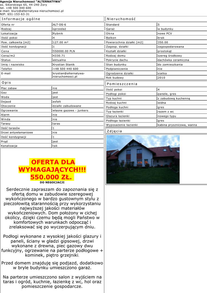 Agencja Nieruchomosci "ALTERNATYWA" os. Sikorskiego 65, 44-240 Żory tel. +48 500 440 600 e-mail: [email protected] NIP: 651-153-63-31 Informacje ogólne Nieruchomość Oferta nr ALT-DS-6 Standard 5 Rodzaj sprzedaż Garaż w budynku Lokalizacja Rybnik Okna nowe PCV Ilość pokoi 4 Balkon brak Pow. całkowita [m2] 127.00 m² Powierzchnia działki [m2] 350.00 Ilość kondygnacji 1 Zagosp. działki zagospodarowana Cena 550000.00 PLN Kształt działki prostokąt Cena/m2 4330.71 Rodzaj domu szereg środkowy Status aktualna Pokrycie dachu dachówka ceramiczna Imię i nazwisko Krystian Stanik Stan budynku do zamieszkania Telefon +48 500 440 600 Podpiwniczenie nie E-mail [email protected] Ogrodzenie działki siatka Rok budowy 2010 Opis Pomieszczenia Plac zabaw nie Ilość pokoi 4 Gaz jest Podłogi pokoi panele, gres Woda jest Typ kuchni z zabudową kuchenną Dojazd asfalt Rodzaj kuchni widna Otoczenie działki zabudowane Podłoga kuchni gres Ogrzewanie własne gazowe - junkers Typ łazienki razem z wc Alarm nie Glazura łazienki nowego typu Winda nie Podłoga łazienki gres Tarasy taras Wyposażenie łazienki kabina prysznicowa, wanna Ilość tarasów 1 Drzwi antywłamaniowe nie Ilość kondygnacji 1 Prąd jest Kanalizacja tak OFERTA DLA WYMAGAJĄCYCH!!! 550.000 ZŁ. DO NEGOCJACJI Serdecznie zapraszam do zapoznania się z ofertą domu w zabudowie szeregowej wykończonego w bardzo gustownym stylu z pieczołowitą starannością przy wykorzystaniu najwyższej jakości materiałów wykończeniowych. Dom położony w cichej okolicy, dzięki czemu będą mogli Państwo w komfortowych warunkach odpocząć i zrelaksować się po wyczerpującym dniu. Podłogi wykonane z wysokiej jakości glazury i paneli, ściany w gładzi gipsowej, drzwi wykonane z drewna, piec gazowy dwu funkcyjny, ogrzewanie na parterze podłogowe + kominek, piętro grzejniki. Przed domem znajduję się podjazd, dodatkowo w bryle budynku umieszczono garaż. Na parterze umieszczono salon z wyjściem na taras i ogród, kuchnie, łazienkę z wc, hol oraz pomieszczenie gospodarcze. Zdjęcia Na Piętrze znajdują się 3 pokoje, łazienka z wc, garderoba oraz hol. Ogród ogrodzony i zagospodarowany. Dom bardzo ładnie wykończony co nadaje mu wyjątkowy charakter i niepowtarzalny klimat. KONIECZNIE UMÓW SIĘ NA DARMOWĄ PREZENTACJĘ, ZDJĘCIA NIE ODDAJĄ W PEŁNI TEGO CO ZOBACZYSZ NA ŻYWO!!! Rozkład pomieszczeń: parter: salon, kuchnia, łazienka z wc, pomieszczenie gospodarcze, hol, wiatrołap, taras, garaż piętro: 3 pokoje, garderoba, łazienka z wc, hol Dodatkowe informacje: rok budowy - 2010, pow. ogólna - 127m2 pow. działki - 350m2 pow. ogrodu - 170m2 pokrycie dachu - dachówka ceramiczna, okna PCV nowy typ, kształt działki - prostokąt, otoczenie - domy jednorodzinne, instalacje w budynku - wodna, gazowa, TV, kanalizacja miejska, 230/380V, instalacja c.o. - gazowa ( piec dwu funkcyjny ), ogrzewanie - podłogowe, grzejniki, kominek, źródło ciepłej wody - piec gazowy, ściany - gładź gipsowa, podłogi - panele, płytki, kuchnia z oknem, dodatkowe wyposażenie - kominek, taras, garaż w bryle budynku, rolety antywłamaniowe. Na wyposażeniu pozostają meble kuchenne wykonane z drewna oraz sprzęt AGD!!! Zapewniamy Państwu przeprowadzenie transakcji od momentu prezentacji do chwili przekazania nieruchomości, oraz pomoc w uzyskaniu najdogodniejszego kredytu hipotecznego. Zapraszamy do odwiedzin naszej strony. www.alternatywa-nieruchomosci.pl Kontakt: Krystian Stanik tel. 500 440 600 [email protected] ( licencja zawodowa nr 21811 ) Nieruchomości "Alternatywa" Os. Sikorskiego 65 ( za sklepem meble Bodzio ) 44-240 Żory www.alternatywa-nieruchomosci.pl Agencja Nieruchomosci "ALTERNATYWA" os. Sikorskiego 65, 44-240 Żory tel. +48 500 440 600 e-mail: [email protected] NIP: 651-153-63-31
