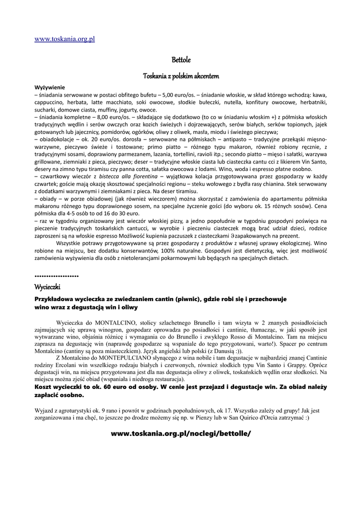 www.toskania.org.pl Bettole Toskania z polskim akcentem Wyżywienie – śniadania serwowane w postaci obfitego bufetu – 5,00 euro/os. – śniadanie włoskie, w skład którego wchodzą: kawa, cappuccino, herbata, latte macchiato, soki owocowe, słodkie bułeczki, nutella, konfitury owocowe, herbatniki, sucharki, domowe ciasta, muffiny, jogurty, owoce. – śniadania kompletne – 8,00 euro/os. – składające się dodatkowo (to co w śniadaniu włoskim +) z półmiska włoskich tradycyjnych wędlin i serów owczych oraz kozich świeżych i dojrzewających, serów białych, serków topionych, jajek gotowanych lub jajecznicy, pomidorów, ogórków, oliwy z oliwek, masła, miodu i świeżego pieczywa; – obiadokolacje – ok. 20 euro/os. dorosła – serwowane na półmiskach – antipasto – tradycyjne przekąski mięsnowarzywne, pieczywo świeże i tostowane; primo piatto – różnego typu makaron, również robiony ręcznie, z tradycyjnymi sosami, doprawiony parmezanem, lazania, tortellini, ravioli itp.; secondo piatto – mięso i sałatki, warzywa grillowane, ziemniaki z pieca, pieczywo; deser – tradycyjne włoskie ciasta lub ciasteczka cantu cci z likierem Vin Santo, desery na zimno typu tiramisu czy panna cotta, sałatka owocowa z lodami. Wino, woda i espresso płatne osobno. – czwartkowy wieczór z bistecca alla fiorentina – wyjątkowa kolacja przygotowywana przez gospodarzy w każdy czwartek; goście mają okazję skosztować specjalności regionu – steku wołowego z bydła rasy chianina. Stek serwowany z dodatkami warzywnymi i ziemniakami z pieca. Na deser tiramisu. – obiady – w porze obiadowej (jak również wieczorem) można skorzystać z zamówienia do apartamentu półmiska makaronu różnego typu doprawionego sosem, na specjalne życzenie gości (do wyboru ok. 15 różnych sosów). Cena półmiska dla 4-5 osób to od 16 do 30 euro. – raz w tygodniu organizowany jest wieczór włoskiej pizzy, a jedno popołudnie w tygodniu gospodyni poświęca na pieczenie tradycyjnych toskańskich cantucci, w wyrobie i pieczeniu ciasteczek mogą brać udział dzieci, rodzice zaproszeni są na włoskie espresso Możliwość kupienia paczuszek z ciasteczkami zapakowanych na prezent. Wszystkie potrawy przygotowywane są przez gospodarzy z produktów z własnej uprawy ekologicznej. Wino robione na miejscu, bez dodatku konserwantów, 100% naturalne. Gospodyni jest dietetyczką, więc jest możliwość zamówienia wyżywienia dla osób z nietolerancjami pokarmowymi lub będących na specjalnych dietach. ................... Wycieczki Przykładowa wycieczka ze zwiedzaniem cantin (piwnic), gdzie robi się i przechowuje wino wraz z degustacją win i oliwy Wycieczka do MONTALCINO, stolicy szlachetnego Brunello i tam wizyta w 2 znanych posiadłościach zajmujących się uprawą winogron, gospodarz oprowadza po posiadłości i cantinie, tłumacząc, w jaki sposób jest wytwarzane wino, objaśnia różnicę i wymagania co do Brunello i zwykłego Rosso di Montalcino. Tam na miejscu zaprasza na degustację win (naprawdę gospodarze są wspaniale do tego przygotowani, warto!). Spacer po centrum Montalcino (cantiny są poza miasteczkiem). Język angielski lub polski (z Danusią :)). Z Montalcino do MONTEPULCIANO słynącego z wina nobile i tam degustacje w najbardziej znanej Cantinie rodziny Ercolani win wszelkiego rodzaju białych i czerwonych, również słodkich typu Vin Santo i Grappy. Oprócz degustacji win, na miejscu przygotowana jest dla nas degustacja oliwy z oliwek, toskańskich wędlin oraz słodkości. Na miejscu można zjeść obiad (wspaniała i niedroga restauracja). Koszt wycieczki to ok. 60 euro od osoby. W cenie jest przejazd i degustacje win. Za obiad należy zapłacić osobno. Wyjazd z agroturystyki ok. 9 rano i powrót w godzinach popołudniowych, ok 17. Wszystko zależy od grupy! Jak jest zorganizowana i ma chęć, to jeszcze po drodze możemy się np. w Pienzy lub w San Quirico d'Orcia zatrzymać :) www.toskania.org.pl/noclegi/bettolle/