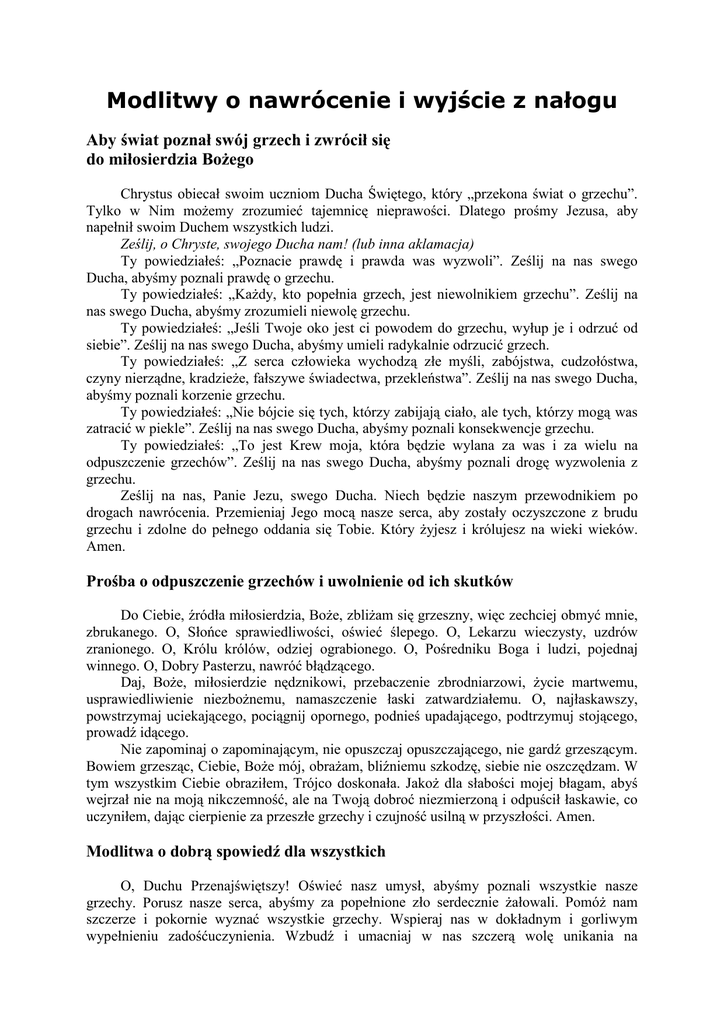 Modlitwy o nawrócenie i wyjście z nałogu Aby świat poznał swój grzech i zwrócił się do miłosierdzia BoŜego Chrystus obiecał swoim uczniom Ducha Świętego, który „przekona świat o grzechu”. Tylko w Nim moŜemy zrozumieć tajemnicę nieprawości. Dlatego prośmy Jezusa, aby napełnił swoim Duchem wszystkich ludzi. Ześlij, o Chryste, swojego Ducha nam! (lub inna aklamacja) Ty powiedziałeś: „Poznacie prawdę i prawda was wyzwoli”. Ześlij na nas swego Ducha, abyśmy poznali prawdę o grzechu. Ty powiedziałeś: „KaŜdy, kto popełnia grzech, jest niewolnikiem grzechu”. Ześlij na nas swego Ducha, abyśmy zrozumieli niewolę grzechu. Ty powiedziałeś: „Jeśli Twoje oko jest ci powodem do grzechu, wyłup je i odrzuć od siebie”. Ześlij na nas swego Ducha, abyśmy umieli radykalnie odrzucić grzech. Ty powiedziałeś: „Z serca człowieka wychodzą złe myśli, zabójstwa, cudzołóstwa, czyny nierządne, kradzieŜe, fałszywe świadectwa, przekleństwa”. Ześlij na nas swego Ducha, abyśmy poznali korzenie grzechu. Ty powiedziałeś: „Nie bójcie się tych, którzy zabijają ciało, ale tych, którzy mogą was zatracić w piekle”. Ześlij na nas swego Ducha, abyśmy poznali konsekwencje grzechu. Ty powiedziałeś: „To jest Krew moja, która będzie wylana za was i za wielu na odpuszczenie grzechów”. Ześlij na nas swego Ducha, abyśmy poznali drogę wyzwolenia z grzechu. Ześlij na nas, Panie Jezu, swego Ducha. Niech będzie naszym przewodnikiem po drogach nawrócenia. Przemieniaj Jego mocą nasze serca, aby zostały oczyszczone z brudu grzechu i zdolne do pełnego oddania się Tobie. Który Ŝyjesz i królujesz na wieki wieków. Amen. Prośba o odpuszczenie grzechów i uwolnienie od ich skutków Do Ciebie, źródła miłosierdzia, BoŜe, zbliŜam się grzeszny, więc zechciej obmyć mnie, zbrukanego. O, Słońce sprawiedliwości, oświeć ślepego. O, Lekarzu wieczysty, uzdrów zranionego. O, Królu królów, odziej ograbionego. O, Pośredniku Boga i ludzi, pojednaj winnego. O, Dobry Pasterzu, nawróć błądzącego. Daj, BoŜe, miłosierdzie nędznikowi, przebaczenie zbrodniarzowi, Ŝycie martwemu, usprawiedliwienie niezboŜnemu, namaszczenie łaski zatwardziałemu. O, najłaskawszy, powstrzymaj uciekającego, pociągnij opornego, podnieś upadającego, podtrzymuj stojącego, prowadź idącego. Nie zapominaj o zapominającym, nie opuszczaj opuszczającego, nie gardź grzeszącym. Bowiem grzesząc, Ciebie, BoŜe mój, obraŜam, bliźniemu szkodzę, siebie nie oszczędzam. W tym wszystkim Ciebie obraziłem, Trójco doskonała. JakoŜ dla słabości mojej błagam, abyś wejrzał nie na moją nikczemność, ale na Twoją dobroć niezmierzoną i odpuścił łaskawie, co uczyniłem, dając cierpienie za przeszłe grzechy i czujność usilną w przyszłości. Amen. Modlitwa o dobrą spowiedź dla wszystkich O, Duchu Przenajświętszy! Oświeć nasz umysł, abyśmy poznali wszystkie nasze grzechy. Porusz nasze serca, abyśmy za popełnione zło serdecznie Ŝałowali. PomóŜ nam szczerze i pokornie wyznać wszystkie grzechy. Wspieraj nas w dokładnym i gorliwym wypełnieniu zadośćuczynienia. Wzbudź i umacniaj w nas szczerą wolę unikania na przyszłość wszystkich grzechów i najbliŜszych do nich okazji. Prowadź nas do zdrojów miłosierdzia, które leczą i uzdrawiają nasze Ŝycie. Niech spotkanie z miłosiernym Ojcem i sakramentalny udział w śmierci i zmartwychwstaniu Jezusa, wyprostuje ścieŜki naszego Ŝycia i umocni nas na drodze do świętości. Amen. Modlitwy o trzeźwość Modlitwa przebłagalna Panie Jezu Chryste, przeniknięci uczuciem najgłębszej czci, pragniemy przepraszać Cię za wszystkie zniewagi i nieuszanowanie Twojej świętej woli zawartej w przykazaniach i świętej Ewangelii. W szczególny sposób pragniemy wynagrodzić Ci za wszystkie grzechy spowodowane naduŜywaniem alkoholu. Stają się one społeczną klęską naszego narodu: Przepraszamy Cię, Panie! (lub inna aklamacja) za grzechy nasze i naszych bliźnich; za zaniedbywanie codziennej modlitwy; za opuszczanie Mszy świętej w niedziele i święta; za zniewaŜanie Twojego Imienia świętego; za czynienie dni świętych dniami szczególnego pijaństwa; za zniewaŜanie sakramentu małŜeństwa; za ból zadawany członkom rodziny alkoholików; za lekcewaŜenie przykazań BoŜych; za pijaństwo młodzieŜy; za częstowanie alkoholem małych dzieci; za zgorszenia spowodowane przez pijanych; za przekleństwa i złorzeczenia wypowiadane po pijanemu; za kradzieŜe i zbrodnie dokonane pod wpływem alkoholu; za wypadki i kalectwa spowodowane przez pijanych kierowców; za niszczenie własnego zdrowia alkoholem; za nieskromne myśli i poŜądania pobudzone alkoholem; za zdrady małŜeńskie spowodowane alkoholem; za marnowanie pieniędzy i innych rzeczy materialnych na alkohol; za tych, którzy nielegalnie produkują i sprzedają alkohol; za obojętność wobec potrzebujących pomocy; za wszelkie grzeszne skutki naduŜywania alkoholu. Pieśń Przed oczy Twoje winy nasze składamy albo Święty BoŜe albo Przepuść Panie, przepuść ludowi Twojemu. Wezwania błagalne Polecamy Ci, Panie Jezu Chryste, wszystkich zagroŜonych plagą pijaństwa. Zawierzamy Ci poszczególne osoby i ich rodziny, a takŜe ustanawiających prawa i czuwających nad porządkiem publicznym. PomóŜ wszystkim przeciwstawić się fali zła, jaka rozlewa się przez naduŜywanie alkoholu: OkaŜ nam, Panie, swoje miłosierdzie! (lub inna aklamacja) aby kierujący narodem dostrzegli grozę klęski pijaństwa; aby nasz naród wypełnił Śluby Jasnogórskie; aby wszyscy podjęli wysiłek przeciwdziałania alkoholizmowi; aby rodzice wychowywali swoje dzieci w trzeźwości; aby wykorzenione zostały poniŜające zwyczaje pijackie; aby jak najwięcej Polaków z miłości do bliźnich wyrzekło się uŜywania alkoholu; aby rozwijały się wspólnoty trzeźwościowe w naszych parafiach; abyśmy przez Ŝycie wstr
