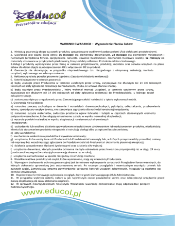 WARUNKI GWARANCJI – Wyposażenie Placów Zabaw 1. Niniejszą gwarancją objęte są usterki produktu spowodowane wadliwymi podzespołami i/lub defektami produkcyjnymi. 2. Gwarancja jest ważna przez okres: 36 miesięcy dla elementów drewnianych, 24 miesiące dla elementów metalowych i ruchomych (urządzenia fitness, sprężynowce, karuzele, zawiesie huśtawkowe, mechanizm huśtawek ważek), 12 miesięcy na materiały stosowane w przykryciach piaskownicy, licząc od daty odbioru z Protokołu odbioru końcowego. 3.Usługi i produkty wykonywane przez firmę w zakresie projektowania, produkcji, montażu oraz serwisu urządzeń na place zabaw dla dzieci objęte są ubezpieczeniem OC z włączeniem OC za produkt. 4. Gwarancja nie obowiązuje, w przypadku nieprawidłowego tzn. niezgodnego z otrzymaną instrukcją montażu urządzeń, wykonanego we własnym zakresie. 5. Reklamację należy przesłać pisemnie (zgodnie z Zasadami składania reklamacji) 6. Usterki ujawnione w okresie gwarancji: a) będą usunięte przez Producenta w terminie ustalonym przez strony, zwyczajowo nie dłuższym niż 14 dni roboczych liczonych od daty zgłoszenia reklamacji do Producenta, chyba, że umowa stanowi inaczej. b) będą usunięte przez Przedstawiciela , który wykonał montaż urządzeń, w terminie ustalonym przez strony, zwyczajowo nie dłuższym niż 14 dni roboczych od daty zgłoszenia reklamacji do Przedstawiciela, u którego został zakupiony sprzęt. c) zostaną usunięte po uregulowaniu przez Zamawiającego całości należności z tytułu wykonanych robót. 7. Gwarancją nie są objęte: a) naturalne procesy zachodzące w drewnie i materiałach drewnopochodnych, pęknięcia, odkształcenia, przebarwienia koloru, sporadyczny wypływ żywicy, nie stanowiące zagrożenia dla nośności konstrukcji urządzenia; b) naturalne zużycia materiałów, zwłaszcza przetarcia ogniw łańcucha i tulejek w częściach stanowiących elementy połączeniowe/ruchome, które ulegają naturalnemu zużyciu w wyniku normalnej eksploatacji; c) wytarcie powłoki malarskiej w wyniku eksploatacji na elementach drewnianych i metalowych; d) uszkodzenia lub wadliwe działanie spowodowane niewłaściwym użytkowaniem lub nadużywaniem produktu, niedbałością klienta lub stosowaniem produktu niezgodnie z instrukcją obsługi albo przepisami bezpieczeństwa; e) akty wandalizmu; f) mechaniczne uszkodzenia produktów i wywołane nimi wady; g) urządzenia, które osoby inne niż Producent lub Przedstawiciel naruszyły lub, w których przeprowadziły przeróbki, zmiany lub naprawy bez wcześniejszego zgłoszenia do Przedstawiciela lub Producenta i otrzymania pisemnej akceptacji; h) działania spowodowane klęskami żywiołowymi oraz działania siły wyższej; i) urządzenia drewniane, których powłoka ochronna nie była odnawiana przez Inwestora przynajmniej raz w ciągu 24 m-cy (producenci impregnatów zalecają konserwację drewna raz w roku); j) urządzenia zamontowane w sposób niezgodny z instrukcją montażu; 8. Wszelkie wadliwe produkty lub części, które wymieniono, stają się własnością Producenta. 9. Wymogiem dochowania ochrony gwarancyjnej jest terminowe wykonywanie corocznych Przeglądów Konserwacyjnych, do których dokonania uprawniony jest autoryzowany serwis. Po rocznym przeglądzie i ewentualnym usunięciu usterek lub zużytych części, Zamawiający otrzyma potwierdzenie corocznej kontroli urządzeń zabawowych. Przeglądy są odpłatne wg cennika serwisowego. 10. Dopilnowanie terminowego wykonania przeglądu leży w gestii Zamawiającego i/lub Administratora. 11. W przypadku wykrycia usterki, należy w jak najkrótszym czasie powiadomić serwis oraz zabezpieczyć urządzenie przed dalszą eksploatacją do czasu dokonania naprawy. 12. W sprawach nieuregulowanych niniejszymi Warunkami Gwarancji zastosowanie mają odpowiednie przepisy Kodeksu Cywilnego.