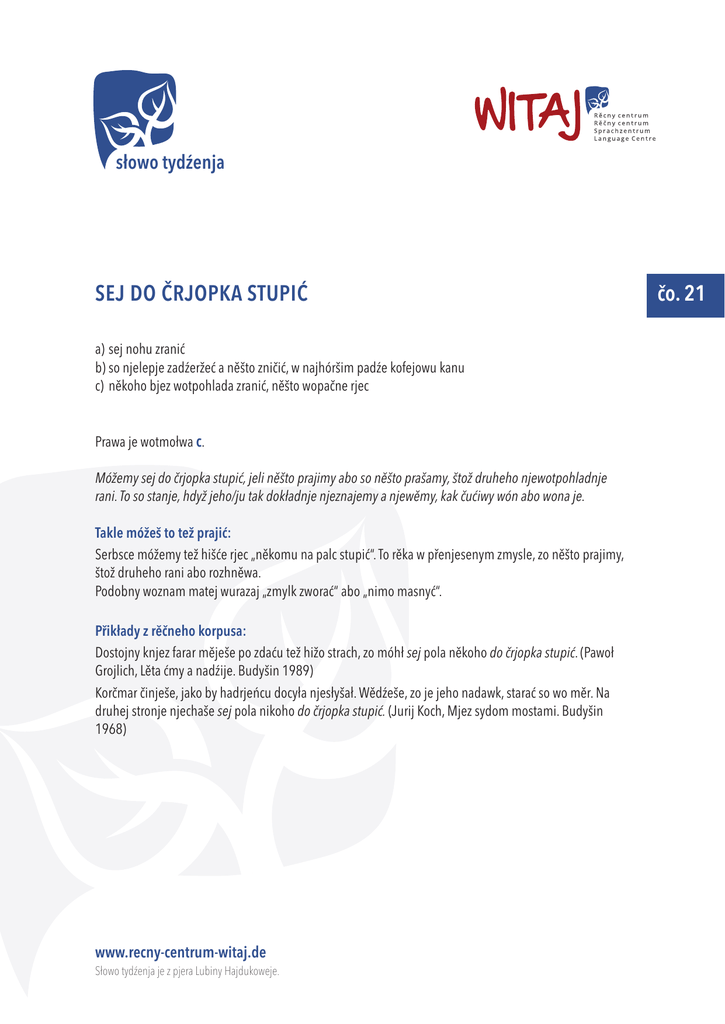 słowo tydźenja SEJ DO ČRJOPKA STUPIĆ a) sej nohu zranić b) so njelepje zadźeržeć a něšto zničić, w najhóršim padźe kofejowu kanu c) někoho bjez wotpohlada zranić, něšto wopačne rjec Prawa je wotmołwa c. Móžemy sej do črjopka stupić, jeli něšto prajimy abo so něšto prašamy, štož druheho njewotpohladnje rani. To so stanje, hdyž jeho/ju tak dokładnje njeznajemy a njewěmy, kak čućiwy wón abo wona je. Takle móžeš to tež prajić: Serbsce móžemy tež hišće rjec „někomu na palc stupić“. To rěka w přenjesenym zmysle, zo něšto prajimy, štož druheho rani abo rozhněwa. Podobny woznam matej wurazaj „zmylk zworać“ abo „nimo masnyć“. Přikłady z rěčneho korpusa: Dostojny knjez farar měješe po zdaću tež hižo strach, zo móhł sej pola někoho do črjopka stupić. (Pawoł Grojlich, Lěta ćmy a nadźije. Budyšin 1989) Korčmar činješe, jako by hadrjeńcu docyła njesłyšał. Wědźeše, zo je jeho nadawk, starać so wo měr. Na druhej stronje njechaše sej pola nikoho do črjopka stupić. (Jurij Koch, Mjez sydom mostami. Budyšin 1968) www.recny-centrum-witaj.de Słowo tydźenja je z pjera Lubiny Hajdukoweje. čo. 21