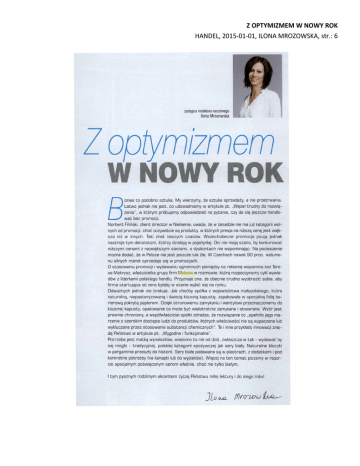 Z OPTYMIZMEM W NOWY ROK HANDEL, 2015-01-01, ILONA MROZOWSKA, str.: 6 zastępca redaktora naczelnego Ilona Mrozowska Z optymizmem W NOWYROK iznes to podobno sztuka. My wierzymy, że sztuka sprzedaży, a nie przetrwania. jednak nie jest , co udowadniamy w artykule pt ...Węzeł trudny do rozwią zania ", w którym próbujemy odpowiedzieć na pytanie , czy da się jeszcze handlować bez promocji. Norbert Filiński , client director w Nielsenie , uważa, że w zasadzie nie ma już kategorii wolnych od promocji, choć oczywiście są produkty, w których presja na niższą cenę jest więk sza niż w innych. Taki znak naszych czasów. Wszechobecne promocje psują jednak nastroje tym detalistom , którzy działają w pojedynkę . Dni nie mają szans , by konkurować niższymi cenami z największymi sieciami , o dyskontach nie wspominając. Na pocieszenie można dodać, że w Polsce nie jest jeszcze tak źle . W Czechach nawet 90 proc. wolumenu silnych marek sprzedaje się w promocjach. O stosowaniu promocji i wydawaniu ogromnych pieniędzy na reklamę wspomina też Terasa Mokrysz, właścicielka grupy firm Mokate w rozmowie , którą rozpoczynamy cykl wywiadów z liderkami polskiego handlu. Przyznaje ona , że obecnie trudno wyobrazić sobie, aby firma startująca od zera byłaby w stanie wybić się na rynku . Odważnych jednak nie brakuje. Jak choćby spółka z województwa małopolskiego, która naturalną, niepasteryzowaną i świeżą kiszoną kapustę , zapakowała w specjalną folię barierową pokrytą papierem. Dzięki strunowemu zamykaniu i wentylowi przeznaczonemu do kiszonej kapusty, opakowanie to może być wielokrotnie zamykane i otwierane. Wzór jest prawnie chroniony, a współwłaściciel spółki zdradza , że rozwiązanie to .. spełniło jego marzenie o szerokim dostęp i e ludzi do produktów, których właściwości nie są wypaczane lub wykluczane przez stosowanie substancji chemicznych ". Te i inne przykłady innowacji znajdą Państwo w artykule pt ...Wygodne i funkcjonalne ". Potrzeba jest matką wynalazków, wiadomo to nie od dziś , zwłaszcza w tak - wydawać by się mogło - tradycyjnej, polskiej kategorii spożywczej jak sery biały. Naturalne bloczki w pergaminie przeszły do historii. Sery białe podawane są w plastrach , z dodatkami i pod konkretne potrzeby [na kanapki lub do wypieków). Więcej na ten temat piszemy w raporcie specjalnym poświęconym serom właśnie, choć nie tylko białym . B Łatwo l tym pysznym rodzimym akcentem życzę Państwu miłej lektury i do siego roku! ]Lo~ (fJro"Ww fLvo.--