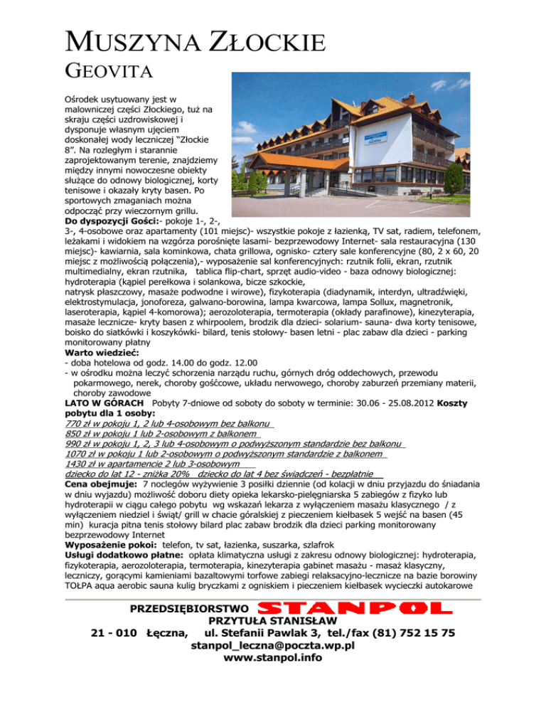 MUSZYNA ZŁOCKIE GEOVITA Ośrodek usytuowany jest w malowniczej części Złockiego, tuż na skraju części uzdrowiskowej i dysponuje własnym ujęciem doskonałej wody leczniczej “Złockie 8”. Na rozległym i starannie zaprojektowanym terenie, znajdziemy między innymi nowoczesne obiekty służące do odnowy biologicznej, korty tenisowe i okazały kryty basen. Po sportowych zmaganiach można odpocząć przy wieczornym grillu. Do dyspozycji Gości:- pokoje 1-, 2-, 3-, 4-osobowe oraz apartamenty (101 miejsc)- wszystkie pokoje z łazienką, TV sat, radiem, telefonem, leżakami i widokiem na wzgórza porośnięte lasami- bezprzewodowy Internet- sala restauracyjna (130 miejsc)- kawiarnia, sala kominkowa, chata grillowa, ognisko- cztery sale konferencyjne (80, 2 x 60, 20 miejsc z możliwością połączenia),- wyposażenie sal konferencyjnych: rzutnik folii, ekran, rzutnik multimedialny, ekran rzutnika, tablica flip-chart, sprzęt audio-video - baza odnowy biologicznej: hydroterapia (kąpiel perełkowa i solankowa, bicze szkockie, natrysk płaszczowy, masaże podwodne i wirowe), fizykoterapia (diadynamik, interdyn, ultradźwięki, elektrostymulacja, jonoforeza, galwano-borowina, lampa kwarcowa, lampa Sollux, magnetronik, laseroterapia, kąpiel 4-komorowa); aerozoloterapia, termoterapia (okłady parafinowe), kinezyterapia, masaże lecznicze- kryty basen z whirpoolem, brodzik dla dzieci- solarium- sauna- dwa korty tenisowe, boisko do siatkówki i koszykówki- bilard, tenis stołowy- basen letni - plac zabaw dla dzieci - parking monitorowany płatny Warto wiedzieć: - doba hotelowa od godz. 14.00 do godz. 12.00 - w ośrodku można leczyć schorzenia narządu ruchu, górnych dróg oddechowych, przewodu pokarmowego, nerek, choroby gośćcowe, układu nerwowego, choroby zaburzeń przemiany materii, choroby zawodowe LATO W GÓRACH Pobyty 7-dniowe od soboty do soboty w terminie: 30.06 - 25.08.2012 Koszty pobytu dla 1 osoby: 770 zł w pokoju 1, 2 lub 4-osobowym bez balkonu 850 zł w pokoju 1 lub 2-osobowym z balkonem 990 zł w pokoju 1, 2, 3 lub 4-osobowym o podwyższonym standardzie bez balkonu 1070 zł w pokoju 1 lub 2-osobowym o podwyższonym standardzie z balkonem 1430 zł w apartamencie 2 lub 3-osobowym dziecko do lat 12 - zniżka 20% dziecko do lat 4 bez świadczeń - bezpłatnie Cena obejmuje: 7 noclegów wyżywienie 3 posiłki dziennie (od kolacji w dniu przyjazdu do śniadania w dniu wyjazdu) możliwość doboru diety opieka lekarsko-pielęgniarska 5 zabiegów z fizyko lub hydroterapii w ciągu całego pobytu wg wskazań lekarza z wyłączeniem masażu klasycznego / z wyłączeniem niedziel i świąt/ grill w chacie góralskiej z pieczeniem kiełbasek 5 wejść na basen (45 min) kuracja pitna tenis stołowy bilard plac zabaw brodzik dla dzieci parking monitorowany bezprzewodowy Internet Wyposażenie pokoi: telefon, tv sat, łazienka, suszarka, szlafrok Usługi dodatkowo płatne: opłata klimatyczna usługi z zakresu odnowy biologicznej: hydroterapia, fizykoterapia, aerozoloterapia, termoterapia, kinezyterapia gabinet masażu - masaż klasyczny, leczniczy, gorącymi kamieniami bazaltowymi torfowe zabiegi relaksacyjno-lecznicze na bazie borowiny TOŁPA aqua aerobic sauna kulig bryczkami z ogniskiem i pieczeniem kiełbasek wycieczki autokarowe PRZEDSIĘBIORSTWO PRZYTUŁA STANISŁAW 21 - 010 Łęczna, ul. Stefanii Pawlak 3, tel./fax (81) 752 15 75 [email protected] www.stanpol.info