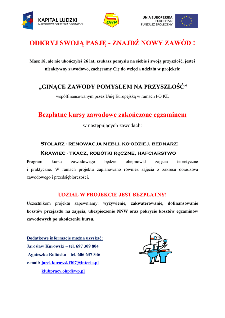 ODKRYJ SWOJĄ PASJĘ - ZNAJDŹ NOWY ZAWÓD ! Masz 18, ale nie ukończyłeś 26 lat, szukasz pomysłu na siebie i swoją przyszłość, jesteś nieaktywny zawodowo, zachęcamy Cię do wzięcia udziału w projekcie „GINĄCE ZAWODY POMYSŁEM NA PRZYSZŁOŚĆ” współfinansowanym przez Unię Europejską w ramach PO KL Bezpłatne kursy zawodowe zakończone egzaminem w następujących zawodach: Stolarz - renowacja mebli, kołodziej, bednarz; Krawiec - tkacz, robótki ręczne, hafciarstwo Program kursu zawodowego będzie obejmował zajęcia teoretyczne i praktyczne. W ramach projektu zaplanowano również zajęcia z zakresu doradztwa zawodowego i przedsiębiorczości. UDZIAŁ W PROJEKCIE JEST BEZPŁATNY! Uczestnikom projektu zapewniamy: wyżywienie, zakwaterowanie, dofinansowanie kosztów przejazdu na zajęcia, ubezpieczenie NNW oraz pokrycie kosztów egzaminów zawodowych po ukończeniu kursu. Dodatkowe informacje można uzyskać: Jarosław Kurowski – tel. 697 309 804 Agnieszka Rolińska – tel. 606 637 346 e-mail: [email protected] [email protected]