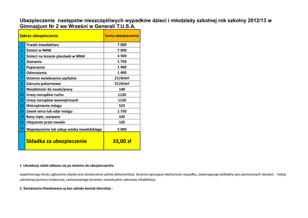 Ubezpieczenie następstw nieszczęśliwych wypadków dzieci i młodzieży szkolnej rok szkolny 2012/13 w Gimnazjum Nr 2 we Wrześni w Generali T.U.S.A. Zakres ubezpieczenia 1 2 3 4 5 6 7 8 9 10 11 12 13 14 15 Suma ubezpieczenia 7 000 7 000 3 500 1 750 1 400 1 400 21/dzień 21/dzień 140 1120 1120 525 1 750 105 105 Trwałe Inwalidztwo Śmierć w NNW Śmierć na terenie placówki w NNW Złamania Poparzenia Odmrożenia Dzienne świadczenia szpitalne Zatrucia pokarmowe Niezdolność do nauki/pracy Urazy narządów ruchu Urazy narządów wewnętrznych Wstrząśnienie mózgu Zawał serca lub udar mózgu Rany cięte, szarpane Ukąszenie przez owada 16 Wypożyczenie lub zakup wózka inwalidzkiego Składka za ubezpieczenie 5 000 33,00 zł 1. Likwidacja szkód odbywa się po złożeniu do ubezpieczyciela: wypełnionego druku zgłoszenia szkody oraz dostarczeniu pełnej dokumentacji leczenia opisującej okoliczności wypadku, zawierającego dokładny opis poniesionych obrażeń, rodzaj udzielonej pomocy medycznej, zastosowanego leczenia i ewentualnie zaleconej rehabilitacji, 2. Świadczenia likwidowane są bez udziału komisji lekarskiej : Ubezpieczenie następstw nieszczęśliwych wypadków dzieci i młodzieży szkolnej rok szkolny 2012/13 w Gimnazjum Nr 2 we Wrześni w Generali T.U.S.A. wypłata świadczenia następuje za zaistniałe zdarzenia określone w ogólnych warunkach ubezpieczenia - roszczenia można składać nie czekając do zakończenia procesu leczenia powypadkowego ( z wyłączeniem sytuacji, w których wartość wypłacanego świadczenia zależy np. od liczby dni pobytu w szpitalu), 3. Zgłaszanie szkód: a) telefonicznie po numerami: 22 543 05 43 lub 801 343 343. b) listownie wysyłać dokumenty na adres : Generali T.U. S.A. ul. Postępu 15B , 02-676 Warszawa. c) pocztą e-mail : [email protected], d) internetowo na stronie: www.generali.pl, Ogólne warunki ubezpieczenia znajdują się do wglądu w sekretariacie szkoły i na stronie internetowej szkoły. Druki zgłoszenia szkód NNW można pobrać ze strony internetowej : www.generali.pl, są również na stronie internetowej szkoły lub w sekretariacie szkoły. Zgodnie z ogólnymi warunkami ubezpieczeń osoby uprawiające sport wyczynowy w pozaszkolnych klubach sportowych powinny zawrzeć dodatkowe ubezpieczenie obejmujące to ryzyko. Osoby zainteresowane wyższą sumą ubezpieczenia mogą się ubezpieczyć indywidualnie u przedstawiciela Generali T.U.S.A. pod numerem tel. 534 025 646