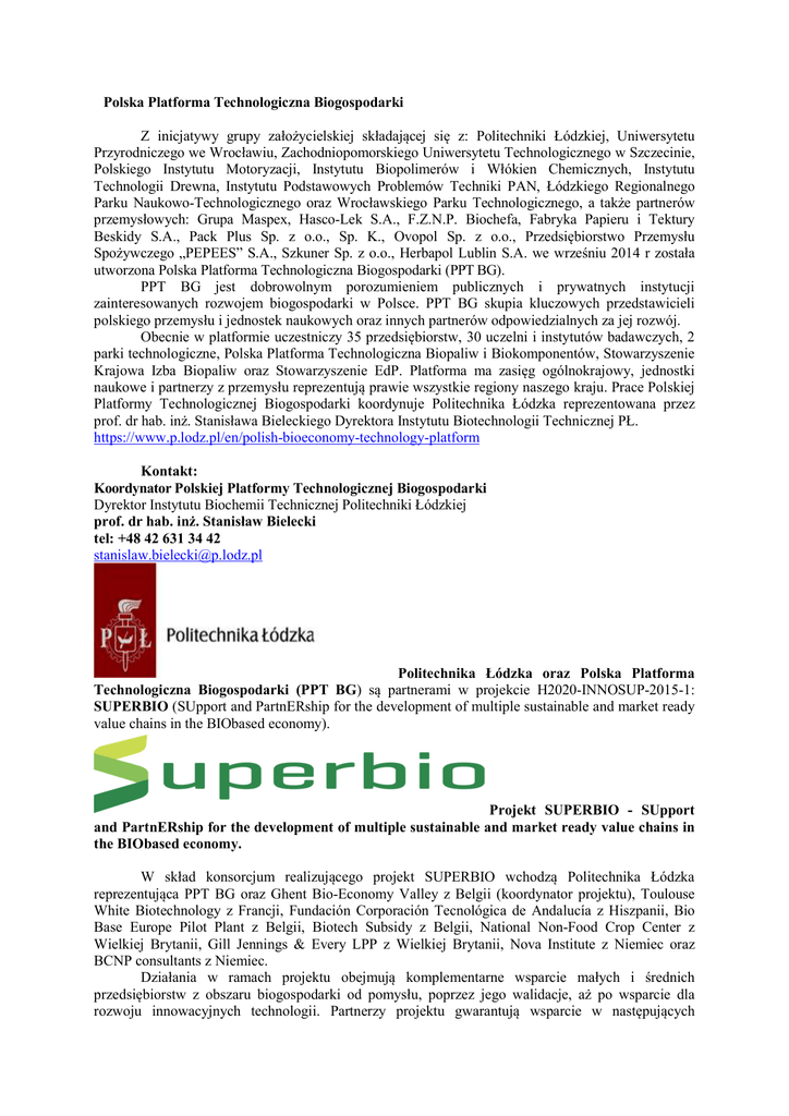 Polska Platforma Technologiczna Biogospodarki Z inicjatywy grupy założycielskiej składającej się z: Politechniki Łódzkiej, Uniwersytetu Przyrodniczego we Wrocławiu, Zachodniopomorskiego Uniwersytetu Technologicznego w Szczecinie, Polskiego Instytutu Motoryzacji, Instytutu Biopolimerów i Włókien Chemicznych, Instytutu Technologii Drewna, Instytutu Podstawowych Problemów Techniki PAN, Łódzkiego Regionalnego Parku Naukowo-Technologicznego oraz Wrocławskiego Parku Technologicznego, a także partnerów przemysłowych: Grupa Maspex, Hasco-Lek S.A., F.Z.N.P. Biochefa, Fabryka Papieru i Tektury Beskidy S.A., Pack Plus Sp. z o.o., Sp. K., Ovopol Sp. z o.o., Przedsiębiorstwo Przemysłu Spożywczego „PEPEES” S.A., Szkuner Sp. z o.o., Herbapol Lublin S.A. we wrześniu 2014 r została utworzona Polska Platforma Technologiczna Biogospodarki (PPT BG). PPT BG jest dobrowolnym porozumieniem publicznych i prywatnych instytucji zainteresowanych rozwojem biogospodarki w Polsce. PPT BG skupia kluczowych przedstawicieli polskiego przemysłu i jednostek naukowych oraz innych partnerów odpowiedzialnych za jej rozwój. Obecnie w platformie uczestniczy 35 przedsiębiorstw, 30 uczelni i instytutów badawczych, 2 parki technologiczne, Polska Platforma Technologiczna Biopaliw i Biokomponentów, Stowarzyszenie Krajowa Izba Biopaliw oraz Stowarzyszenie EdP. Platforma ma zasięg ogólnokrajowy, jednostki naukowe i partnerzy z przemysłu reprezentują prawie wszystkie regiony naszego kraju. Prace Polskiej Platformy Technologicznej Biogospodarki koordynuje Politechnika Łódzka reprezentowana przez prof. dr hab. inż. Stanisława Bieleckiego Dyrektora Instytutu Biotechnologii Technicznej PŁ. https://www.p.lodz.pl/en/polish-bioeconomy-technology-platform Kontakt: Koordynator Polskiej Platformy Technologicznej Biogospodarki Dyrektor Instytutu Biochemii Technicznej Politechniki Łódzkiej prof. dr hab. inż. Stanisław Bielecki tel: +48 42 631 34 42 [email protected] Politechnika Łódzka oraz Polska Platforma Technologiczna Biogospodarki (PPT BG) są partnerami w projekcie H2020-INNOSUP-2015-1: SUPERBIO (SUpport and PartnERship for the development of multiple sustainable and market ready value chains in the BIObased economy). Projekt SUPERBIO - SUpport and PartnERship for the development of multiple sustainable and market ready value chains in the BIObased economy. W skład konsorcjum realizującego projekt SUPERBIO wchodzą Politechnika Łódzka reprezentująca PPT BG oraz Ghent Bio-Economy Valley z Belgii (koordynator projektu), Toulouse White Biotechnology z Francji, Fundación Corporación Tecnológica de Andalucía z Hiszpanii, Bio Base Europe Pilot Plant z Belgii, Biotech Subsidy z Belgii, National Non-Food Crop Center z Wielkiej Brytanii, Gill Jennings & Every LPP z Wielkiej Brytanii, Nova Institute z Niemiec oraz BCNP consultants z Niemiec. Działania w ramach projektu obejmują komplementarne wsparcie małych i średnich przedsiębiorstw z obszaru biogospodarki od pomysłu, poprzez jego walidacje, aż po wsparcie dla rozwoju innowacyjnych technologii. Partnerzy projektu gwarantują wsparcie w następujących obszarach: zwiększanie skali procesów oraz testowanie założeń koncepcyjnych projektów, analizy dostępności surowców, oceny cyklu życia produktu (LCA), analizy techniczno-ekonomicznej, badań rynkowych, przygotowania biznes planów, poszukiwania inwestorów, ochrony patentowej oraz IP. W ramach projektu wsparcie uzyska co najmniej 30 MŚP. W projekcie mogą również uczestniczyć MŚP, którzy realizują zlecenia dużych podmiotów gospodarczych. Całkowita kwota przeznaczona na wsparcie MŚP wynosi 1 800 000 €. MŚP działający w obszarze biogospodarki mogą ubiegać się o bon na innowacyjność o maksymalnej wartości 60 000 €. Kontakt: Koordynator projektu SuperBIO Dr. ir. Stefan Ruyters Ghent Bio-Economy Valley [email protected] Rodenhuizekaai 1 - 9040 Gent (Belgium) Tel.: +32 (0)9 335 70 01 http://www.h2020-superbio.eu/