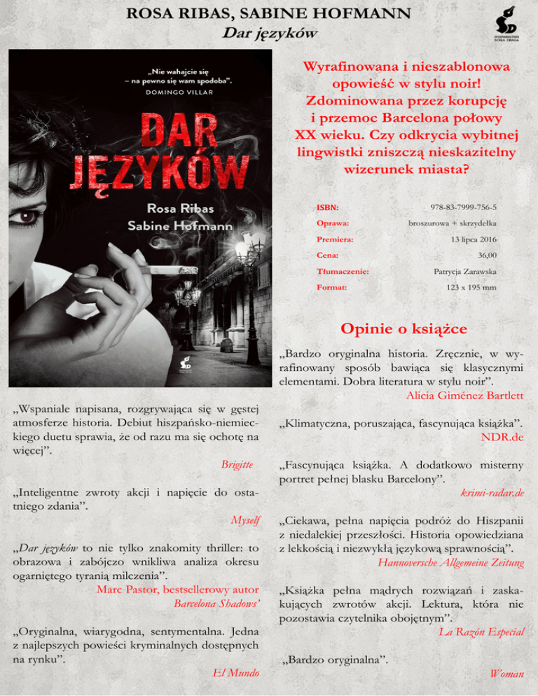 ROSA RIBAS, SABINE HOFMANN Dar języków Wyrafinowana i nieszablonowa opowieść w stylu noir! Zdominowana przez korupcję i przemoc Barcelona połowy XX wieku. Czy odkrycia wybitnej lingwistki zniszczą nieskazitelny wizerunek miasta? ISBN: 978-83-7999-756-5 Oprawa: Premiera: broszurowa + skrzydełka 13 lipca 2016 Cena: 36,00 Tłumaczenie: Format: Patrycja Zarawska 123 x 195 mm Opinie o książce „Bardzo oryginalna historia. Zręcznie, w wyrafinowany sposób bawiąca się klasycznymi elementami. Dobra literatura w stylu noir”. Alicia Giménez Bartlett „Wspaniale napisana, rozgrywająca się w gęstej atmosferze historia. Debiut hiszpańsko-niemieckiego duetu sprawia, że od razu ma się ochotę na więcej”. Brigitte „Inteligentne zwroty akcji i napięcie do ostatniego zdania”. Myself „Dar języków to nie tylko znakomity thriller: to obrazowa i zabójczo wnikliwa analiza okresu ogarniętego tyranią milczenia”. Marc Pastor, bestsellerowy autor Barcelona Shadows’ „Oryginalna, wiarygodna, sentymentalna. Jedna z najlepszych powieści kryminalnych dostępnych na rynku”. El Mundo „Klimatyczna, poruszająca, fascynująca książka”. NDR.de „Fascynująca książka. A dodatkowo misterny portret pełnej blasku Barcelony”. krimi-radar.de „Ciekawa, pełna napięcia podróż do Hiszpanii z niedalekiej przeszłości. Historia opowiedziana z lekkością i niezwykłą językową sprawnością”. Hannoversche Allgemeine Zeitung „Książka pełna mądrych rozwiązań i zaskakujących zwrotów akcji. Lektura, która nie pozostawia czytelnika obojętnym”. La Razón Especial „Bardzo oryginalna”. Woman Rosa Ribas Urodziła się w 1963 roku w Prat de Llobregat (obecnie w granicach obszaru metropolitalnego Barcelony). Studiowała filologię hiszpańską na Uniwersytecie Barcelońskim, a od 1991 roku mieszka w Niemczech, we Frankfurcie nad Menem. Jest autorką powieści historycznych i detektywistycznych. Razem z Sabine Hofmann napisała Dar języków i El Gran Frío. Sabine Hofmann Urodziła się w 1964 roku w Bochum, w Niemczech, a obecnie mieszka w małym miasteczku Michelstadt. Studiowała filologię romańską i germańską; przez kilka lat była docentem na Uniwersytecie J.W. Goethego we Frankfurcie nad Menem. Tam poznała Rosę Ribas i rozpoczęła się ich długa przyjaźń, która zaowocowała wspólnym pisaniem. O książce Barcelona, rok 1952 Trwają przygotowania do Kongresu Eucharystycznego, organizowanego przez Barcelonę. Zgodnie z odgórnym nakazem wizerunek miasta ma być nieskazitelny. Tymczasem Ana Martí, dziennikarka odpowiadająca jak dotąd za kronikę towarzyską dziennika „La Vangardia”, dostaje zupełnie nowe, bardzo odpowiedzialne zadanie. Ma relacjonować sprawę zabójstwa Mariony Sobrerocca, wdowy znanej w kręgach barcelońskiej burżuazji. Znajdując coraz to nowe tropy, Ana oddala się od oficjalnej wersji wydarzeń. W końcu decyduje się poprosić o pomoc swoją kuzynkę Beatriz Noguer, wybitną lingwistkę. Początkowo zwykła porada językoznawcza prowadzi do szeregu odkryć. Okazuje się, że w sprawę zamieszane są najbardziej wpływowe osobistości barcelońskiej socjety… Odwaga i inteligencja Any oraz wiedza i umiejętności Beatriz będą ich jedyną bronią w starciu z wrogim środowiskiem, zdominowanym przez korupcję i przemoc. Tylko czy to wystarczy, by rozwikłać zagadkę zabójstwa? „Ekscytujący, oryginalny i skłaniający do refleksji thriller, w którym obrazowo odmalowano okropności życia w Barcelonie, a w rzeczywistości i całej Hiszpanii, w latach panowania faszystów”. The Literary Review „Niespodzianka roku”. 20 minutos „Jeśli szukacie dobrej powieści kryminalnej, pozwólcie, że polecę wam Dar języków Rosy Ribas i Sabine Hofmann, który moim zdaniem, jest książką, łączącą dwie główne właściwości, jakich zawsze szukamy w powieściach mających być częścią wymagającej kolekcji Siruela Policiaca, a przy tym przewyższającą je: jest tu ekskluzywna literacka fikcja, perfekcyjna i wciągająca fabuła oraz spora dawka oryginalności”. Elena Garcia-Aranda, redaktor Siruela Ediciones „Nie wahajcie się – na pewno się wam spodoba”. Domingo Villar Sonia Draga Sp. z o.o., Pl. Grunwaldzki 8-10, 40-127 Katowice, Tel.: 32 7826477, 7826037, Fax: 032 2537728 Dział handlowy: Danuta Czarnowska, 693420384, [email protected] Promocja: Agnieszka Jedlińska, 695672067, [email protected] Redakcja: [email protected]
