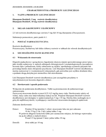 ZD/4448/09; ZD/4449/09 z 25.08.2009 CHARAKTERYSTYKA PRODUKTU LECZNICZEGO 1. NAZWA PRODUKTU LECZNICZEGO Diazepam Desitin®, 5 mg roztwór doodbytniczy Diazepam Desitin®, 10 mg roztwór doodbytniczy 2. SKŁAD JAKOŚCIOWY I ILOŚCIOWY 2,5 ml roztworu doodbytniczego zawiera 5 mg lub 10 mg diazepamu (Diazepamum). Substancje pomocnicze, patrz punkt 6.1. 3. POSTAĆ FARMACEUTYCZNA Roztwór doodbytniczy Przezroczysty, bezbarwny lub lekko żółtawy roztwór w tubkach do wlewek doodbytniczych 4. SZCZEGÓŁOWE DANE KLINICZNE 4.1 Wskazania do stosowania Drgawki padaczkowe i gorączkowe; łagodzenie skurczu mięśni spowodowanego przez tężec; jako środek sedatywny w małych zabiegach chirurgicznych i stomatologicznych; początkowe leczenie lęku i pobudzenia, kiedy zaburzenia są ciężkie, upośledzają czynności pacjenta lub powodują bardzo duże obciążenie psychiczne. Lek Diazepam Desitin® roztwór doodbytniczy można zastosować w wymienionych wskazaniach, gdy potrzebne jest szybkie działania leku, a podanie drogą dożylną jest niemożliwe lub niewskazane. Lek Diazepam Desitin® roztwór doodbytniczy jest szczególnie przydatny w natychmiastowym leczeniu drgawek u dzieci. 4.2 Dawkowanie i sposób podawania Wyłącznie do podawania doodbytniczo. Tubki są przeznaczone do jednorazowego zastosowania. Zazwyczaj stosowana dawka wynosi 0,25–0,5 mg/kg masy ciała. Dawkowanie zależy od wieku, masy ciała oraz indywidualnej reakcji na lek. Preparat Diazepam Desitin® roztwór doodbytniczy jest dostępny w opakowaniach po 5 mg i 10 mg. Dawkę leku zaokrągla się w górę do najbliższej dawki, wynikającej z możliwości stosowania dostępnych opakowań. Zalecane dawkowanie: Dzieci: Poniżej 10 kg (poniżej 1 roku): stosowanie leku nie jest zalecane 10 do 15 kg (1 do 3 lat): jedna tubka 5 mg W połowie długości końcówki tubki jest zaznaczone miejsce, do którego wprowadza się ją do odbytu u małych dzieci. Ponad 15 kg (ponad 3 lata): jedna tubka 10 mg Dorośli: dwie tubki po 10 mg 1 ZD/4448/09; ZD/4449/09 z 25.08.2009 W razie nie stwierdzenia działania leku po 10 minutach można u dzieci powtórzyć dawkę a u dorosłych podać dodatkowo jedną tubkę 10 mg. Dawkę można powtarzać co 12 godzin. W przypadku podania początkowo większych dawek lub powtarzania ich podawania należy zastosować nadzór nad oddychaniem. Gdyby drgawki nie ustąpiły pomimo stosowania leku, należy zastosować inne środki przeciwdrgawkowe. Osobom w wieku podeszłym oraz osobom w złym stanie ogólnym nie należy podawać więcej niż połowę dawki zazwyczaj stosowanej u osób dorosłych. U pacjentów z upośledzeniem czynności wątroby lub nerek konieczne jest zmniejszenie dawki leku. Leczenie powinno trwać tak krótko, jak to jest możliwe. Należy stosować najmniejszą skuteczną dawkę. Należy regularnie oceniać stan pacjenta i sprawdzać, czy dalsze podawania leku jest konieczne. 4.3 Przeciwwskazania Nadwrażliwość na diazepam, benzodiazepiny lub na którąkolwiek substancję pomocniczą. Nużliwość mięśni (myastenia gravis). Ciężka niewydolność oddechowa. Zespół bezdechu podczas snu. Ciężka niewydolność wątroby. Lek Diazepam Desitin® roztwór doodbytniczy zawiera alkohol benzylowy. Dlatego nie wolno go stosować u wcześniaków. 4.4 Specjalne ostrzeżenia i środki ostrożności dotyczące stosowania Diazepam należy stosować ostrożnie u pacjentów z zaburzeniami czynności nerek lub wątroby, przewlekłą niewydolnością płuc, jaskrą z zamkniętym kątem przesączania lub zaburzeniami organicznymi mózgowia, szczególnie z miażdżycą. Diazepam może nasilać działanie innych leków hamujących ośrodkowy układ nerwowy i dlatego należy unikać ich jednoczesnego stosowania. Podobnie jak po zastosowaniu innych benzodiazepin, po zastosowaniu diazepamu może wystąpić niepamięć następowa. Diazepamu nie należy stosować w sytuacji żałoby z uwagi na zahamowanie procesów przystosowawczych. Nie zaleca się stosowania diazepamu w leczeniu podstawowym chorób psychicznych. Diazepamu nie należy stosować u pacjentów ze stanami fobii lub natręctw ani w monoterapii u pacjentów z depresją lub lękiem skojarzonym z depresją ze względu na nasilenie ryzyka samobójstwa w tej grupie pacjentów. Diazepam należy stosować bardzo ostrożnie u pacjentów nadużywających alkoholu lub leków w wywiadzie. Podobnie jak w przypadku innych benzodiazepin, należy maksymalnie ostrożnie stosować diazepam u pacjentów z zaburzeniami osobowości. U pacjentów z 2 ZD/4448/09; ZD/4449/09 z 25.08.2009 depresją lub ujawniających zachowania agresywne, w tym autoagresywne, wpływ benzodiazepin na procesy hamowania może zagrażać próbą samobójczą. Diazepam nie powinien być stosowany u dzieci bez uważnej weryfikacji wskazań, czas leczenia powinien być ograniczony do minimum. Pacjenci w wieku podeszłym powinni otrzymywać mniejsze dawki (patrz punkt 4.2). Zaleca się zmniejszenie dawek u pacjentów z przewlekłą niewydolnością oddechową z uwagi na zagrożenie depresją oddechową. Diazepam nie jest wskazany u pacjentów z ciężką niewydolnością wątroby, ponieważ może wywołać objawy encefalopatii. Ryzyko uzależnienia w przypadku krótkotrwałego stosowania diazepamu jest małe. Objawy odstawienia benzodiazepin mogą wystąpić po krótkotrwałym stosowaniu w dawkach terapeutycznych, w postaci bólów głowy, bólów mięśni, nasilonych stanów lękowych, napięcia emocjonalnego, niepokoju, splątania i drażliwości. W ciężkich przypadkach może wystąpić odrealnienie, depersonalizacja, nadwrażliwość na bodźce słuchowe, światło i dotyk, uczucie mrowienia i drętwienia kończyn, halucynacje lub napady padaczkowe. Możliwość wystąpienia tych objawów należy brać pod uwagę, gdy leczenie trwa dłużej niż kilka dni. Po odstawieniu leku może wystąpić nasilenie bezsenności i lęku, które to objawy były wskazaniami do zastosowania diazepamu. Mog