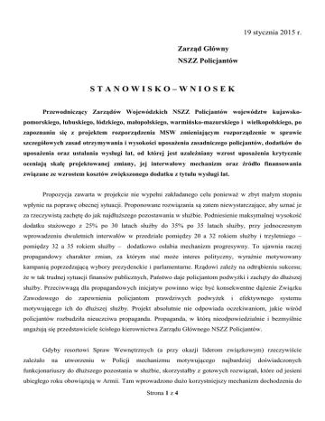 19 stycznia 2015 r. Zarząd Główny NSZZ Policjantów STANOWISKO–WNIOSEK Przewodniczący Zarządów Wojewódzkich NSZZ Policjantów województw kujawskopomorskiego, lubuskiego, łódzkiego, małopolskiego, warmińsko-mazurskiego i wielkopolskiego, po zapoznaniu się z projektem rozporządzenia MSW zmieniającym rozporządzenie w sprawie szczegółowych zasad otrzymywania i wysokości uposażenia zasadniczego policjantów, dodatków do uposażenia oraz ustalania wysługi lat, od której jest uzależniany wzrost uposażenia krytycznie oceniają skalę projektowanej zmiany, jej interwałowy mechanizm oraz źródło finansowania związane ze wzrostem kosztów zwiększonego dodatku z tytułu wysługi lat. Propozycja zawarta w projekcie nie wypełni zakładanego celu ponieważ w zbyt małym stopniu wpłynie na poprawę obecnej sytuacji. Proponowane rozwiązania są zatem niewystarczające, aby uznać je za rzeczywistą zachętę do jak najdłuższego pozostawania w służbie. Podniesienie maksymalnej wysokość dodatku stażowego z 25% po 30 latach służby do 35% po 35 latach służby, przy jednoczesnym wprowadzeniu dwuletnich interwałów w przedziale pomiędzy 20 a 32 rokiem służby i trzyletniego – pomiędzy 32 a 35 rokiem służby – dodatkowo osłabia mechanizm progresywny. To ujawnia raczej propagandowy charakter zmian, za którym stać może interes polityczny, wyraźnie motywowany kampanią poprzedzającą wybory prezydenckie i parlamentarne. Rządowi zależy na odtrąbieniu sukcesu; że w tak trudnej sytuacji finansów publicznych, Państwo daje policjantom podwyżki i zachęty do dłuższej służby. Przeciwwagą dla propagandowych inicjatyw powinno więc być konsekwentne dążenie Związku Zawodowego do zapewnienia policjantom prawdziwych podwyżek i efektywnego systemu motywującego ich do dłuższej służby. Projekt absolutnie nie odpowiada oczekiwaniom, jakie wśród policjantów rozbudziła nieuczciwa propaganda. Propaganda, w którą nieodpowiedzialnie i bezmyślnie angażują się przedstawiciele ścisłego kierownictwa Zarządu Głównego NSZZ Policjantów. Gdyby resortowi Spraw Wewnętrznych (a przy okazji liderom związkowym) rzeczywiście zależało na utworzeniu w Policji mechanizmu motywującego najbardziej doświadczonych funkcjonariuszy do dłuższego pozostania w służbie, skorzystałby z gotowych rozwiązań, które od jesieni ubiegłego roku obowiązują w Armii. Tam wprowadzono dużo korzystniejszy mechanizm dochodzenia do Strona 1 z 4 maksymalnej 35% wysokości dodatku za długoletnią służbę. Dodatek żołnierza zawodowego, za każdy kolejny rok służby wojskowej pełnionej ponad piętnaście lat zwiększa się o kwotę 1% należnego uposażenia zasadniczego do wysokości 35% po 35 latach służby wojskowej. Oprócz tego, żołnierzowi zawodowemu przyznaje się dodatek za długoletnią służbę wojskową w wysokości 300 zł. Żołnierz zawodowy już na początku swojej kariery otrzymuje dodatek stażowy w wysokości 300 zł., podczas gdy policjant – 0 zł. Po trzech latach służby te 300 zł. powiększa się żołnierzowi o 3% uposażenia zasadniczego, co zapewnia mu na podstawowym stanowisku wykonawczym dodatek w wysokości około 370 zł. Tymczasem policjantowi na podobnej grupie zaszeregowania każą się cieszyć gołymi 3% uposażenia zasadniczego w kwocie 70 zł. Końcowy efekt jest taki, że policjant z maksymalnym, 35letnim stażem służby, zatrudniony na stanowisku wykonawczym osiągnie dodatek w wysokości 600 zł. a żołnierz 900 zł.! Biorąc pod uwagę strukturę zatrudnienia w Policji i staż służby w przedziale powyżej 20 lat, na regulacji w proponowanym kształcie zyska w tym roku zaledwie kilkanaście procent policjantów. Przy czym większość z nich może liczyć na podwyżkę w wysokości kilkudziesięciu złotych. Tylko propozycja w wersji jaką otrzymali żołnierze zawodowi, każdemu policjantowi mogłaby zapewnić większe uposażenie o minimum 300 zł. Dopiero taką regulację można by uznać za podwyżkę. Liderzy związkowi, którzy wypowiadają się o projekcie MSW w kategoriach sukcesu, mają zatem o policjantach i o ich ciężkiej służbie takie samo wyobrażenie jak Rząd. A to już zakrawa na kpinę. Projektodawca słusznie zarzucił istniejącym uregulowaniom, że coroczny wzrost uposażenia zasadniczego policjantów nie jest wystarczająco odczuwalny, pozbawiony jest przez to charakteru motywacyjnego do pozostawania w służbie jak najdłużej. Zauważono, iż ma to decydujący wpływ na rezygnację z dalszej służby z Policji. Potwierdzeniem tej tezy są statystyki wskazujące na to, że aż 73% wszystkich decyzji o odejściu ze służby następuje między 20 a 25 rokiem służby. Zdaniem projektodawcy, zjawisku temu ma zapobiec 15%, które zyskają policjanci z 20-letnim stażem służby, jeżeli oczywiście pozostaną w Policji jeszcze przez 15 lat, żeby przekroczyć 35-letnią wysługę. Chociaż procentowy wzrost wygląda obiecująco, rzeczywisty wzrost wartości uposażenia zasadniczego z tytułu wysługi lat jest raczej pozorny, w każdym bądź razie na tyle nieznaczny żeby stanowić prawdziwą zachętę do pozostania w służbie do 35 lat. Przykładowy dzielnicowy z mnożnikiem 1,45 zyska na przestrzeni kolejnych 15 lat służby zawrotną sumę 330 zł. Ta śmiesznie niska kwota nie może stanowić żadnej zachęty. Większą podwyżkę ten dzielnicowy uzyska bowiem dzięki corocznej waloryzacji emerytury, którą otrzyma po 20 latach służby. Rozwiązaniem, które mogłoby zapewnić realną szansę na osiągnięcie zakładanego przez projektodawcę celu, jakim jest motywacja do dłuższej służby, wymaga zaangażowania w przedstawioną Strona 2 z 4 propozycję dodatkowych 300 zł. Tych brakujących 300 zł., które dla żołnierzy zawodowych Rząd znalazł bez problemu. Tych samych 300 zł, które sprawiają, że system motywujący w Armii jest znacznie korzystniejszy niż w Policji. Że