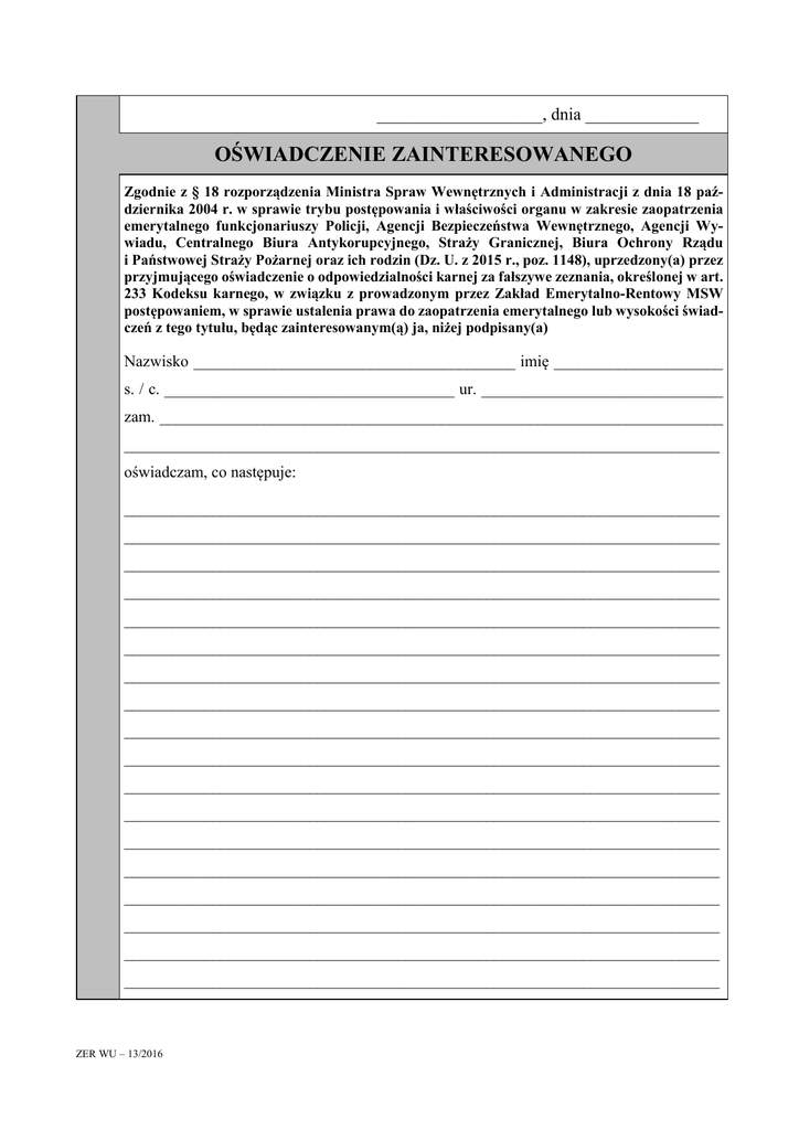 ___________________, dnia _____________ OŚWIADCZENIE ZAINTERESOWANEGO Zgodnie z § 18 rozporządzenia Ministra Spraw Wewnętrznych i Administracji z dnia 18 października 2004 r. w sprawie trybu postępowania i właściwości organu w zakresie zaopatrzenia emerytalnego funkcjonariuszy Policji, Agencji Bezpieczeństwa Wewnętrznego, Agencji Wywiadu, Centralnego Biura Antykorupcyjnego, Straży Granicznej, Biura Ochrony Rządu i Państwowej Straży Pożarnej oraz ich rodzin (Dz. U. z 2015 r., poz. 1148), uprzedzony(a) przez przyjmującego oświadczenie o odpowiedzialności karnej za fałszywe zeznania, określonej w art. 233 Kodeksu karnego, w związku z prowadzonym przez Zakład Emerytalno-Rentowy MSW postępowaniem, w sprawie ustalenia prawa do zaopatrzenia emerytalnego lub wysokości świadczeń z tego tytułu, będąc zainteresowanym(ą) ja, niżej podpisany(a) Nazwisko ________________________________________ imię _____________________ s. / c. ____________________________________ ur. ______________________________ zam. ______________________________________________________________________ __________________________________________________________________________ oświadczam, co następuje: __________________________________________________________________________ __________________________________________________________________________ __________________________________________________________________________ __________________________________________________________________________ __________________________________________________________________________ __________________________________________________________________________ __________________________________________________________________________ __________________________________________________________________________ __________________________________________________________________________ __________________________________________________________________________ __________________________________________________________________________ __________________________________________________________________________ __________________________________________________________________________ __________________________________________________________________________ __________________________________________________________________________ __________________________________________________________________________ __________________________________________________________________________ __________________________________________________________________________ ZER WU – 13/2016 __________________________________________________________________________ __________________________________________________________________________ __________________________________________________________________________ __________________________________________________________________________ __________________________________________________________________________ __________________________________________________________________________ __________________________________________________________________________ UWAGA: Zainteresowany składa podpis w obecności pracownika przyjmującego oświadczenie. _______________________________ (podpis zainteresowanego) Stwierdzam własnoręczność podpisu zainteresowanego, którego tożsamość ustaliłem na podstawie: _______________________________ (nazwa dokumentu, seria, numer) __________________________________ (data, pieczątka służbowa i podpis pracownika przyjmującego oświadczenie) POUCZENIE I. Art. 233. § 1. Kto, składając zeznanie mające służyć za dowód w postępowaniu sądowym lub w innym postępowaniu prowadzonym na podstawie ustawy, zeznaje nieprawdę lub zataja prawdę, podlega karze pozbawienia wolności od 6 miesięcy do lat 8. § 1a. Jeżeli sprawca czynu określonego w § 1 zeznaje nieprawdę lub zataja prawdę z obawy przed odpowiedzialnością karną grożącą jemu samemu lub jego najbliższym, podlega karze pozbawienia wolności od 3 miesięcy do lat 5. § 2. Warunkiem odpowiedzialności jest, aby przyjmujący zeznanie, działając w zakresie swoich uprawnień, uprzedził zeznającego o odpowiedzialności karnej za fałszywe zeznanie lub odebrał od niego przyrzeczenie. § 3. Nie podlega karze, za czyn określony w § 1a, kto składa fałszywe zeznanie nie wiedząc o prawie odmowy zeznania lub odpowiedzi na pytania. § 4. Kto, jako biegły, rzeczoznawca lub tłumacz, przedstawia fałszywą opinię, ekspertyzę lub tłumaczenie mające służyć za dowód w postępowaniu określonym w § 1, podlega karze pozbawienia wolności od roku do lat 10. § 4a. Jeżeli sprawca czynu określonego w § 4 działa nieumyślnie, narażając na istotną szkodę interes publiczny podlega karze pozbawienia wolności do lat 3. § 5. Sąd może zastosować nadzwyczajne złagodzenie kary, a nawet odstąpić od jej wymierzenia, jeżeli: 1) fałszywe zeznanie, opinia, ekspertyza lub tłumaczenie dotyczy okoliczności niemogących mieć wpływu na rozstrzygnięcie sprawy, 2) sprawca dobrowolnie sprostuje fałszywe zeznanie, opinię, ekspertyzę lub tłumaczenie, zanim nastąpi, chociażby nieprawomocne, rozstrzygnięcie sprawy. § 6. Przepisy § 1-3 oraz 5 stosuje się odpowiednio do osoby, która składa fałszywe oświadczenie, jeżeli przepis ustawy przewiduje możliwość odebrania oświadczenia pod rygorem odpowiedzialności karnej. II. Oświadczenie składa się na okoliczności, których potwierdzenie dokumentami nie jest wymagane. ZER WU – 13/2016