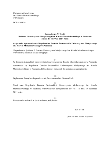 Uniwersytet Medyczny im. Karola Marcinkowskiego w Poznaniu DOP - 106/14 Zarządzenie Nr 54/14 Rektora Uniwersytetu Medycznego im. Karola Marcinkowskiego w Poznaniu z dnia 17 czerwca 2014 roku w sprawie wprowadzenia Regulaminu Domów Studenckich Uniwersytetu Medycznego im. Karola Marcinkowskiego w Poznaniu Na podstawie § 44 ust. 2 Statutu Uniwersytetu Medycznego im. Karola Marcinkowskiego w Poznaniu, zarządza się co następuje: §1 W domach studenckich Uniwersytetu Medycznego im. Karola Marcinkowskiego w Poznaniu wprowadza się Regulamin Domów Studenckich Uniwersytetu Medycznego im. Karola Marcinkowskiego w Poznaniu, który stanowi załącznik do niniejszego zarządzenia. §2 Wykonanie Zarządzenia powierza się Prorektorowi ds. Studenckich. §3 Traci moc Regulamin Domów Studenckich Uniwersytetu Medycznego im. Karola Marcinkowskiego w Poznaniu wprowadzony zarządzeniem Nr 76/11 z dnia 15 listopada 2011 roku. §4 Zarządzenie wchodzi w życie z dniem podpisania. Rektor prof. dr hab. Jacek Wysocki Załącznik do zarządzenia Nr 54/14 z dnia 17 czerwca 2014 r. Regulamin Domów Studenckich Uniwersytetu Medycznego im. Karola Marcinkowskiego w Poznaniu 1. Dom Studencki (DS.) jest integralną częścią Uczelni, miejscem zamieszkania uprawnionych do tego studentów, miejscem nauki, pracy i wypoczynku. 2. Mieszkańcy domu studenckiego zobowiązani są do ścisłego przestrzegania przepisów przeciwpożarowych i BHP oraz do korzystania z urządzeń i wyposażenia w sposób zgodny z przeznaczeniem. Za łamanie przepisów przeciwpożarowych uznawane jest również zastawianie/blokowanie dojazdowych dróg pożarowych. 3. Mieszkańcy domu studenckiego zobowiązani są do dbałości o utrzymanie porządku i czystości w zamieszkałych przez siebie pokojach oraz w pomieszczeniach przeznaczonych do wspólnego użytku. 4. Mieszkańcom przysługuje prawo do korzystania ze wszystkich pomieszczeń domu studenckiego przeznaczonych do wspólnego użytku. Pomieszczenia przeznaczone do wspólnego użytku mieszkańców nie mogą być wykorzystywane bez zgody kierownika domu studenckiego do innych celów niż te, do których są przeznaczone. Mogą podlegać wcześniejszej rezerwacji, z uwzględnieniem, że mieszkańcy i organizacje studenckie mają pierwszeństwo rezerwacji. Pralnie oraz suszarnie mogą być wykorzystywane tylko przez mieszkańców danego domu studenckiego. 5. W pomieszczeniach wspólnego użytku zabrania się przechowywać rzeczy osobistych (np.: obuwia, odpadów komunalnych na wspólnym korytarzu). 6. Wszelkie usterki należy niezwłocznie zgłaszać Administracji domu studenckiego. Za wszystkie zawinione przez siebie uszkodzenia i braki w urządzeniach w pokojach domu studenckiego mieszkańcy odpowiadają materialnie: w przypadku ustalenia sprawcy – indywidualnie, w przeciwnym razie wspólnie Należności egzekwuje kierownik DS w porozumieniu z Radą Mieszkańców. 7. Dowodem zamieszkania w domu studenckim jest karta mieszkańca z fotografią, którą mieszkaniec zobowiązany jest przedstawiać portierom, administracji domu studenckiego oraz członkom Rady Mieszkańców na każde wezwanie. 8. Każdorazowo opuszczając dom studencki mieszkańcy zobowiązani są pozostawiać klucz w portierni. Pełną odpowiedzialność za klucz ponosi mieszkaniec (z wyjątkiem sytuacji kiedy został on pozostawiony na portierni). Zgubiony klucz zostanie zastąpiony nowym wraz z wymienieniem zamka w drzwiach na koszt mieszkańca. 9. Student zostaje zakwaterowany w domu studenckim na podstawie imiennego wykazu lub indywidualnego skierowania wydanego przez Dział Spraw Studenckich. Wszelkie formalności związane z zakwaterowaniem załatwiane są przez administrację domu studenckiego. 10. Przy zakwaterowaniu mieszkaniec otrzymuje pościel i sprzęt, jednocześnie powinien sprawdzić stan wyposażenia pokoju a ewentualne braki zgłosić niezwłocznie w administracji domu studenckiego w celu uzupełnienia ich. Za zniszczenie częściowe lub całkowite powierzonego mienia mieszkaniec odpowiada materialnie pokrywając w całości wyrządzoną szkodę. 11. Zajmowanie przez jednego mieszkańca pokoju dwuosobowego możliwe jest wyłącznie, za zgodą Prorektora ds. studenckich i po wniesieniu opłaty za dwa miejsca. 12. Warunkiem uzyskania miejsca w pokoju jednoosobowym jest wcześniejsze uzyskanie miejsca w domu studenckim. 13. Mieszkaniec domu studenckiego nie może bez uzgodnienia z administracją domu dokonywać samowolnej zmiany przydzielonego pokoju. 14. Rezygnację z zajmowanego miejsca (pokoju) w trakcie roku akademickiego mieszkaniec zobowiązany jest zgłosić na piśmie w administracji DS z 30- dniowym wyprzedzeniem (wypowiedzeniem). W przypadku zgłoszenia w terminie krótszym, mieszkaniec wnosi opłatę do dnia, w którym mija 30- dniowy termin wypowiedzenia. 15. W przypadku gdy jeden ze współmieszkańców wyprowadzi się, pozostały mieszkaniec wnosi opłatę za dwa miejsca lub przekwaterowuje się w terminie nie dłuższym niż 1 miesiąc od zawiadomienia go przez administrację o konieczności przekwaterowania się do innego pokoju, w którym jest wolne miejsce. 16. Opłata za zajmowane miejsce (pokój) w domu studenckim uiszczana jest z góry za dany miesiąc. Termin wniesienia opłaty upływa 15 dnia danego miesiąca. 17. Od studenta, który przyjeżdża do uczelni w ramach programu Erasmus pobiera się kaucję zwrotną w wysokości 400,00 zł (czterysta złotych). 18. Mieszkaniec oprócz stałej opłaty reguluje również inne zobowiązania brutto np. opłaty za rozmowy telefoniczne dokonywane za pośrednictwem centrali telefonicznej DS. w trybie i terminie ustalanym przez administrację DS. 19. Osoby, które otrzymają przydział miejsca (pokoju) w trakcie trwania roku akademickiego, wnoszą opłatę od dnia przyznania tego miejsca. 20. Opłata za zamieszkanie w DS w okresie wakacyjnym regulowana jest w odrębnym Komunikacie Prorektora ds. Studenckich, wydawanym do 31 maja każdego roku akad