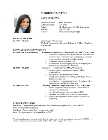 CURRICULUM VITAE DANE OSOBOWE Imię i nazwisko: Data urodzenia: Adres: Telefon: E-mail: WYKSZTAŁCENIE 10.1999 – 06.2004 Anna Kowalska 12.4.1980 ul. Mostowa 6, 01-000 Warszawa 600 000 000 [email protected] Uniwersytet Warszawski Wydział Polonistyki, Kierunek Filologia Polska – Dyplom Magisterski DOŚWIADCZENIE ZAWODOWE 12.2010 – do chwili obecnej Redaktor prowadzący – Wydawnictwo ABC, Warszawa 02.2007 – 10.2010 Redaktor – Wydawnictwo ABC, Warszawa 10.2004 – 01.2007 kreowanie nowych tytułów podręczników akademickich nawiązywanie i utrzymywanie współpracy z autorami negocjowanie z autorami warunków umów zawieranie umów wydawniczych uczestnictwo w pracach programowych związanych z planowaniem publikacji na dany rok opracowywanie merytoryczne podręczników akademickich współpraca z autorami podręczników współpraca z działami: produkcji, marketingu oraz z działem handlowym uczestnictwo w pracach programowych związanych z planowaniem publikacji na dany rok Młodszy redaktor – Wydawnictwo XYZ, Warszawa pisanie artykułów merytorycznych i sprawozdań z seminariów, konferencji pozyskiwanie autorów do czasopisma XYZ kontakt z autorami w celu pozyskiwania tekstów sprawdzanie artykułów pod względem poprawności językowej KURSY I SZKOLENIA Szkolenie „Interpunkcja profesjonalna dla redaktorów językowych i korektorów” Kurs redakcji merytorycznej Szkolenie „Prawo autorskie i prawa pokrewne” Kurs „Redagowanie tekstów pod kątem SEO” Wyrażam zgodę na przetwarzanie moich danych osobowych, zgodnie z przepisami ustawy z 29.08.1997 r. o ochronie danych osobowych (tekst jedn. Dz.U. z 2002 r. Nr 101, poz. 926 ze zm.). ZNAJOMOŚĆ JĘZYKÓW OBCYCH Angielski – poziom zaawansowany Niemiecki – poziom podstawowy UMIEJĘTNOŚCI Obsługa komputera: MS Office (Word, Exel, Power Point) Obsługa cms: WordPress, Joomla Prawo jazdy kat. B DODATKOWE INFORMACJE Cechy osobowościowe: komunikatywność, odpowiedzialność, dobra organizacja pracy, spostrzegawczość i dokładność Zainteresowania: moda, fitness, film polski Wyrażam zgodę na przetwarzanie moich danych osobowych, zgodnie z przepisami ustawy z 29.08.1997 r. o ochronie danych osobowych (tekst jedn. Dz.U. z 2002 r. Nr 101, poz. 926 ze zm.).