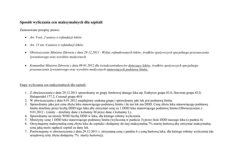 Sposób wyliczania cen maksymalnych dla szpitali Zastosowane przepisy prawa: • Art. 9 ust. 2 ustawy o refundacji leków. • Art. 15 ust. 6 ustawy o refundacji leków. • Obwieszczenie Ministra Zdrowia z dnia 29.12.2011 - Wykaz refundowanych leków, środków spożywczych specjalnego przeznaczenia żywieniowego oraz wyrobów medycznych. • Komunikat Ministra Zdrowia z dnia 09.01.2012 dla świadczeniodawców dotyczący leków, środków spożywczych specjalnego przeznaczenia żywieniowego oraz wyrobów medycznych stanowiących podstawę limitu. Etapy wyliczania cen maksymalnych dla szpitali: 1. Z obwieszczenia z dnia 29.12.2011 sprawdzamy nr grupy limitowej danego leku np. Euthyrox grupa 83.0, Staveran grupa 42.0, Haloperidol 177.2, Coronal grupa 40.0 2. W obwieszczeniu z dnia 9.01.2012 znajdujemy szukaną grupę i sprawdzamy jaki lek jest podstawą limitu. 3. Sprawdzamy jaka jest cena zbytu leku stanowiącego podstawę limitu i ile ten lek ma DDD. Cenę zbytu leku stanowiącego podstawę limitu dzielimy przez liczbę DDD tego leku aby otrzymać cenę za 1 DDD leku stanowiącego podstawę limitu (Obwieszczenie z 9.01.2012 - Limity – dzielimy dane z kolumny M przez dane z kolumny L). 4. Sprawdzamy na stronie WHO liczbę DDD w leku, dla którego robimy wyliczenia. 5. Mnożymy cenę 1 DDD leku stanowiącego podstawę limitu (wyliczoną w punkcie 3) przez ilość DDD naszego leku (z punktu 4). 6. Otrzymujemy maksymalną cenę zbytu leku do szpitala i dodajemy do niej maksymalną 7% marżę hurtową aby otrzymać maksymalną cenę jaką może zapłacić szpital za dany lek. 7. Porównujemy w obwieszczeniu z dnia 29.12.2011 r. otrzymaną cenę z punktu 6 z ceną hurtową leku, dla którego robimy wyliczenia (do urzędowej ceny zbytu dodajemy 7% marży hurtowej). PRZYKŁAD: Poszukujemy ceny maksymalnej szpitalnej dla leku CORONAL 5 mg: 1. Coronal - grupa 40.0 2. Podstawa limitu - Atenolol 25 mg x 60 tabl. DDD dla Atenololu – 75 mg 3. Cena zbytu Atenololu 25 mg x 60 tabl. = 2,40 zł; Cena zbytu z marżą = 2,568 zł; Ilość DDD w opakowaniu = 20 co daję cenę za 1 DDD = 0,1284 zł/0,13 zł 4. Coronal 5 mg x 30 tabl., 1 DDD dla Bisoprololu (substancja czynna) = 10 mg, w opakowaniu leku Coronal 5 mg x 30 tabl = 15 DDD 5. 15 DDD x 0,1284zł = 1,93 zł 6. 1,80 zł + 7% marży = 1,93 zł 7. Urzędowa cena zbytu Coronal 5 mg x 30 tabl. = 5,08 +7% marży = 5,44 > 1,93 zł Według wyżej zawartych obliczeń maksymalna cena dla leku Coronal 5 mg x 30 tabl. dla szpitala wynosi 1,93 zł a ta cena jest znacznie niższa od urzędowej ceny zbytu w Obwieszczeniu Ministra Zdrowia z dnia 29.12.2011 - Wykaz refundowanych leków, środków spożywczych specjalnego przeznaczenia żywieniowego oraz wyrobów medycznych – 5,44 zł. Poszukujemy ceny maksymalnej szpitalnej dla leku Haloperidol 1 mg: 8. Haloperidol tabletki - grupa 177.2 9. Podstawa limitu – Haloperidol 5 mg x 30 tabl. DDD dla Haloperidolu – 8 mg 10. Cena zbytu Haloperidolu 5 mg x 30 tabl. = 4,16 zł; Cena zbytu z marżą = 4,4512 zł; Ilość DDD w opakowaniu = 18,75 co daję cenę za 1 DDD = 0,238 zł/0,24 zł 11. Haloperidol 1 mg x 40 tabl., 1 DDD dla Haloperidolu = 8 mg, w opakowaniu leku Haloperidol 1 mg x 40 tabl = 5 DDD 12. 5 DDD x 0,238 zł = 1,19 zł 13. Urzędowa cena zbytu Haloperidol 1 mg x 40 tabl. = 4,16 zł. + 7% marży = 4,45 zł. Według wyżej zawartych obliczeń maksymalna cena dla leku Haloperidol 1 mg x 40 tabl. dla szpitala wynosi 1,19 zł a ta cena jest znacznie niższa od urzędowej ceny zbytu w Obwieszczeniu Ministra Zdrowia z dnia 29.12.2011 - Wykaz refundowanych leków, środków spożywczych specjalnego przeznaczenia żywieniowego oraz wyrobów medycznych – 4,45 zł.