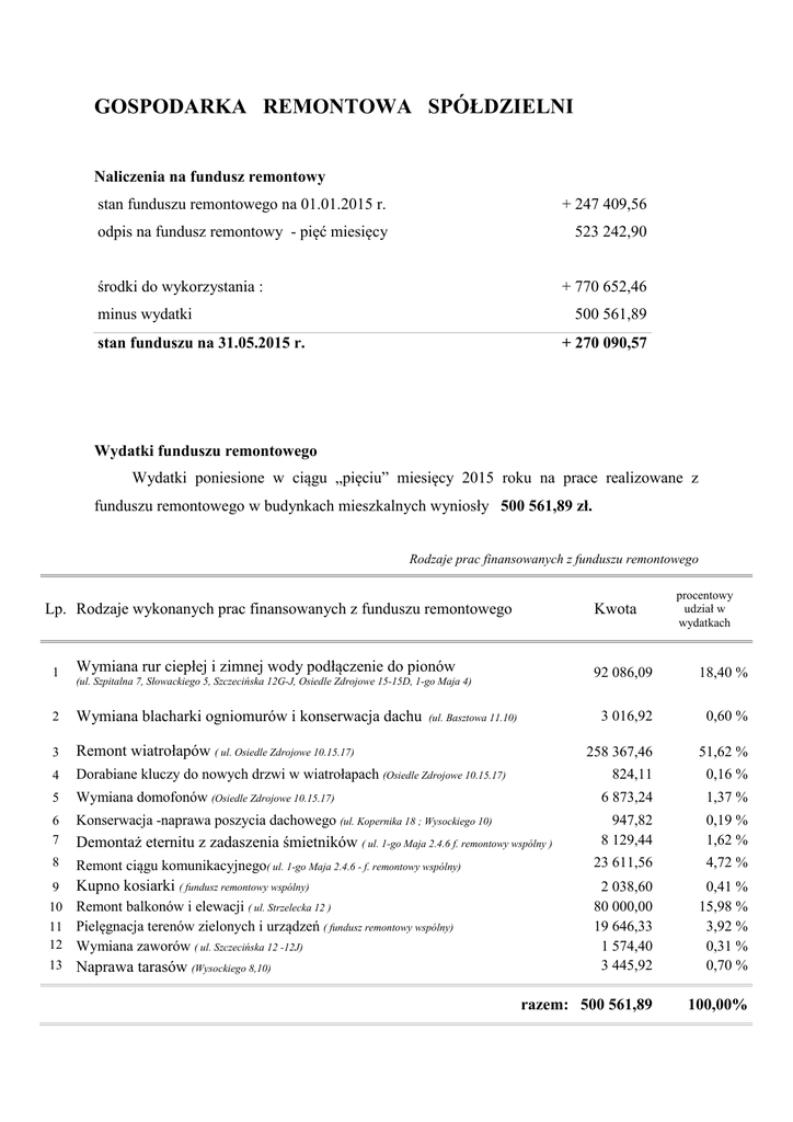 GOSPODARKA REMONTOWA SPÓŁDZIELNI Naliczenia na fundusz remontowy stan funduszu remontowego na 01.01.2015 r. + 247 409,56 odpis na fundusz remontowy - pięć miesięcy 523 242,90 środki do wykorzystania : + 770 652,46 minus wydatki 500 561,89 stan funduszu na 31.05.2015 r. + 270 090,57 Wydatki funduszu remontowego Wydatki poniesione w ciągu „pięciu” miesięcy 2015 roku na prace realizowane z funduszu remontowego w budynkach mieszkalnych wyniosły 500 561,89 zł. Rodzaje prac finansowanych z funduszu remontowego Lp. Rodzaje wykonanych prac finansowanych z funduszu remontowego 1 Wymiana rur ciepłej i zimnej wody podłączenie do pionów 2 Wymiana blacharki ogniomurów i konserwacja dachu 3 Remont wiatrołapów ( ul. Osiedle Zdrojowe 10.15.17) 4 Dorabiane kluczy do nowych drzwi w wiatrołapach (Osiedle Zdrojowe 10.15.17) 5 Kwota procentowy udział w wydatkach 92 086,09 18,40 % 3 016,92 0,60 % 258 367,46 51,62 % 824,11 0,16 % Wymiana domofonów (Osiedle Zdrojowe 10.15.17) 6 873,24 1,37 % 6 7 Konserwacja -naprawa poszycia dachowego (ul. Kopernika 18 ; Wysockiego 10) 947,82 8 129,44 0,19 % 1,62 % 8 Remont ciągu komunikacyjnego( ul. 1-go Maja 2.4.6 - f. remontowy wspólny) 23 611,56 4,72 % 9 Kupno kosiarki ( fundusz remontowy wspólny) 10 11 12 Remont balkonów i elewacji ( ul. Strzelecka 12 ) Pielęgnacja terenów zielonych i urządzeń ( fundusz remontowy wspólny) Wymiana zaworów ( ul. Szczecińska 12 -12J) 13 Naprawa tarasów (Wysockiego 8,10) 2 038,60 80 000,00 19 646,33 1 574,40 3 445,92 0,41 % 15,98 % 3,92 % 0,31 % 0,70 % razem: 500 561,89 100,00% (ul. Szpitalna 7, Słowackiego 5, Szczecińska 12G-J, Osiedle Zdrojowe 15-15D, 1-go Maja 4) (ul. Basztowa 11.10) Demontaż eternitu z zadaszenia śmietników ( ul. 1-go Maja 2.4.6 f. remontowy wspólny ) Struktura funduszu remontowego na 31.05.2015 roku Lp. Nazwa nieruchomości 1 Wysockiego 5 Wysockiego 7 Wysockiego 8 Wysockiego 10 Wysockiego 12 Szczecińska 12-12B Szczecińska 12C-12F Szczecińska 12G-12J Szczecińska 18,20,22 Szpitalna 5 Szpitalna 7 Mariańska Strzelecka 1 Strzelecka 12 Bałtycka 1 Słowackiego Jagiełły Basztowa 10 Basztowa 11 Kopernika 18 Kochanowskiego Sienkiewicza 1-Go Maja 2 1-Go Maja 4 1-Go Maja 6 Zwycięstwa Os. Zdrojowe 10 Os. Zdrojowe 15 Os. Zdrojowe 17 Papieża Jana Pawła II 9 Papieża Jana Pawła II 10 Papieża Jana Pawła II 11 Fundusz wspólny 2 3 4 5 6 7 8 9 10 11 12 13 14 15 16 17 18 19 20 21 22 23 24 25 26 27 28 29 30 31 32 33 razem: Stan funduszu remontowego na 31.12.2014 rok Odpis na fundusz remontowy -125 498,42 -117 882,36 -53 923,16 -26 266,61 151 237,17 -4 309,66 60 052,99 -3 340,16 41 501,28 71 725,89 91 677,59 -57 595,31 -156 860,39 47 454,96 -54 814,36 106 393,69 2 355,30 35 135,93 116 566,53 -34 381,51 -64 162,97 -137 482,25 -17 668,63 -47 104,84 -21 815,59 -71 751,05 83 088,25 19 576,27 97 139,37 -28 023,32 4 284,50 15 394,35 326 706,08 18 914,00 18 040,60 11 976,80 15 056,10 18 274,70 16 215,40 16 463,80 20 037,76 15 529,50 5 176,50 21 625,00 18 524,40 13 932,60 16 432,37 11 350,05 25 498,55 7 062,90 6 704,80 23 697,70 17 758,20 33 593,25 18 270,00 6 400,50 14 416,85 12 463,55 9 163,15 24 250,72 18 326,03 13 316,32 15 095,60 23 785,50 13 650,60 2 239,10 247 409,56 523 242,90 w tym: Wydatki Stan funduszy remontowego na 31.05.2015 r. 157,48 144 143,52 -106 584,42 -99 841,76 -43 669,32 -13 622,65 169 511,87 11 421,35 76 024,98 15 184,70 57 030,78 76 902,39 112 848,79 -39 070,91 -142 927,79 -16 112,67 -43 464,31 131 892,24 9 418,20 41 538,99 137 549,05 -16 881,95 -30 569,72 -119 212,25 -11 268,13 -32 687,99 -9 352,04 -62 587,90 -3 369,00 -50 685,38 44 053,99 -13 137,70 28 070,00 28 887,47 184 801,66 500 561,89 270 090,57 1 722,96 2 412,14 484,39 491,81 1 512,90 453,80 80 000,00 301,74 2 715,18 258,64 110 707,97 88 587,68 66 401,70 209,98 w tym: niedobór 1 022 880,59 niedobór 855 045,89 nadwyżka 1 270 290,15 nadwyżka 1 125 136,46