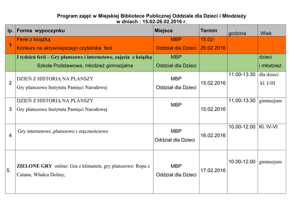 Program zajęć w Miejskiej Bibliotece Publicznej Oddziale dla Dzieci i Młodzieży w dniach : 15.02-26.02.2016 r. lp. Forma wypoczynku Ferie z książką 1 2 Konkurs na aktywniejszego czytelnika ferii Szkoła Podstawowa, młodzież gimnazjalna Oddział dla Dzieci DZIEŃ Z HISTORIĄ NA PLANSZY Gry planszowe Instytutu Pamięci Narodowej Gry internetowe ,planszowe i zręcznościowe MBP Oddział dla Dzieci MBP MBP Oddział dla Dzieci ZIELONE GRY online: Gra z klimatem, gry planszowe: Ropa z Catanu, Władca Doliny, Termin godzina Wiek 15.02- Oddział dla Dzieci 26.02.2016 MBP 3 Gry planszowe Instytutu Pamięci Narodowej 5. MBP I tydzień ferii – Gry planszowe i internetowe, zajęcia z książką DZIEŃ Z HISTORIĄ NA PLANSZY 4 Miejsce MBP Oddział dla Dzieci dzieci i młodzież 11.00-13.30 dla dzieci 15.02.2016 kl. I-III 11.00-13.30 gimnazjum 15.02.2016 10.00-12.00 Kl. IV-VI 16.02.2016 10.00-12.00 gimnazjum 17.02.2016 II Tydzień ferii – zajęcia biblioteczne ph. Ferie w bibliotece ( kl.I-III godz. 9.00-12.00) 2. Gry i zabawy integracyjne, gry komputerowe, planszowe. Gry świetlicowe: ping- pong , bilard, piłkarzyki Dzień MEKSYKAŃSKI 3. zajęcia kulinarne - POZNAJEMY SMAKI Oddział dla Dzieci, Gry , zabawy , konkursy TABASCO Eko-gry, Eko-zabawy, Eko-konkursy ZABAWA W TEATR robienie kukiełek – konkurs na najpiękniejszą kukiełkę, przygotowanie przedstawienia kukiełkowego 22.02.2016 MBP Restauracja gry komputerowe , planszowe, świetlicowe 5. Oddział dla Dzieci MEKSYKAŃSKIE ( Wizyta z restauracji TABASCO) Dzień z Eko-Paką . 4. MBP MBP Oddział dla Dzieci 9.00-13.00 dzieci kl.I-III 9.00-13.00 dzieci 23.02.2016 kl.I-III 9.00-13.00 24.02.2016 dzieci kl.I-III dzieci MBP 9.00-13.00 kl.I-III 26.02.2016 9.00-13.00 dzieci Oddział dla Dzieci, 25.02.2016 gry komputerowe , planszowe, gry świetlicowe MAM TALENT 6. konkurs: piosenki ,tańca , gimnastyki , zgaduj-zgadule gry świetlicowe: ping- pong , bilard, piłkarzyki 6. Rozstrzygnięcie konkursu „Najaktywniejszy czytelnik ferii”. MBP Oddział dla Dzieci, MBP Oddział dla Dzieci kl.I-III 26.02.2016 13.00 dzieci i młodzież