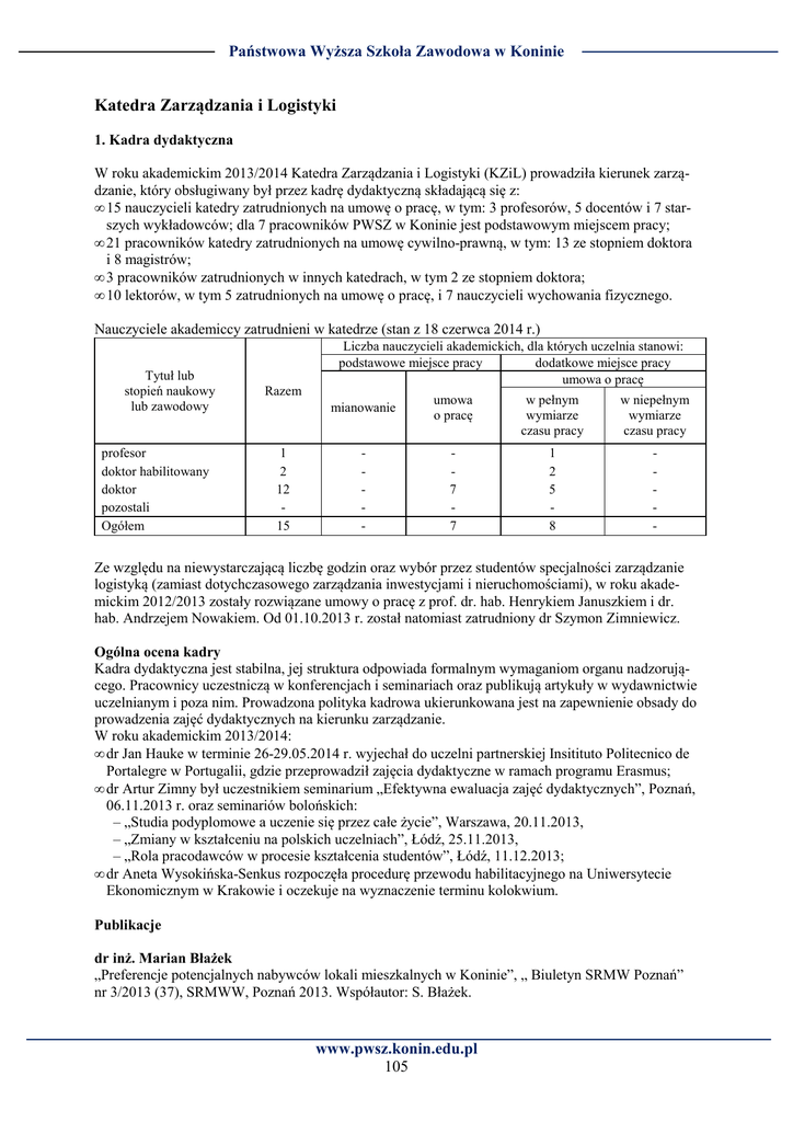 Państwowa Wyższa Szkoła Zawodowa w Koninie Katedra Zarządzania i Logistyki 1. Kadra dydaktyczna W roku akademickim 2013/2014 Katedra Zarządzania i Logistyki (KZiL) prowadziła kierunek zarządzanie, który obsługiwany był przez kadrę dydaktyczną składającą się z: • 15 nauczycieli katedry zatrudnionych na umowę o pracę, w tym: 3 profesorów, 5 docentów i 7 starszych wykładowców; dla 7 pracowników PWSZ w Koninie jest podstawowym miejscem pracy; • 21 pracowników katedry zatrudnionych na umowę cywilno-prawną, w tym: 13 ze stopniem doktora i 8 magistrów; • 3 pracowników zatrudnionych w innych katedrach, w tym 2 ze stopniem doktora; • 10 lektorów, w tym 5 zatrudnionych na umowę o pracę, i 7 nauczycieli wychowania fizycznego. Nauczyciele akademiccy zatrudnieni w katedrze (stan z 18 czerwca 2014 r.) Tytuł lub stopień naukowy lub zawodowy profesor doktor habilitowany doktor pozostali Ogółem Razem 1 2 12 15 Liczba nauczycieli akademickich, dla których uczelnia stanowi: podstawowe miejsce pracy dodatkowe miejsce pracy umowa o pracę mianowanie umowa o pracę w pełnym wymiarze czasu pracy w niepełnym wymiarze czasu pracy - 7 7 1 2 5 8 - Ze względu na niewystarczającą liczbę godzin oraz wybór przez studentów specjalności zarządzanie logistyką (zamiast dotychczasowego zarządzania inwestycjami i nieruchomościami), w roku akademickim 2012/2013 zostały rozwiązane umowy o pracę z prof. dr. hab. Henrykiem Januszkiem i dr. hab. Andrzejem Nowakiem. Od 01.10.2013 r. został natomiast zatrudniony dr Szymon Zimniewicz. Ogólna ocena kadry Kadra dydaktyczna jest stabilna, jej struktura odpowiada formalnym wymaganiom organu nadzorującego. Pracownicy uczestniczą w konferencjach i seminariach oraz publikują artykuły w wydawnictwie uczelnianym i poza nim. Prowadzona polityka kadrowa ukierunkowana jest na zapewnienie obsady do prowadzenia zajęć dydaktycznych na kierunku zarządzanie. W roku akademickim 2013/2014: • dr Jan Hauke w terminie 26-29.05.2014 r. wyjechał do uczelni partnerskiej Insitituto Politecnico de Portalegre w Portugalii, gdzie przeprowadził zajęcia dydaktyczne w ramach programu Erasmus; • dr Artur Zimny był uczestnikiem seminarium „Efektywna ewaluacja zajęć dydaktycznych”, Poznań, 06.11.2013 r. oraz seminariów bolońskich: – „Studia podyplomowe a uczenie się przez całe życie”, Warszawa, 20.11.2013, – „Zmiany w kształceniu na polskich uczelniach”, Łódź, 25.11.2013, – „Rola pracodawców w procesie kształcenia studentów”, Łódź, 11.12.2013; • dr Aneta Wysokińska-Senkus rozpoczęła procedurę przewodu habilitacyjnego na Uniwersytecie Ekonomicznym w Krakowie i oczekuje na wyznaczenie terminu kolokwium. Publikacje dr inż. Marian Błażek „Preferencje potencjalnych nabywców lokali mieszkalnych w Koninie”, „ Biuletyn SRMW Poznań” nr 3/2013 (37), SRMWW, Poznań 2013. Współautor: S. Błażek. www.pwsz.konin.edu.pl 105 Sprawozdanie Rektora w roku akademickim 2013/2014 „Analiza cen transakcyjnych nieruchomości gruntowych na rynkach lokalnych miasta i gminy Gniezno”, cz. I, „Biuletyn SRMWW Poznań”, nr 1-2/2014 (39-40), SRMWW, Poznań 2014. Współautor: S. Błażek. dr Marek Datko „Sponsoring imprezy biegowej – zasady współpracy ze sponsorem”, w: „Marketing imprez biegowych”, red. Z. Waśkowski, Bogucki Wydawnictwo Naukowe, Poznań 2014. dr Romualda Fimińska-Banaszyk „Współczesne problemy zarządzania. Dylematy i propozycje rozwiązań”, redakcja naukowa monografii, PWSZ w Koninie, przyjęte do druku i po pozytywnej recenzji naukowej, Konin 2014. dr Cezary Gradowicz „Efektywny transport morski a współczesne potrzeby przedsiębiorstw – aspekt zaopatrzenia z rynków niskokosztowych”, „Logistyka”, nr 6/2013, s. 146-157. „Logistyka w strategii rozwoju miasta – aspekt transportu odpadów komunalnych”, „Acta Universitatis Lodziensis”, „Folia Oeconomica” nr 287, Uniwersytet Łódzki 2013, s. 105-118 dr Waldemar Gulczyński „Wstęp”, w: W. Gulczyński (red.), „Lokalne i regionalne problemy gospodarki przestrzennej III”, PWSZ, Gorzów Wlkp. 2013. „Przydatność koncepcji logistyki miejskiej w funkcjonowaniu i rozwoju małych miast na przykładzie miast stowarzyszonych w Cittaslow”, w: J. Grzywacz, S. Kowalski (red.), „Przedsiębiorstwa, banki i regiony w gospodarce”, PWSZ, Płock 2014. „Lokalne i regionalne problemy gospodarki przestrzennej III”, red. W. Gulczyński, PWSZ, Gorzów Wlkp. 2013. dr hab. Mirosław Hamrol „Niedoceniane aspekty badania sprawozdania finansowego przedsiębiorstwa”, w: Zarzecki D. (red.), „Czas na pieniądz. Mierzenie wyników przedsiębiorstw i ocena efektywności inwestycji”, „Zeszyty Naukowe Uniwersytetu Szczecińskiego” 2013, nr 760, „Finanse, Rynki Finansowe, Ubezpieczenia” nr 59, Uniwersytet Szczeciński 2013, s. 123-132. dr Jan Hauke “Computing the Jacobian in Gaussian spatial models: an illustrated comparison of available methods, Geographical Analysis”, 2013, 45(2), 150-179. Współautorzy: R. Bivand, J. Hauke, T. Kosowski. “Revisiting the BLUE in a linear model via proper eigenvectors”, w: “Combinatorial Matrix Theory and Generalized Inverses of Matrices”, R.B. Bapat, S.J. Kirkland, K. Manjunatha Prasad and S. Puntanen, 2013, eds. Springer, 73-83. Współautorzy: J. Hauke, A. Markiewicz, S. Puntanen. “Identyfikacja efektów przestrzennych w badaniu obszarów wzrostu i stagnacji w Polsce w zakresie infrastruktury technicznej”, w: „Lokalne i regionalne problemy gospodarki przestrzennej III”, red. W. Gulczyński, WSB, Gorzów Wlkp. 2013. Współautorzy: T. Kossowski, R. Perdał, J. Hauke. „Obszary wzrostu i stagnacji w aspekcie urbanizacyjno-środowiskowym. Przykład Polski – wymiar lokalny”, w: „Lokalne i regionalne problemy gospodarki przestrzennej III”, red. W. Gulczyński, Wydawnictwo WSB, Gorzów Wlkp. 2013. Współautorzy: B. Konecka-Szydłowsk