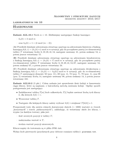 Algorytmy i struktury danych semestr zimowy 2016/2017 laboratorium nr 10 Haszowanie Zadanie ALL.10.1 Niech m = 13. Zdefiniujmy następujące funkcje haszujące: – h1 (k) = k mod m – oraz h2 (k) = 1 + (k mod (m − 2)). (A) Prześledź działanie adresowania otwartego opartego na adresowaniu liniowym z funkcją haszującą h(k, i) = (h1 (k)+i) mod m w sytuacji, gdy do początkowo pustej (m-elementowej) tablicy T wstawiamy liczby 6, 19, 28, 41, 54, następnie usuwamy 41, potem szukamy 54, a potem jeszcze wstawiamy 15. (B) Prześledź działanie adresowania otwartego opartego na adresowaniu kwadratowym z funkcją haszującą h(k, i) = (h1 (k) + i2 ) mod m w sytuacji, gdy do początkowo pustej (m-elementowej) tablicy T wstawiamy liczby 6, 19, 28, 41, 54, 67, następnie usuwamy 54, potem szukamy 67, a potem jeszcze wstawiamy 24. (C) Prześledź działanie adresowania otwartego opartego na adresowaniu dwukrotnym z funkcją haszującą h(k, i) = (h1 (k) + i · h2 (k)) mod m w sytuacji, gdy do m-elementowej tablicy T zawierającej elementy 50 (poz. 11), 69 (poz. 4), 72 (poz. 7), 79 (poz. 1), oraz 98 (poz. 5) wstawiamy liczbę 14, następnie usuwamy 98, potem szukamy 14, a potem jeszcze wstawiamy 241. Zadanie ALL10.2 (3 pkt.) Celem zadania jest sprawdzenie ilości kolizji w haszowaniu ciągu kluczy, które są napisami, z łańcuchową metodą usuwania kolizji. Ogólny sposób postępowania jest następujący. • Zadeklarować tablicę T [m] liczb całkowitych; T [i] będzie zawierać liczbę tych kluczy k, dla których h(k) = i. • Wyzerować tablicę T . • Następnie dla kolejnych kluczy należy wyliczać h(k) i zwiększać T [h(k)] o 1. Przeprowadź testy dla sześciu różnych dostatecznie dużych (> 1000) wartości m (trzech „korzystnych” i trzech „niekorzystnych”), zakładając, że wstawiamy około 2m kluczy, i wypisz (za każdym testem), jaka jest: – ilość zerowych pozycji w tablicy T ; – maksymalna wartość w T ; – średnia wartość pozycji niezerowych. Klucze-napisy do testowania są w pliku 3700.txt. Wykaz liczb pierwszych (przydatnych przy doborze rozmiaru tablicy): pierwsze.txt. 8 Możliwe schematy konwersji napisu na liczbę: a) abcdef . . . → ((256 · a + b) XOR (256 · c + d)) XOR (256 · e + f ) . . .; b) abc . . . x → (. . . ((111 · a + b) · 111 + c) · 111 + . . .) · 111 + x. Działania na długich liczbach bez znaku, ignorując przepełnienia (jeśli z jakiegoś powodu powyższa konwersja zwróci liczbę ujemną, należy zwrócić błąd). Uwaga — w drugim schemacie liczba 111 to przykładowa stała. Zadanie ALL.10.3 (3 pkt.) Zaprogramować – zgodnie z przydzielonym wariantem – wybrane operacje na tablicy z haszowaniem z adresowaniem otwartym oraz przeprowadzić odpowiednie testy/pomiary. Operacje przetestować na małej tablicy, z wydrukiem kontrolnym, natomiast właściwe testy/pomiary, wraz z krótkim opisem ich wyniku, przeprowadzić na kilku tablicach o większych i różnych rozmiarach, np. rzędu kilku tysięcy. W tablicy haszowań mają być struktury zawierające dwa pola: • liczba – typu int; • nazwisko – ciąg znaków. Kluczami mają być nazwiska (patrz przykładowe schematy zamiany w ALL.10.2). W tablicy haszowań mogą znajdować się wskaźniki na te struktury bądź całe struktury. Pod adresem www.futrega.org/etc/nazwiska.html znajduje się wykaz zapisów postaci X Nazwisko, gdzie X jest liczbą typu int określającą popularność nazwiska Nazwisko. Można wykorzystać ten plik do testów. Warianty operacji i pomiarów [W] Operacja WSTAW. Dany test należy wykonać przy różnych wypełnieniach tablicy rozmiaru m: 50%, 70% i 90%. Przy danym wypełnieniu tablicy wykonujemy 5m/100 operacji wstawienia elementu do tablicy i wyznaczamy średnią liczby prób ze wstawienia wszystkich testowanych elementów. [U] Operacje USUŃ. Po wypełnieniu tablicy do 80% usuwamy połowę wstawionych elementów (co drugi w kolejności wstawiania), a następnie znowu dopełniamy tablicę innymi elementami (do tego samego stopnia zapełnienia). Po wykonaniu tych operacji zliczyć, ile pozycji w tablicy jest wypełnionych znacznikiem DEL (miejsce po usuniętym elemencie). Warianty techniki rozwiązywania kolizji [OL] adresowanie otwarte liniowe [OK] adresowanie otwarte kwadratowe [OD] adresowanie otwarte podwójne Kombinacje wariantów: [W+OL], [W+OK], [W+OD], [U+OL], [U+OK], [U+OD]. 9