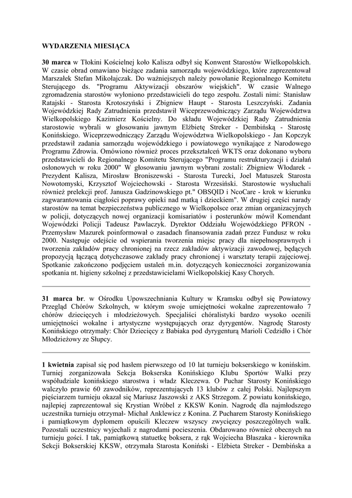 WYDARZENIA MIESIĄCA 30 marca w Tłokini Kościelnej koło Kalisza odbył się Konwent Starostów Wielkopolskich. W czasie obrad omawiano bieżące zadania samorządu wojewódzkiego, które zaprezentował Marszałek Stefan Mikołajczak. Do ważniejszych należy powołanie Regionalnego Komitetu Sterującego ds. "Programu Aktywizacji obszarów wiejskich". W czasie Walnego zgromadzenia starostów wyłoniono przedstawicieli do tego zespołu. Zostali nimi: Stanisław Ratajski - Starosta Krotoszyński i Zbigniew Haupt - Starosta Leszczyński. Zadania Wojewódzkiej Rady Zatrudnienia przedstawił Wiceprzewodniczący Zarządu Województwa Wielkopolskiego Kazimierz Kościelny. Do składu Wojewódzkiej Rady Zatrudnienia starostowie wybrali w głosowaniu jawnym Elżbietę Streker - Dembińską - Starostę Konińskiego. Wiceprzewodniczący Zarządu Województwa Wielkopolskiego - Jan Kopczyk przedstawił zadania samorządu wojewódzkiego i powiatowego wynikające z Narodowego Programu Zdrowia. Omówiono również proces przekształceń WKTS oraz dokonano wyboru przedstawicieli do Regionalnego Komitetu Sterującego "Programu restrukturyzacji i działań osłonowych w roku 2000" W głosowaniu jawnym wybrani zostali: Zbigniew Włodarek Prezydent Kalisza, Mirosław Broniszewski - Starosta Turecki, Joel Matuszek Starosta Nowotomyski, Krzysztof Wojciechowski - Starosta Wrzesiński. Starostowie wysłuchali również prelekcji prof. Janusza Gadzinowskiego pt." OBSQID i NcoCare - krok w kierunku zagwarantowania ciągłości poprawy opieki nad matką i dzieckiem". W drugiej części narady starostów na temat bezpieczeństwa publicznego w Wielkopolsce oraz zmian organizacyjnych w policji, dotyczących nowej organizacji komisariatów i posterunków mówił Komendant Wojewódzki Policji Tadeusz Pawlaczyk. Dyrektor Oddziału Wojewódzkiego PFRON Przemysław Mazurek poinformował o zasadach finansowania zadań przez Fundusz w roku 2000. Następuje odejście od wspierania tworzenia miejsc pracy dla niepełnosprawnych i tworzenia zakładów pracy chronionej na rzecz zakładów aktywizacji zawodowej, będących propozycją łączącą dotychczasowe zakłady pracy chronionej i warsztaty terapii zajęciowej. Spotkanie zakończono podjęciem ustaleń m.in. dotyczących konieczności zorganizowania spotkania nt. higieny szkolnej z przedstawicielami Wielkopolskiej Kasy Chorych. 31 marca br. w Ośrodku Upowszechniania Kultury w Kramsku odbył się Powiatowy Przegląd Chórów Szkolnych, w którym swoje umiejętności wokalne zaprezentowało 7 chórów dziecięcych i młodzieżowych. Specjaliści chóralistyki bardzo wysoko ocenili umiejętności wokalne i artystyczne występujących oraz dyrygentów. Nagrodę Starosty Konińskiego otrzymały: Chór Dziecięcy z Babiaka pod dyrygenturą Marioli Cedzidło i Chór Młodzieżowy ze Słupcy. 1 kwietnia zapisał się pod hasłem pierwszego od 10 lat turnieju bokserskiego w konińskim. Turniej zorganizowała Sekcja Bokserska Konińskiego Klubu Sportów Walki przy współudziale konińskiego starostwa i władz Kleczewa. O Puchar Starosty Konińskiego walczyło prawie 60 zawodników, reprezentujących 13 klubów z całej Polski. Najlepszym pięściarzem turnieju okazał się Mariusz Jaszowski z AKS Strzegom. Z powiatu konińskiego, najlepiej zaprezentował się Krystian Wróbel z KKSW Konin. Nagrodę dla najmłodszego uczestnika turnieju otrzymał- Michał Anklewicz z Konina. Z Pucharem Starosty Konińskiego i pamiątkowym dyplomem opuścili Kleczew wszyscy zwycięzcy poszczególnych walk. Pozostali uczestnicy wyjechali z nagrodami pocieszenia. Obdarowano również obecnych na turnieju gości. I tak, pamiątkową statuetkę boksera, z rąk Wojciecha Błaszaka - kierownika Sekcji Bokserskiej KKSW, otrzymała Starosta Koniński - Elżbieta Streker - Dembińska a Prezes WOZB, Bolesław Gajny wręczył konińskiemu radnemu - Janowi Sidorowi, koszulkę Polskiego Związku Bokserskiego. Jednak najbardziej zadowoleni z imprezy wydawali się być kibice, o czym wymownie świadczyła wypełniona po brzegi Hala Sportowa w Kleczewie. 3 kwietnia w Urzędzie Miasta Konina na posiedzeniu Kapituły konkursu o. Statuetkę "Złotego Konia", przyznano nominacje do tego wyróżnienia pięciu konińskim firmom. Członkowie Kapituły, po zapoznaniu się ze wszystkimi zgłoszeniami, w drodze tajnego głosowania, wyłonili następujących pretendentów: Vin - Kon S.A., Przedsiębiorstwo Montażu Elektrycznego Elektromont 1, Przedsiębiorstwo Produkcyjno-Handlowe ARTSERVIS" i Przedsiebiorstwo Handlowo Produkcyjno Usługowe "ECOPACK" sp z o.o. Laureat, który zostanie ogłoszony na Konińskich Targach Przemysłowo - Budowlanych, w dniu 8 04.br., otrzyma jednocześnie nominację do "Wielkopolskiej Nagrody Jakości", przyznawanej przez Unię Wielkopolan. O tym, która firma została uhonorowana statuetką "Złotego Konia" - w relacji z Targów Przemysłowo - Budowlanych. 3 kwietnia w Starostwie Powiatowym w Koninie odbyło się posiedzenie Powiatowej Rady Zatrudnienia, które prowadził Prezydent Konina Kazimierz Pałasz. Ustalono kierunki wspierania form aktywizacji zawodowej, zaakceptowano wskaźniki dotyczące rozdziału środków na poszczególne gminy oraz przyjęto i zaakceptowano wnioski do Krajowego Urzędu Pracy na dwa programy specjalne. 4 kwietnia w Spławiu gmina Golina odbyło się posiedzenie Zarządu Powiatowego OSP. Omawiano wyniki w I kwartale oraz plany na przyszłość, a wśród nich najważniejsze wydarzenie, jakim są obchody 125 lecia Ochotniczej Straży Pożarnej. Główne obchody odbędą się dnia 13 maja o godz. 13.00 na Placu Wolności w Koninie. 4 kwietnia w Starostwie spotkała się Rada Przyjaciół Harcerstwa. Dyskutowano o przygotowaniach do akcji letniej młodzieży oraz o uroczystości nadania imienia Szarych Szeregów i Sztandaru Hufcowi Konin, jakie będzie miało miejsce w dniach 19-20 maja br. 5 kwietnia w Turku odbyła się narada Starostów byłego województwa konińsk