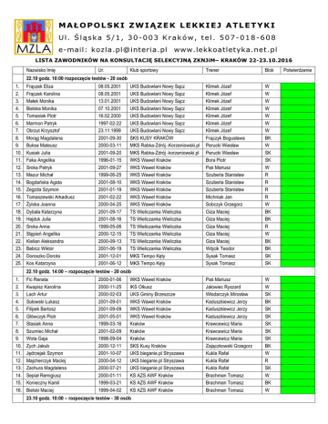 MAŁOPOLSKI ZWIĄZEK LEKKIEJ ATLETYKI Ul. Śląska 5/1, 30-003 Kraków, tel. 507-018-608 e-mail: [email protected] www.lekkoatletyka.net.pl LISTA ZAWODNIKÓW NA KONSULTACJĘ SELEKCYJNĄ ZKNJiM– KRAKÓW 22-23.10.2016 Nazwisko Imię Ur. Klub sportowy Trener Blok UKS Budowlani Nowy Sącz UKS Budowlani Nowy Sącz UKS Budowlani Nowy Sącz UKS Budowlani Nowy Sącz UKS Budowlani Nowy Sącz UKS Budowlani Nowy Sącz UKS Budowlani Nowy Sącz SKS KUSY KRAKÓW MKS Rabka-Zdrój -Korzeniowski.pl MKS Rabka-Zdrój -korzeniowski.pl WKS Wawel Kraków WKS Wawel Kraków WKS Wawel Kraków WKS Wawel Kraków WKS Wawel Kraków WKS Wawel Kraków WKS Wawel Kraków TS Wieliczanka Wieliczka TS Wieliczanka Wieliczka TS Wieliczanka Wieliczka TS Wieliczanka Wieliczka TS Wieliczanka Wieliczka TS Wieliczanka Wieliczka MKS Tempo Kęty MKS Tempo Kęty Klimek Józef Klimek Józef Klimek Józef Klimek Józef Klimek Józef Klimek Józef Klimek Józef Frączyk Bogusława Perucki Wiesław Perucki Wiesław Bora Piotr Paś Mariusz Szuberla Stanisław Szuberla Stanisław Szuberla Stanisław Michniak Jan Sobczyk Grzegorz Giza Maciej Giza Maciej Giza Maciej Giza Maciej Giza Maciej Wójcik Teodor Sysak Tomasz Sysak Tomasz W W W W W W W BK W SK SK W R R R R W BK BK R W BK BK SK SK Paś Mariusz Jałowiec Ryszard Włodarczyk Mirosław Kaduszkiewicz Jerzy Kaduszkiewicz Jerzy Kaduszkiewicz Jerzy Krawcewicz Maria Krawcewicz Maria Krawcewicz Maria Zajączkowski Grzegorz Kukla Rafał Kukla Rafał Kukla Rafał Brachman Tomasz Brachman Tomasz Brachman Tomasz W W SK BK SK SK SK SK SK BK W R SK W BK W 22.10 godz. 10:00 rozpoczęcie testów - 20 osób 1. 2. 3. 4. 5. 6. 7. 8. 9. 10. 11. 12. 13. 14. 15. 16. 17. 18. 19. 20. 21. 22. 23. 24. 25. Frączek Eliza Frączek Karolina Małek Monika Bielska Monika Tomasiak Piotr Marmon Patryk Obrzut Krzysztof Morąg Magdalena Buksa Mateusz Kusiak Julia Faka Angelika Sroka Patryk Mazur Michał Bogdańska Agata Zegzda Szymon Tomaszewski Arkadiusz Żylska Joanna Dybała Katarzyna Hajduk Julia Sroka Anna Stępień Angelika Kielian Aleksandra Babicz Wiktor Doroszko Dorota Kos Katarzyna 08.05.2001 08.05.2001 13.01.2001 07.10.2001 16.02.2000 1997-02-22 23.11.1999 2001-09-30 2000-03-11 2001-09-20 1996-01-15 2001-09-27 1999-06-25 2001-08-10 2001-01-19 2001-02-22 2000-04-25 2001-09-17 2001-08-16 1999-05-06 2000-12-15 2000-09-13 2001-06-19 2001-12-01 2001-06-12 22.10 godz. 14:00 – rozpoczęcie testów - 20 osób 1. 2. 3. 4. 5. 6. 7. 8. 9. 10. 11. 12. 13. 14. 15. 16. Fic Renata Kwapisz Karolina Lach Artur Sułowski Łukasz Filipek Bartosz Główczyk Piotr Stasiak Anna Szumiec Michał Wota Gaja Zych Jakub Jędrzejak Szymon Majcherczyk Maciej Zachura Magdalena Sepiał Remigiusz Konieczny Kamil Bielski Maciej 2000-01-06 2000-11-25 2000-02-03 2001-09-01 2001-09-09 2001-05-01 1999-03-16 2001-02-09 1998-09-04 2000-12-11 2001-10-07 2000-04-12 2000-07-21 2000-01-11 1999-03-21 1999-04-02 WKS Wawel Kraków IKS Olkusz UKS Gminy Brzeszcze WKS Wawel Kraków WKS Wawel Kraków WKS Wawel Kraków Kraków Kraków Kraków SKS Kusy Kraków UKS bieganie.pl Stryszawa UKS bieganie.pl Stryszawa UKS bieganie.pl Stryszawa KS AZS AWF Kraków KS AZS AWF Kraków KS AZS AWF Kraków 23.10 godz. 10:00 – rozpoczęcie testów - 30 osób Potwierdzenie MAŁOPOLSKI ZWIĄZEK LEKKIEJ ATLETYKI Ul. Śląska 5/1, 30-003 Kraków, tel. 507-018-608 e-mail: [email protected] www.lekkoatletyka.net.pl 1. 2. 3. 4. 5. 6. 7. 8. 9. 10. 11. 12. 13. 14. 15. 16. 17. 18. 19. 20. 21. 22. 23. 24. 25. 26. 27. 28. 29. 30. 31. 32. 33. 34. 35. 36. 37. 38. 39. 40. 41. 42. 43. 44. Zadora Michał Chojecki Radosław Kozioł Przemysław Nowak Jowita Serwin Antonina Skalak Izabela Sowa Oliwia Zyguła Gabriela Mleczko Krystian Szablowski Rafał Drwal Sara Kudlińska Julia Wsołek Aleksandra Widłak Paweł Wichary Kamil Goss Maciej Bąbka Julia Jurczyk Mariusz Karaś Mariola Konior Justyna Kubic Julia Kufel Jerzy Mencfel Marcin Mirek Katarzyna Mordyl Jakub Nowak Monika Sacha Filip Salamonowicz Wiktor Samel Jakub Zięba Szymon Ociepa Barbara Kościelny Patryk Dłutek Zofia Wasilewski Artur Brzęk Paulina Grobecki Daniel Kubala Kamil Różański Mateusz Opocki Michał Cisiński Maciej Bzdyl Mateusz Kaczmarczyk Paulina Kowalczyk Andrzej Kowalczyk Krzysztof 2000-03-17 2000-02-18 1999-01-23 1999-05-12 2001-06-23 1999-03-10 2001-01-16 2001-10-09 1999-01-14 2001-12-20 2001-02-20 1999-03-15 2001-09-15 1999-01-18 2000-08-24 1995-07-14 2000-05-05 1996-01-10 1996-12-04 1995-11-23 2000-02-19 2000-01-12 1996-05-04 1998-04-27 1996-01-15 1995-07-11 1996-06-25 1999-06-21 2001-01-23 1996-09-25 1997-05-21 1997-01-10 1996-04-27 1996-09-08 1999-03-02 2000-01-17 1999-01-04 1998-08-11 1998-09-13 1997-01-21 1997-04-14 2000-05-26 1998-11-30 2001-07-25 UKS Kusy Bukowno MLUKS Tarnów MLUKS Tarnów MLUKS Tarnów MLUKS Tarnów MLUKS Tarnów MLUKS Tarnów MLUKS Tarnów MLUKS Tarnów MLUKS Tarnów MLUKS Tarnów KS Cracovia 1906 Kraków KS Cracovia 1906 Kraków LKS Kłos Olkusz IKS Olkusz KS AZS AWF Kraków KS AZS AWF Kraków KS AZS AWF Kraków KS AZS AWF Kraków KS AZS AWF Kraków KS AZS AWF Kraków KS AZS AWF Kraków KS AZS AWF Kraków KS AZS AWF Kraków KS AZS AWF Kraków KS AZS AWF Kraków KS AZS AWF Kraków KS AZS AWF Kraków KS AZS AWF Kraków KS AZS AWF Kraków LLKS Pomorze Stargard LUKS Podium Kup KS AZS AWF Kraków KS Podlasie Białystok KU AZS PWSZ w Tarnowie KU AZS PWSZ w Tarnowie KU AZS PWSZ w Tarnowie KU AZS PWSZ w Tarnowie KU AZS PWSZ w Tarnowie WKS Wawel Kraków ULKS Fajfer 2001 Łapanów ULKS Fajfer 2001 Łapanów ULKS Fajfer 2001 Łapanów ULKS Fajfer 2001 Łapanów Kowina-Świderek Grażyna Grech Halina Golec Bartłomiej Golec Bartłomiej Grech Halina Golec Bartłomiej Grech Halina Styczyński Piotr Golec Bartłomiej Styczyński Piotr Golec Bartłomiej Kołodziej Roman Kołodziej Roman Mentlewicz Janusz Bujas Marcin ? Ślusarczyk Ewa Giza Andrzej Giza Andrzej Zapart Stanisław Giza Andrzej Giza Andrzej Giza Andrzej Zapart Stanisław Giza Andrzej Rusin Kazimierz Zawiła Łukasz Ślusarczyk Ewa Za
