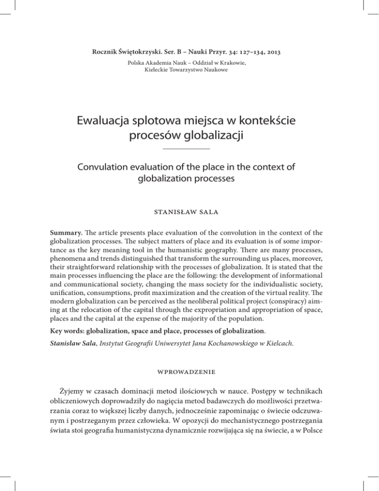 Rocznik Świętokrzyski. Ser. B – Nauki Przyr. 34: 127–134, 2013 Polska Akademia Nauk – Oddział w Krakowie, Kieleckie Towarzystwo Naukowe Ewaluacja splotowa miejsca w kontekście procesów globalizacji Convulation evaluation of the place in the context of globalization processes Stanisław Sala Summary. The article presents place evaluation of the convolution in the context of the globalization processes. The subject matters of place and its evaluation is of some importance as the key meaning tool in the humanistic geography. There are many processes, phenomena and trends distinguished that transform the surrounding us places, moreover, their straightforward relationship with the processes of globalization. It is stated that the main processes influencing the place are the following: the development of informational and communicational society, changing the mass society for the individualistic society, unification, consumptions, profit maximization and the creation of the virtual reality. The modern globalization can be perceived as the neoliberal political project (conspiracy) aiming at the relocation of the capital through the expropriation and appropriation of space, places and the capital at the expense of the majority of the population. Key words: globalization, space and place, processes of globalization. Stanisław Sala, Instytut Geografii Uniwersytet Jana Kochanowskiego w Kielcach. Wprowadzenie Żyjemy w czasach dominacji metod ilościowych w nauce. Postępy w technikach obliczeniowych doprowadziły do nagięcia metod badawczych do możliwości przetwarzania coraz to większej liczby danych, jednocześnie zapominając o świecie odczuwanym i postrzeganym przez człowieka. W opozycji do mechanistycznego postrzegania świata stoi geografia humanistyczna dynamicznie rozwijająca się na świecie, a w Polsce 128 Stanisław Sala nieco stojąca na uboczu innych subdyscyplin geograficznych. Wynika to z faktu postradzieckiej struktury nauk geograficznych w Polsce, w której w czasach radzieckich geografia humanistyczna była dyscypliną zabronioną. Dominującymi elementami w społeczeństwie socjalistycznym byli robotnicy i chłopi traktowani przez władzę w rzymskich kategoriach instrumentum votale . W tamtych czasach rozwój humanizmu był traktowany jako zagrożenie dla fundamentalnych podstaw systemu radzieckiego. Problematyka miejsca i jego ewaluacji posiada kluczowe znaczenie w geografii humanistycznej. Celem badawczym ewaluacji splotowej jest próba wyróżnienia i wartościowania procesów, zjawisk i trendów przekształcających otaczające nas miejsca bezpośrednio związanych z procesami globalizacji. Przedmiotem ewaluacji są procesy, tendencje i cechy miejsca uwikłanego w naturalnym kontekście zjawisk i procesów społecznych. W niniejszej pracy położono nacisk na procesy i tendencje wynikające z globalizacji, mających istotny wpływ na miejsce. Pod pojęciem globalizacji rozumiem ogół procesów zachodzących na płaszczyźnie społeczno-gospodarczej i politycznej, dążących do zacieśniania więzi między poszczególnymi państwami, regionami, miejscami czy osobami. Do procesów globalizacji należy zaliczyć rozwój: korporacji transnarodowych, wolnego rynku, telekomunikacji, w tym telewizji satelitarnej, Internetu, telefonii komórkowej i nowoczesnych środków transportu (Sala, 2006, 2007). Natomiast miejsce ujmuję szeroko. Z jednej strony stanowi ono część podległej jednostkom przestrzeni, którą człowiek poznaje oraz w której funkcjonuje (Lisowski, 2005), z drugiej strony miejsce jest obszarem fizycznym, będącym scenerią, czyli otoczeniem społecznych kontaktów, funkcjonującą jako humanistyczny kontekst społecznych interakcji (Pred, 1983 za: Wójcik, 2008). Rola i znaczenie miejsca Miejsca mają fundamentalne znaczenie dla rozwoju człowieka (Yi Fu Tuan, 2008; Skorowski P., 1998/99). W miejscach się rodzimy, zdobywamy wykształcenie, pracujemy i odpoczywamy. Miejsca zaspokajają nasze potrzeby życiowe. Przywiązanie do nich jest bardzo silne. Wymagamy, aby miejsca odpowiadały naszym wyobrażeniom i potrzebom. W jednych się czujemy dobrze, a w innych źle. Nasze samopoczucie jest bezpośrednio związane z jakością miejsc. Jakość ta ma wpływ nie tylko na nasze samopoczucie, ale także i samorealizację. Dlatego powinnyśmy dążyć do świadomego i celowego kształtowania miejsc pod kątem naszych wymagań, potrzeb i aspiracji. Rozwój każdej jednostki powinien odbywać się w zgodzie z naturalnymi uwarunkowaniami psychofizycznymi. Przyspieszanie tego procesu lub działania zmierzające Ewaluacja splotowa miejsca w kontekście procesów globalizacji 129 do wprowadzenia zmiennych modyfikujących nieuchronnie prowadzi do zaburzenia rozwoju człowieka poprzez występowanie zjawisk patologicznych, takich jak np.: stres, nerwice, stany lękowe czy syndrom wypalenia się. Czynniki zmieniające miejsca są konsekwencją funkcjonujących w społeczeństwie systemów decyzyjnych, które w czasach globalizacji w coraz większym stopniu wymykają się spod społecznej kontroli i zakorzeniających się w gremiach niewybieralnych – niedemokratycznych. Przesuwanie się środka ciężkości funkcji decyzyjnych w kierunku organów niewybieralnych pozbawia społeczeństwo możliwości skutecznego wpływania na kształt i jakość miejsc. Tracimy możliwość świadomego i celowego kształtowania ich i z pominięciem naszej woli jesteśmy wtrącani w miejsca nam obce, w których proces samorealizacji jest coraz bardziej zaburzany. Poszczególne komponenty wpływające na miejsce niosą ze sobą różnorakie wartości od pozytywnych przez obojętne do negatywnych. Wartościowanie zmiennych ma istotne znaczenie dla rozwoju psychofizycznego człowieka, który może się prawidłowo rozwijać tylko w miejscach o prawidłowej strukturze. W tym przypadku pod pojęciem prawidłowej struktury należy rozumieć zespół cech tworzących przyjazne środ