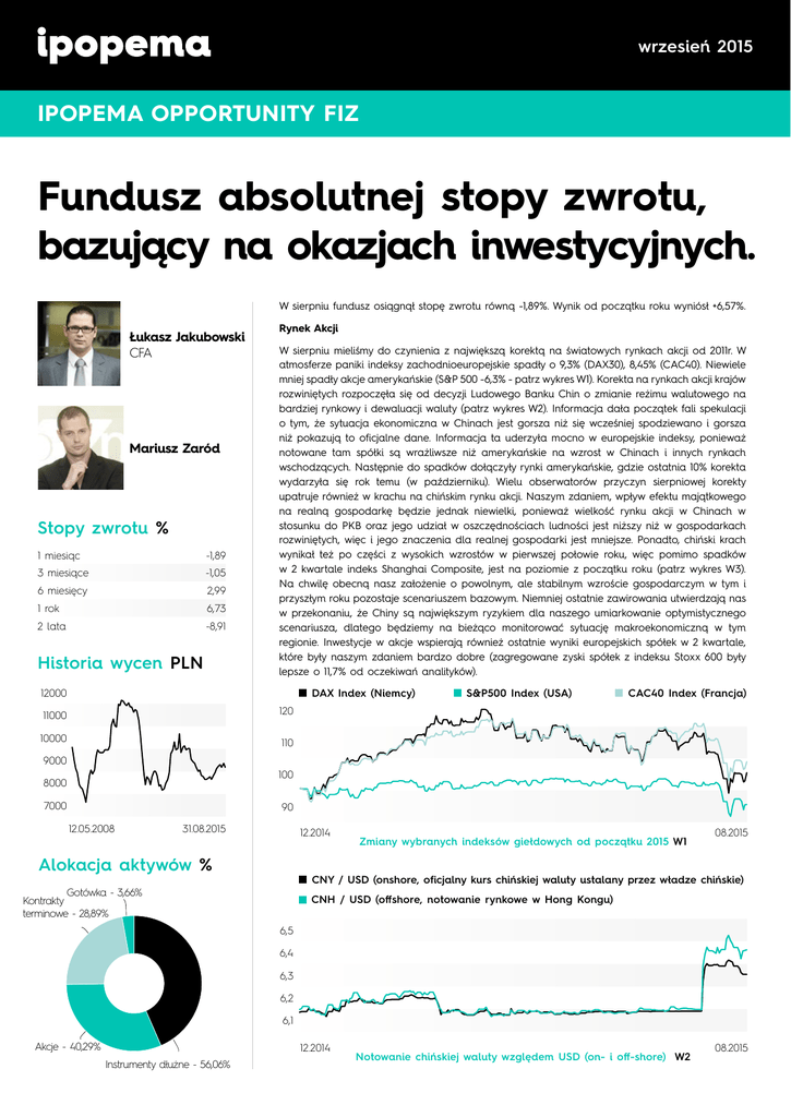 wrzesień 2015 IPOPEMA OPPORTUNITY FIZ Fundusz absolutnej stopy zwrotu, bazujący na okazjach inwestycyjnych. W sierpniu fundusz osiągnął stopę zwrotu równą -1,89%. Wynik od początku roku wyniósł +6,57%. Łukasz Jakubowski CFA Mariusz Zaród Stopy zwrotu % 1 miesiąc -1,89 3 miesiące -1,05 6 miesięcy 2,99 1 rok 6,73 2 lata -8,91 Historia wycen PLN Rynek Akcji W sierpniu mieliśmy do czynienia z największą korektą na światowych rynkach akcji od 2011r. W atmosferze paniki indeksy zachodnioeuropejskie spadły o 9,3% (DAX30), 8,45% (CAC40). Niewiele mniej spadły akcje amerykańskie (S&P 500 -6,3% - patrz wykres W1). Korekta na rynkach akcji krajów rozwiniętych rozpoczęła się od decyzji Ludowego Banku Chin o zmianie reżimu walutowego na bardziej rynkowy i dewaluacji waluty (patrz wykres W2). Informacja dała początek fali spekulacji o tym, że sytuacja ekonomiczna w Chinach jest gorsza niż się wcześniej spodziewano i gorsza niż pokazują to oficjalne dane. Informacja ta uderzyła mocno w europejskie indeksy, ponieważ notowane tam spółki są wrażliwsze niż amerykańskie na wzrost w Chinach i innych rynkach wschodzących. Następnie do spadków dołączyły rynki amerykańskie, gdzie ostatnia 10% korekta wydarzyła się rok temu (w październiku). Wielu obserwatorów przyczyn sierpniowej korekty upatruje również w krachu na chińskim rynku akcji. Naszym zdaniem, wpływ efektu majątkowego na realną gospodarkę będzie jednak niewielki, ponieważ wielkość rynku akcji w Chinach w stosunku do PKB oraz jego udział w oszczędnościach ludności jest niższy niż w gospodarkach rozwiniętych, więc i jego znaczenia dla realnej gospodarki jest mniejsze. Ponadto, chiński krach wynikał też po części z wysokich wzrostów w pierwszej połowie roku, więc pomimo spadków w 2 kwartale indeks Shanghai Composite, jest na poziomie z początku roku (patrz wykres W3). Na chwilę obecną nasz założenie o powolnym, ale stabilnym wzroście gospodarczym w tym i przyszłym roku pozostaje scenariuszem bazowym. Niemniej ostatnie zawirowania utwierdzają nas w przekonaniu, że Chiny są największym ryzykiem dla naszego umiarkowanie optymistycznego scenariusza, dlatego będziemy na bieżąco monitorować sytuację makroekonomiczną w tym regionie. Inwestycje w akcje wspierają również ostatnie wyniki europejskich spółek w 2 kwartale, które były naszym zdaniem bardzo dobre (zagregowane zyski spółek z indeksu Stoxx 600 były lepsze o 11,7% od oczekiwań analityków). DAX Index (Niemcy) 12000 11000 120 10000 110 S&P500 Index (USA) CAC40 Index (Francja) 9000 100 8000 7000 90 12.05.2008 31.08.2015 12.2014 Alokacja aktywów % Zmiany wybranych indeksów giełdowych od początku 2015 W1 08.2015 CNY / USD (onshore, oficjalny kurs chińskiej waluty ustalany przez władze chińskie) Gotówka - 3,66% CNH / USD (offshore, notowanie rynkowe w Hong Kongu) Kontrakty terminowe - 28,89% 6,5 6,4 6,3 6,2 6,1 Akcje - 40,29% 12.2014 Instrumenty dłużne - 56,06% Notowanie chińskiej waluty względem USD (on- i off-shore) W2 08.2015 wrzesień 2015 IPOPEMA OPPORTUNITY FIZ Waluty % EUR - 9,94% Wobec tego, sierpniowe spadki traktujemy jako korektę, na którą czekaliśmy od kwietnia br. i w związku z tym wykorzystaliśmy ją do zwiększenia zaangażowania w akcje. Uważamy, że duża przecena, wciąż dobre wyniki spółek, a także korzystna sezonowość rynku akcji za tym przemawia. Niemniej, biorąc pod uwagę skalę korekty, liczymy się z tym, że najbliższe tygodnie będą charakteryzować się podwyższoną zmiennością. Niemniej w naszym bazowym scenariuszu przyjmujemy stopniowy powrót rynków akcji w okolice poziomów wsparcia jeszcze sprzed ostatnich mocnych spadków. Podobny scenariusz rozegrał się na rynku długu w okresie od kwietnia do lipca 2015 roku (pod koniec kwietnia mieliśmy podobne globalne i paniczne spadki na rynku długu, które wykorzystaliśmy do zakupów przecenionych obligacji). Stopniowe zwiększanie alokacji w sierpniu było głównym czynnikiem, który wpłynął na ujemną stopę zwrotu w ub. miesiącu, gdyż skala paniki, z jaką mieliśmy do czynienia nie była przez nas oczekiwana. Liczymy jednak, że w horyzoncie kilku miesięcy inwestycja ta opłaci się z nawiązką. TRY - 2,08% USD - 17,94% PLN - 70,04% Sektory % Banki 16,64 Przemysł motoryzacyjny 9,36 Inne usługi 7,05 Przemysł metalowy 6,64 Informatyka 6,03 Rynek kapitaowy 5,15 Media 4,76 Handel hurtowy 4,37 Finanse - Inne 4,35 Budownictwo 3,71 Deweloperzy 3,69 Gry komputerowe 3,57 Handel detaliczny 3,08 e-Handel 3,07 Pozostałe 18,53 Ze innych wartych uwagi zmian, jakie miały miejsce na portfelu w ostatnim miesiącu należy uznać zamknięcie inwestycji w akcje indyjskie. Miało to miejsce po informacji o dewaluacji waluty w chinach przez Ludowy Bank Chin. Uznaliśmy, że ta decyzja może mieć negatywny wpływ perspektywy gospodarcze krajów rozwijających się, zwłaszcza z regionu Azji PołudniowoWschodniej. Rynek długu. Sierpień był spokojnym miesiącem na polskim rynku długu. Rentowność głównych benchmarków pozostała bez zmian w stosunku do końca lipca. Na koniec sierpnia rentowności wynosiły 2,93% w przypadku obligacji 10-letnich, 2,43% dla obligacji 5-letnich, a dwuletni benchmark charakteryzował się rentownością 1,79% (patrz wykres W4). Początek miesiąca przyniósł osłabienie obligacji w ślad za rynkiem niemieckim, ale druga dekada sierpnia odwróciła tą tendencję. Rentowności najdłuższych obligacji obniżyły się o prawie 40bp. Ostatnie dni były jednak negatywne dla posiadaczy obligacji i rentowności powróciły do poziomów z początku miesiąca. W dalszej części roku oczekujemy wzrostów cen obligacji, w związku z odłożeniem w czasie podwyżek stóp procentowych w USA oraz utrzymaniem środowiska deflacyjnego, w związku ze spadającymi cenami surowców i dewaluacją chińskiej waluty (patrz wykres W2). Shanghai Composite Index A-Shares (Chiny) 