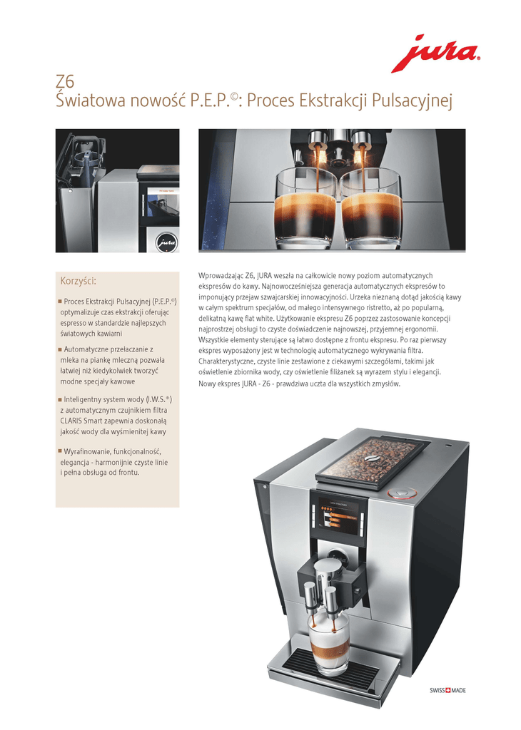 Światowa nowość P.E.P.®: Proces Ekstrakcji Pulsacyjnej W p r o w a d z a j ą c Z 6 , J U R A weszła n a c a ł k o w i c i e n o w y p o z i o m Korzyści: automatycznych e k s p r e s ó w d o k a w y . Najnowocześniejsza g e n e r a c j a a u t o m a t y c z n y c h e k s p r e s ó w t o • P r o c e s E k s t r a k c j i P u l s a c y j n e j (P.E.P.©) o p t y m a l i z u j e c z a s e k s t r a k c j i oferując espresso w standardzie najlepszych światowych kawiarni i m p o n u j ą c y p r z e j a w s z w a j c a r s k i e j i n n o w a c y j n o ś c i . U r z e k a nieznaną d o t ą d jakością k a w y w c a ł y m s p e k t r u m specjałów, o d m a ł e g o i n t e n s y w n e g o r i s t r e t t o , aż p o popularną, delikatną k a w ę flat w h i t e . U ż y t k o w a n i e e k s p r e s u Z 6 p o p r z e z z a s t o s o w a n i e k o n c e p c j i n a j p r o s t r z e j obsługi t o c z y s t e d o ś w i a d c z e n i e n a j n o w s z e j , p r z y j e m n e j e r g o n o m i i . W s z y s t k i e e l e m e n t y sterujące są ł a t w o d o s t ę p n e z f r o n t u e k s p r e s u . P o r a z p i e r w s z y • A u t o m a t y c z n e przełaczanie z e k s p r e s w y p o s a ż o n y j e s t w t e c h n o l o g i ę a u t o m a t y c z n e g o w y k r y w a n i a filtra. m l e k a n a piankę m l e c z n ą p o z w a ł a C h a r a k t e r y s t y c z n e , c z y s t e linie z e s t a w i o n e z c i e k a w y m i s z c z e g ó ł a m i , t a k i m i j a k łatwiej niż k i e d y k o l w i e k t w o r z y ć oświetlenie z b i o r n i k a w o d y , c z y oświetlenie filiżanek są w y r a z e m s t y l u i e l e g a n c j i . m o d n e specjały kawowe N o w y ekspres J U R A - Z 6 - p r a w d z i w a uczta dla w s z y s t k i c h zmysłów. • I n t e l i g e n t n y s y s t e m w o d y (I.W.S.®) z a u t o m a t y c z n y m c z u j n i k i e m filtra C L A R I S S m a r t z a p e w n i a doskonałą jakość w o d y dla wyśmienitej • Wyrafinowanie, kawy funkcjonalność, e l e g a n c j a - h a r m o n i j n i e c z y s t e linie i pełna obsługa o d f r o n t u . Z6 Dane techniczne Standardy JURA Design i materiały Regulowana jednostka zaparzająca od 6 g do 15 g Regulacja szerokości wylewki kawy 21 - 50 mm Inteligentny System Wstępnego zaparzania (I.P.B.A.S.©) Regulacja wysokości podwójnej wylewki 80 - 153 mm Proces Ekstrakcji Pulsacyjnej (P.E.P.©) Regulacja wysokości wylewki gorącej wody 80 - 153 mm Możliwość stosowania kawy mielonej Poświetlenie filiżanki białe/bursztynowe Funkcja gorącej wody Podświetlenie zbiornika na wodę - niebieskie • • Tryb oszczędzania energii (Energy Save Mode, E.S.M.©) Młynek Aroma Z6 - w liczbach G3 Inteligentny system wody (I.W.S.®) z automatycznym czujnikiem filtra CLARIS Smart Zbiornik na wodę Wysokowydajna pompa, 15 bar Napięcie / Moc 230 V AC / 1450 W System ogrzewania - Termoblok Zintegrowany program konserwacji Pobór energii bez / z E.S.M.© 16 Wh / 6 Wh Pobór energii w trybie Stand-by Zintegrowany program czyszczenia systemu mlecznego < 0,01 W Waga Regulacja twardości wody 11,5 kg Wymiary (Szer. x Wys. x Gł.) Przełącznik Zero-Energy Kolor 32 * 37,5 45 cm Srebrny satynowy _ 2.4J Zbiornik na ziarna kawy z funkcją Aroma Protection 280 g x Swiss made Hygiene standards Korzyści Możliwość połączenia bezprzewodowego Kolorowy wyświetlacz TFT www.tuv.com ID 0000027526 Aktywny monitoring ilości ziaren kawy Aktywny monitoring napełnienia tacy ociekowej Wyświetlanie statusu konserwacji Ustawienia i opcje programowania Programowanie indywidualnej ilości wody B Ilość wody ustawiana podczas przygotowywania napoju • Programowanie indywidualnej mocy kawy 10 poziomów Moc kawy ustawiana podczas przygotowywania napoju 10 poziomów Kopiowanie, repozycjonowanie i personalizacja produktów cg E OJ B Programowanie temperatury mleka 10 poziomów Programowanie temperatury pianki mlecznej 10 poziomów Programowanie temperatury parzenia 3 poziomy Programowanie temperatury gorącej wody 3 poziomy Programowanie czasu wyłączenia OJ O" OJ u s 5 c o OJ O E o c Ol OJ 1 _ _ J U R A - If y o u l o v e c o f f e e