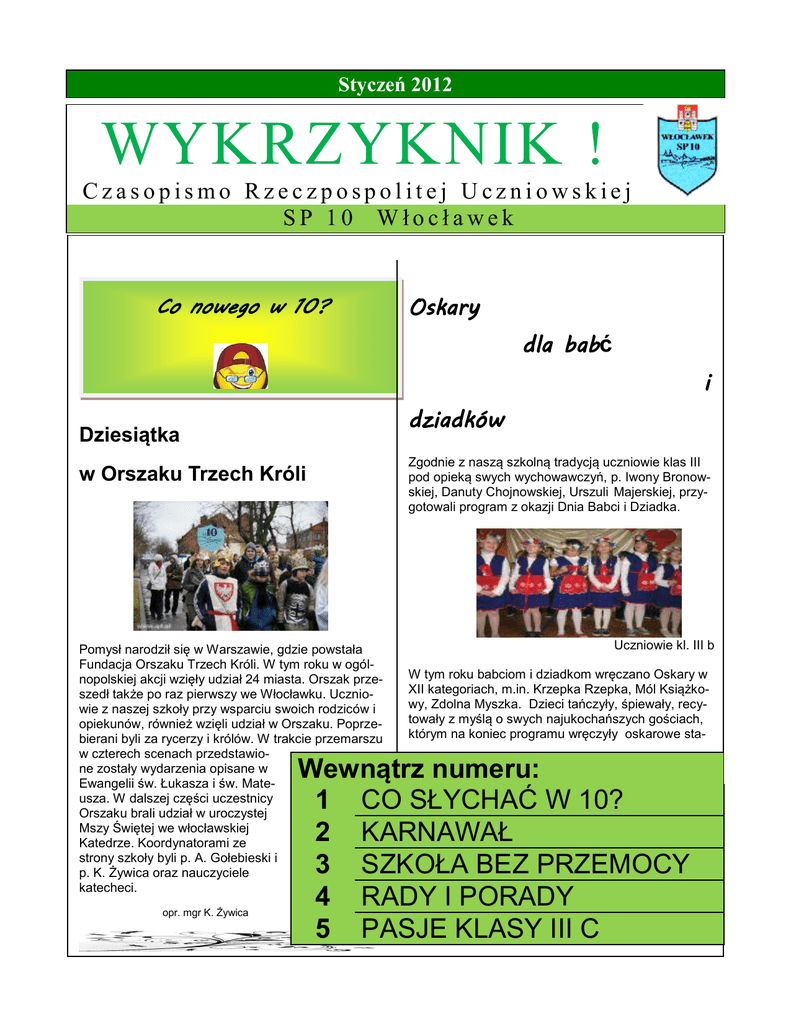 Styczeń 2012 WYKRZYKNIK ! Czasopismo Rzeczpospolitej Uczniowskiej SP 10 Włocławek Co nowego w 10? Oskary dla babć i dziadków Dziesiątka w Orszaku Trzech Króli Pomysł narodził się w Warszawie, gdzie powstała Fundacja Orszaku Trzech Króli. W tym roku w ogólnopolskiej akcji wzięły udział 24 miasta. Orszak przeszedł także po raz pierwszy we Włocławku. Uczniowie z naszej szkoły przy wsparciu swoich rodziców i opiekunów, również wzięli udział w Orszaku. Poprzebierani byli za rycerzy i królów. W trakcie przemarszu w czterech scenach przedstawione zostały wydarzenia opisane w Ewangelii św. Łukasza i św. Mateusza. W dalszej części uczestnicy Orszaku brali udział w uroczystej Mszy Świętej we włocławskiej Katedrze. Koordynatorami ze strony szkoły byli p. A. Gołebieski i p. K. Żywica oraz nauczyciele katecheci. opr. mgr K. Żywica Zgodnie z naszą szkolną tradycją uczniowie klas III pod opieką swych wychowawczyń, p. Iwony Bronowskiej, Danuty Chojnowskiej, Urszuli Majerskiej, przygotowali program z okazji Dnia Babci i Dziadka. Uczniowie kl. III b W tym roku babciom i dziadkom wręczano Oskary w XII kategoriach, m.in. Krzepka Rzepka, Mól Książkowy, Zdolna Myszka. Dzieci tańczyły, śpiewały, recytowały z myślą o swych najukochańszych gościach, którym na koniec programu wręczyły oskarowe sta- Wewnątrz numeru: 1 CO SŁYCHAĆ W 10? 2 KARNAWAŁ 3 SZKOŁA BEZ PRZEMOCY 4 RADY I PORADY 5 PASJE KLASY III C 2 WYKRZYKNIK ! tuetki. Nie zabrakło humoru i życzeń. Goście mogli też obejrzeć przygotowaną specjalnie na ten dzień prezentację multimedialną. Nasz szkoła uczestniczy we wszystkich obchodach ważnych wydarzeń, rocznic, świąt państwowych. 20 styczniam w rocznicę wyzwolenia naszego miasta spod okupacji niemieckiej, na pl. Wolności odbyła się uroczystość. Naszą szkołę reprezentował poczet sztandarowy i harcerze. Uczniowie kl. III a A po występie uczniowie zaprosili swoje babcie i dziadków na spotkanie do sal lekcyjnych. Red. Uczniowie kl. III c Spotkania wielopokoleniowe należą do tradycji naszej szkoły i cieszą się zainteresowaniem dzieci i dorosłych. Red. Bezpieczna szkoła – bezpieczny uczeń PAMIĘTAMY!! Nasza szkoła przystąpiła do ogólnopolskiego konkursu „Bezpieczna szkoła - bezpieczny uczeń”. Hasłem konkursu jest „Prawo, przyjaźń, tolerancja. Jego organizatorami są redakcje miesięczników Monitor Unii Europejskiej i Adwokat Rodzinny oraz Fundacja Państwo Obywatelskie. Do Komitetu Honorowego zaproszeni zostali m.in. Minister Edukacji Narodowej, Minister Sprawiedliwości, przedstawiciele sejmu i senatu, uczelni wyższych, Kuratoriów Oświaty, Policji. Celami konkursu jest popularyzowanie wśród uczniów podstawowych zasad funkcjonowania państwa prawnego i społeczeństwa obywatelskiego, w tym współżycia, poszanowania praw jednostki, w tym ucznia- 3 WYKRZYKNIK ! obywatela; przeciwdziałanie patologiom; tolerancji wobec ludzi o odmiennej kulturze, rasie, obyczajach; solidaryzmu społecznego. Poza tym konkurs ma służyć podniesieniu poziomu bezpieczeństwa szkoły i uczniów. Przed nami wiele zadań, m. in. pokaz udzielania pierwszej pomocy, zajęcia na temat cyberprzemocy, przedstawienie na temat tolerancji, audycje emitowane przez szkolny radiowęzeł, konkursy literackie i plastyczne, spotkania z przedstawicielami Policji, Straży Miejskiej, PCK, MOPR i MOPS. KARNAWAŁ . Karnawał w Hiszpanii Najbardziej oryginalnym i coraz bardziej popularnym miejscem na świętowanie w karnawale staje się wybrzeże Riwiery Francuskiej. Na dwa tygodnie przed Mardi Gras – tłustym „wtorkiem”, to ostatni dzień karnawału we Francji, podczas którego Francuzi jedzą pączki, ciasteczka, naleśniki, czy gofry, Nicea staje się najbardziej kolorowym miejscem na ziemi. W okresie karnawału Nicea staje się miastem „przebierańców”, muzyki, kolorowych świateł i roztańczonych ludzi. Platformy muzyków, tancerek, czarownic, akrobatów na szczudłach wypełniają piękne ulice miasta. Pojawiają się niesamowicie udekorowane platformy kwiatowe, oraz słynna bitwa kwiatowa, gdzie w tłum gapiów przebierańcy rzucają naręczami mimozy. Dodatkowo, co roku odbywa się parada świateł. Radośni ludzie świętują na ulicach miasta od rana do późnych godzin nocnych, popijając wykwintny Kir Royal (wino musujące z creme de cassis). źródło: http://www.prowansja.pl/?p=389 Karnawał w Brazylii Karnawał to czas maskarad. I tak np. w Laza (Ourense, Galicia) - przebierańcy zwani Os Peliqueiros odziani w dziwaczne kostiumy z krowimi dzwonkami u pasów i roześmiane maski, w ostatnią niedzielę karnawału wychodzą na ulice wymachują rózgami. Mogą oni chłostać gapiów, a ci nie mogą oddać. Następnego ranka (w poniedziałek) odbywa się walka na mąkę, wodę i mrówki... Karnawał w tym mieście kończy się odczytaniem "Oślego Testamentu". źródło: http://www.odyssei.com/pl/travel-tips/4688.html Karnawał we Francji Jednym z najbardziej znanych form karnawałowych w Brazylii jest zabawa w Rio de Janeiro. Ogólnie przyjęło się mówić, że karnawał brazylijski jest jednym z najbardziej barwnych wydarzeń na świecie. Tradycje karnawału w Brazylii sięgają pierwszej połowy siedemnastego wieku, a dokładniej daty około 1641. Sama zabawa w Rio de Janeiro trwa pięć dni ale bez względu na porę dnia, jest równie dynamiczna. Forma opiera się głównie na wielkiej paradzie i sam początek dokonuje się od przekazania uczestnikom karnawału kluczy do miasta. Tradycją 4 rozpoczęcia jest także pokaz sztucznych ogni zakrojony na ogromną skalę. Zabawa trwa oczywiście w każdym miejscu Rio ale centralnym punktem pozostaje betonowa konstrukcja w formie stadionu z trybunami, zwana sambodromem. Pojawiają się w tym miejscu kolejni tancerze reprezentujący poszczególne szkoły samby. Oczywiście poza sambodromem można w niezliczonej liczbie miejsc spotkać korowody czy stacjonarnie 