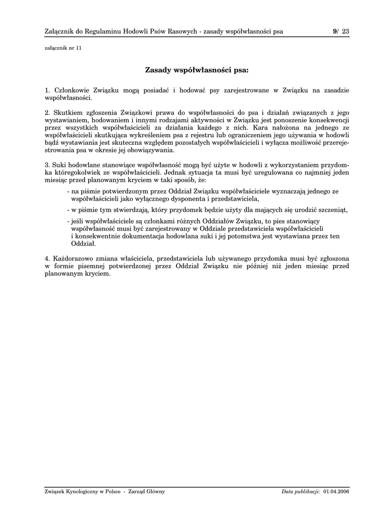 Załącznik do Regulaminu Hodowli Psów Rasowych - zasady współwłasności psa 9/ 23 załącznik nr 11 Zasady współwłasności psa: 1. Członkowie Związku mogą posiadać i hodować psy zarejestrowane w Związku na zasadzie współwłasności. 2. Skutkiem zgłoszenia Związkowi prawa do współwłasności do psa i działań związanych z jego wystawianiem, hodowaniem i innymi rodzajami aktywności w Związku jest ponoszenie konsekwencji przez wszystkich współwłaścicieli za działania każdego z nich. Kara nałożona na jednego ze współwłaścicieli skutkująca wykreśleniem psa z rejestru lub ograniczeniem jego używania w hodowli bądź wystawiania jest skuteczna względem pozostałych współwłaścicieli i wyłącza możliwość przerejestrowania psa w okresie jej obowiązywania. 3. Suki hodowlane stanowiące współwłasność mogą być użyte w hodowli z wykorzystaniem przydomka któregokolwiek ze współwłaścicieli. Jednak sytuacja ta musi być uregulowana co najmniej jeden miesiąc przed planowanym kryciem w taki sposób, że: - na piśmie potwierdzonym przez Oddział Związku współwłaściciele wyznaczają jednego ze współwłaścicieli jako wyłącznego dysponenta i przedstawiciela, - w piśmie tym stwierdzają, który przydomek będzie użyty dla mających się urodzić szczeniąt, - jeśli współwłaściciele są członkami różnych Oddziałów Związku, to pies stanowiący współwłasność musi być zarejestrowany w Oddziale przedstawiciela współwłaścicieli i konsekwentnie dokumentacja hodowlana suki i jej potomstwa jest wystawiana przez ten Oddział. 4. Każdorazowo zmiana właściciela, przedstawiciela lub używanego przydomka musi być zgłoszona w formie pisemnej potwierdzonej przez Oddział Związku nie później niż jeden miesiąc przed planowanym kryciem. Związek Kynologiczny w Polsce - Zarząd Główny Data publikacji: 01.04.2006 9/ 24 Załącznik do Regulaminu Hodowli Psów Rasowych - zasady współwłasności psa załącznik nr 11a - Wzór oświadczenia współwłaścicieli psa OŚWIADCZENIE WSPÓŁWŁAŚCICIELI PSA Oświadczamy, że niżej wymienione osoby: 1. .................................................................................................................... 2. .................................................................................................................... 3. .................................................................................................................... 4. .................................................................................................................... 5. .................................................................................................................... są członkami Związku Kynologicznego w Polsce, mają aktualnie opłacone składki członkowskie i posiadają na zasadach współwłasności psa/sukę: rasa ............................................................................................................. nazwa i przydomek ............................................................................................................. data urodzenia ............................................................................................................. nr tatuażu ............................................................................................................. nr PKR/KW ............................................................................................................. Oświadczamy, że przedstawicielem i wyłącznym dysponentem wyżej wymienionego psa/wymienionej suki jest: imię i nazwisko ............................................................................................................., jako jeden ze współwłaścicieli. Oświadczamy, że wyżej wymieniony/a pies/suka będzie zarejestrowany/zarejestrowana w Oddziale macierzystym przedstawiciela. Używany będzie przydomek hodowlany jednego ze współwłaścicieli: .......................................................................................................................................................................... (imię i nazwisko współwłaściciela, nazwa przydomka i jego numer) Oświadczamy, że odwołanie przedstawiciela może nastąpić wyłącznie z równoczesnym wskazaniem innej osoby której powierzamy tę funkcję i wymaga zgody wszystkich współwłaścicieli. Oświadczamy, że nie będziemy zgłaszali do Związku Kynologicznego w Polsce żadnych pretensji i roszczeń w przypadku rozbieżności pomiędzy współwłaścicielami i ewentualnych trudności w realizacji uprawnień wystawowych bądź hodowlanych wynikających ze sporów pomiędzy współwłaścicielami. Nie będziemy również zwracali się do Związku Kynologicznego w Polsce o rozstrzyganie jakichkolwiek sporów, które mogą powstać między współwłaścicielami. Data .................................................. Podpisy współwłaścicieli: 1. ................................................................ 2. ................................................................ 3. ................................................................ 4. ................................................................ 5. ................................................................ Związek Kynologiczny w Polsce - Zarząd Główny