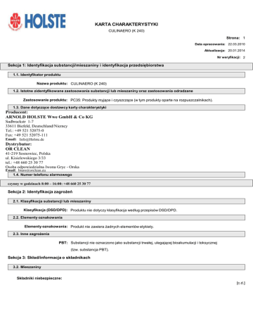 KARTA CHARAKTERYSTYKI CULINAERO (K 240) Strona: 1 Data opracowania: 22.03.2010 Aktualizacja: 20.01.2014 Nr weryfikacji: 2 Sekcja 1: Identyfikacja substancji/mieszaniny i identyfikacja przedsiębiorstwa 1.1. Identyfikator produktu Nazwa produktu: CULINAERO (K 240) 1.2. Istotne zidentyfikowane zastosowania substancji lub mieszaniny oraz zastosowania odradzane Zastosowanie produktu: PC35: Produkty myjące i czyszczące (w tym produkty oparte na rozpuszczalnikach). 1.3. Dane dotyczące dostawcy karty charakterystyki Producent: ARNOLD HOLSTE Wwe GmbH & Co KG Sudbrackstr 1-7 33611 Biefeld, Deutschland/Niemcy Tel.: +49 521 52075-0 Fax: +49 521 52075-111 Email: [email protected] Dystrybutor: OR CLEAN 41-219 Sosnowiec, Polska ul. Kisielewskiego 3/33 tel.: +48 660 25 30 77 Osoba odpowiedzialna Iwona Gryc - Orska Email: [email protected] 1.4. Numer telefonu alarmowego czynny w godzinach 8:00 – 16:00: +48 660 25 30 77 Sekcja 2: Identyfikacja zagrożeń 2.1. Klasyfikacja substancji lub mieszaniny Klasyfikacja (DSD/DPD): Produktu nie dotyczy klasyfikacja według przepisów DSD/DPD. 2.2. Elementy oznakowania Elementy oznakowania: Produkt nie zawiera żadnych elementów etykiety. 2.3. Inne zagrożenia PBT: Substancji nie oznaczono jako substancji trwałej, ulegającej bioakumulacji i toksycznej (tzw. substancja PBT). Sekcja 3: Skład/informacja o składnikach 3.2. Mieszaniny Składniki niebezpieczne: [c.d.] KARTA CHARAKTERYSTYKI CULINAERO (K 240) Strona: 2 ALKYLPOLYGLYCOSID EINECS - CAS Klasyfikacja (DSD/DPD) 68515-73-1 Klasyfikacja (CLP) Procento wa Xi: R41 - <5% Xn: R22; Xi: R41 - <5% FETTALKOHOLALKOXYLAT - - Sekcja 4: Środki pierwszej pomocy 4.1. Opis środków pierwszej pomocy Kontakt ze skórą Natychmiast zmyć dużą ilością wody z mydłem. Spożycie: Nie należy wywoływać wymiotów. Skonsultować się z lekarzem. 4.2. Najważniejsze ostre i opóźnione objawy oraz skutki narażenia Kontakt ze skórą W miejscu zetknięcia może wystąpić łagodne podrażnienie. Zanieczyszczenie oka Może wystąpić podrażnienie i ból. Może wystąpić silne łzawienie oczu. Spożycie: Mogą wystąpić mdłości oraz bóle żołądka. Działanie opóźnione: Brak danych. 4.3. Wskazania dotyczące wszelkiej natychmiastowej pomocy lekarskiej i szczególnego postępowania z poszkodowanym Postęp. natychmiast./szczególne: Niniejszą kartę charakterystyki substancji należy pokazać lekarzowi udzielającemu pomocy. Sekcja 5: Postępowanie w przypadku pożaru 5.1. Środki gaśnicze 5.2. Szczególne zagrożenia związane z substancją lub mieszaniną 5.3. Informacje dla straży pożarnej Informacje dla straży pożarnej: Zastosować niezależny aparat oddechowy. W celu zapobieżenia zetknięciu ze skórą i dostaniem do oczu należy nosić odzież ochronną. Sekcja 6: Postępowanie w przypadku niezamierzonego uwolnienia do środowiska 6.1. Indywidualne środki ostrożności, wyposażenie ochronne i procedury w sytuacjach awaryjnych 6.2. Środki ostrożności w zakresie ochrony środowiska 6.3. Metody i materiały zapobiegające rozprzestrzenianiu się skażenia i służące do usuwania skażenia 6.4. Odniesienia do innych sekcji Odniesienia do innych sekcji: Patrz punkt 8 karty bezpieczeństwa. Patrz punkt 13 karty bezpieczeństwa. Sekcja 7: Postępowanie z substancjami i mieszaninami oraz ich magazynowanie [c.d.] KARTA CHARAKTERYSTYKI CULINAERO (K 240) Strona: 3 7.1. Środki ostrożności dotyczące bezpiecznego postępowania 7.2. Warunki bezpiecznego magazynowania, łącznie z informacjami dotyczącymi wszelkich wzajemnych niezgodności 7.3. Szczególne zastosowanie(-a) końcowe Zastosowanie końcowe: Brak danych. Sekcja 8: Kontrola narażenia/środki ochrony indywidualnej 8.1. Parametry dotyczące kontroli Dopuszcz. stęż. w miejsc. zamiesz. Brak danych. 8.1. DNEL/PNEC DNEL / PNEC Brak danych. 8.2. Kontrola narażenia Środowiskowe: Brak szczególnych wymagań. Sekcja 9: Właściwości fizyczne i chemiczne 9.1. Informacje na temat podstawowych właściwości fizycznych i chemicznych Stan: Ciecz Kolor: Żółtozielony Rozpuszczalność w wodzie: Rozpuszczalny Lepkość: Małolepki Wartość lepkość: 10 s Gęstość względna: 1,019 pH: ca. 10,0 9.2. Inne informacje Inne informacje: Brak danych. Sekcja 10: Stabilność i reaktywność 10.1. Reaktywność Reaktywność: Substancja jest stabilna, jeśli przestrzegane są zalecane warunki transportu lub przechowywania. 10.2. Stabilność chemiczna Stabilność chemiczna: Stabilny w normalnych warunkach. 10.3. Możliwość występowania niebezpiecznych reakcji Reakcje niebezpieczne: Niebezpieczne reakcje nie zajdą w normalnych warunkach transportu lub przechowywania. 10.4. Warunki, których należy unikać [c.d.] KARTA CHARAKTERYSTYKI CULINAERO (K 240) Strona: 4 10.5. Materiały niezgodne 10.6. Niebezpieczne produkty rozkładu Sekcja 11: Informacje toksykologiczne 11.1. Informacje dotyczące skutków toksykologicznych Toksyczność ostra Brak danych. Objawy / drogi kontaktu Kontakt ze skórą W miejscu zetknięcia może wystąpić łagodne podrażnienie. Zanieczyszczenie oka Może wystąpić podrażnienie i ból. Może wystąpić silne łzawienie oczu. Spożycie: Mogą wystąpić mdłości oraz bóle żołądka. Działanie opóźnione: Brak danych. Inne informacje: Nie dotyczy. Sekcja 12: Informacje ekologiczne 12.1. Toksyczność Ekotoksyczność Brak danych. 12.2. Trwałość i zdolność do rozkładu Trwałość i zdolność degradacji: Ulega biodegradacji. 12.3. Zdolność do bioakumulacji Zdolność bioakumulacji: Brak zdolności bioakumulacji. 12.4. Mobilność w glebie Ruchliwość: Rozpuszczalny w wodzie. 12.5. Wyniki oceny właściwości PBT i vPvB PBT: Substancji nie oznaczono jako substancji trwałej, ulegającej bioakumulacji i toksycznej (tzw. substancja PBT). 12.6. Inne szkodliwe skutki działania Sekcja 13: Postępowanie z odpadami 13.1. Metody unieszkodliwiania odpadów Numer kodowy odpadu: 20 01 99 Uwaga: Zwraca się uwagę użytkowników n