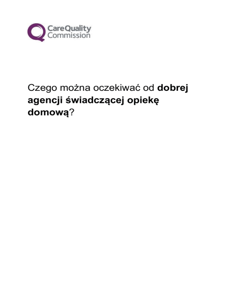 Czego można oczekiwać od dobrej agencji świadczącej opiekę domową? Niniejsza broszura przedstawia standardy opieki, leczenia lub pomocy jakiej pacjent (lub członkowie jego rodziny bądź znajomi) może oczekiwać od dobrej agencji świadczącej opiekę domową w Anglii. Opieka osobista obejmuje pomoc w spożywaniu posiłków, myciu się i korzystaniu z toalety. Nie obejmuje natomiast prac domowych takich jak sprzątanie, gotowanie lub robienie zakupów, chociaż niektóre agencje oferują pomoc również w tym zakresie. Oddzielna broszura została opracowana dla osób przebywających w domu opieki. Komisja ds. Jakości Opieki Zdrowotnej (ang. Care Quality Commission - CQC) Zadaniem Komisji jest monitorowanie i kontrolowanie usług w zakresie opieki zdrowotnej i społecznej dla dorosłych świadczonej między innymi przez agencje opieki domowej, domy opieki i szpitale. Celem kontroli jest zapewnienie opieki wysokiej jakości. Po jej przeprowadzeniu przyznajemy ocenę, która może być „wyróżniająca”, „dobra”, „wymagająca poprawy” lub „niespełniająca wymogów”. Jeżeli świadczone usługi wymagają poprawy, dokładamy wszelkich starań aby ich jakość została podniesiona. Podczas kontroli świadczonych usług zawsze sprawdzamy czy są one: bezpieczne skuteczne świadczone z należytą troską zaspokajające potrzeby pacjentów; oraz właściwie prowadzone Niniejsza broszura przedstawia standardy jakich pacjent może oczekiwać od agencji świadczącej opiekę domową, która otrzymała ocenę dobrą za każdy z powyższych obszarów. Niektóre agencje świadczą usługi na wyjątkowo wysokim poziomie, za który otrzymują ocenę wyróżniającą w jednym lub kilku z pięciu obszarów. Inne mogą wymagać poprawy, a w przypadku stwierdzenia poważnych zastrzeżeń są oceniane jako niespełniające wymogów. Łączymy poszczególne oceny cząstkowe przyznając agencji ocenę ogólną. Każda agencja musi umieścić ocenę w biurze na widocznym miejscu lub na stronie internetowej. Nawet w dobrej agencji niektóre obszary mogą wymagać poprawy, co pozwala mimo wszystko przyznać jej ogólną ocenę dobrą. Jeśli w agencji nie można znaleźć przyznanej jej oceny, należy poprosić o umieszczenie jej w widocznym miejscu. 2 Można oczekiwać, że dobra agencja świadcząca opiekę domową jest bezpieczna, ponieważ… Pacjent czuje się bezpieczny i chroniony przez personel, przy zapewnieniu mu jak największej niezależności umożliwiającej wykonywanie wybranych przez pacjenta czynności - niezależnie od niepełnosprawności lub innych potrzeb. Personel chroni godność i prawa człowieka pacjenta, szanuje jego indywidualność. Zapewniana jest właściwa liczba personelu, co zapewnia rzetelne świadczenie usług bez pośpiechu. Personel posiada właściwy zakres umiejętności gwarantujących bezpieczeństwo pacjenta. W razie konieczności nagłej zmiany pracownika świadczącego usługi, pacjentowi przekazywane są dane innej osoby, aby wiedział kogo ma oczekiwać. Pacjent chroniony jest przed wszelkimi formami zastraszania, nękania, wykorzystywania lub wyrządzania mu jakiejkolwiek innej krzywdy, co obejmuje również zaniedbanie i nadużycia finansowe. Personel szybko i otwarcie rozwiązuje wszelkie kwestie dotyczące incydentów i wypadków (bada je również w razie konieczności) i wyciąga z nich właściwe wnioski. Personel bezpiecznie podaje lekarstwa i właściwie je przechowuje. O ile to możliwe, agencja umożliwia pacjentowi udział w przeglądzie lekarstw oraz wspiera go w zachowaniu jak największej niezależności. Wyposażenie wykorzystywane przez agencję jest utrzymywane we właściwym stanie technicznym. Pacjent posiada pewność, że jego mienie jest bezpieczne i chronione. Można oczekiwać, że dobra agencja świadcząca opiekę domową jest skuteczna, ponieważ… Pacjent zostaje przedstawiony personelowi, który będzie zapewniać mu opiekę. Personel zapewnia pacjentowi właściwą opiekę, ponieważ jest wybierany ze względu na posiadaną wiedzę, kwalifikacje i umiejętności. Pacjent jest zawsze proszony o wyrażenie zgody (pozwolenia) na świadczoną opiekę, leczenie lub pomoc w zrozumiały dla niego sposób. Stosownie do sytuacji, znajomi i rodzina pacjenta mogą być angażowani w decyzje dotyczące jego opieki. Personel podejmuje działania we właściwym czasie zapewniając pacjentowi pozostawanie w dobrym zdrowiu. Personel zna potrzeby zdrowotne pacjenta i jego osobiste preferencje. Pacjent jest regularnie angażowany w decyzje dotyczące jego opieki i leczenia z zapewnieniem mu jak najszerszych możliwości wyboru i kontroli. Personel zapewnia pacjentowi właściwą żywność i napoje w wystarczającej ilości. Regularnie zasięgana jest opinia pacjenta na temat świadczonej mu opieki, a informacje zwrotne są zawsze pozytywne. Można oczekiwać, że dobra agencja opieki domowej świadczy usługi z należytą troską, ponieważ… 3 Personel zna historię życia pacjenta, jego upodobania, nadzieje i potrzeby, w tym potrzeby wynikające z wieku, niepełnosprawności, płci, tożsamości płciowej, rasy, wyznania lub wierzeń, orientacji seksualnej (niezależnie od tego czy pacjent jest homoseksualny, biseksualny czy heteroseksualny). Pacjent jest zachęcany do wyrażania swoich opinii niezależnie od złożoności jego potrzeb. Pacjent ma dostęp do usług rzeczników (osób wypowiadających się w jego imieniu). Personel zawsze traktuje pacjenta z godnością i szacunkiem. Personel ma czas na rozwinięcie pełnych zaufania relacji z pacjentem i ma na uwadze jego dobro. Można oczekiwać, że agencja świadcząca opiekę domową zaspokaja potrzeby pacjenta, ponieważ… Opieka, leczenie i pomoc świadczone pacjentowi ujęte są w formie pisemnego planu, określającego wymagane działania personelu w celu zapewnienia pacjentowi zindywidualizowanej opieki. Stosownie do sytuacji, rodzina i znajomi pacjenta biorą czyn