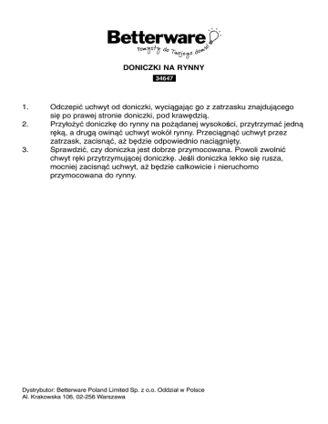 Doniczki na rynny 34647 1. 2. 3. Odczepić uchwyt od doniczki, wyciągając go z zatrzasku znajdującego się po prawej stronie doniczki, pod krawędzią. Przyłożyć doniczkę do rynny na pożądanej wysokości, przytrzymać jedną ręką, a drugą owinąć uchwyt wokół rynny. Przeciągnąć uchwyt przez zatrzask, zacisnąć, aż będzie odpowiednio naciągnięty. Sprawdzić, czy doniczka jest dobrze przymocowana. Powoli zwolnić chwyt ręki przytrzymującej doniczkę. Jeśli doniczka lekko się rusza, mocniej zacisnąć uchwyt, aż będzie całkowicie i nieruchomo przymocowana do rynny. Dystrybutor: Betterware Poland Limited Sp. z o.o. Oddział w Polsce Al. Krakowska 106, 02-256 Warszawa