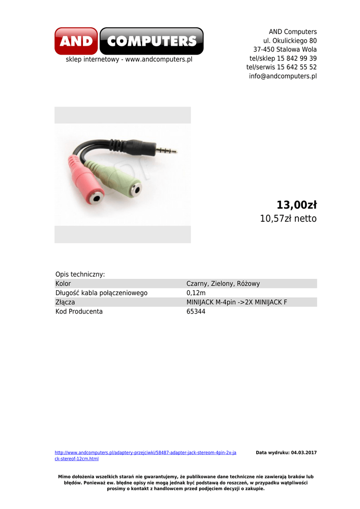 sklep internetowy - www.andcomputers.pl AND Computers ul. Okulickiego 80 37-450 Stalowa Wola tel/sklep 15 842 99 39 tel/serwis 15 642 55 52 [email protected] 13,00zł 10,57zł netto Opis techniczny: Kolor Długość kabla połączeniowego Złącza Kod Producenta Czarny, Zielony, Różowy 0,12m MINIJACK M-4pin ->2X MINIJACK F 65344 http://www.andcomputers.pl/adaptery-przejciwki/58487-adapter-jack-stereom-4pin-2x-ja ck-stereof-12cm.html Data wydruku: 04.03.2017 Mimo dołożenia wszelkich starań nie gwarantujemy, że publikowane dane techniczne nie zawierają braków lub błędów. Ponieważ ew. błędne opisy nie mogą jednak być podstawą do roszczeń, w przypadku wątpliwości prosimy o kontakt z handlowcem przed podjęciem decyzji o zakupie.