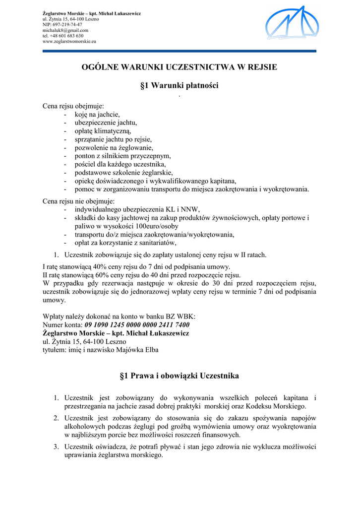 Żeglarstwo Morskie – kpt. Michał Łukaszewicz ul. Żytnia 15, 64-100 Leszno NIP: 697-219-74-47 [email protected] tel. +48 601 683 630 www.zeglarstwomorskie.eu OGÓLNE WARUNKI UCZESTNICTWA W REJSIE §1 Warunki płatności . Cena rejsu obejmuje: - koję na jachcie, - ubezpieczenie jachtu, - opłatę klimatyczną, - sprzątanie jachtu po rejsie, - pozwolenie na żeglowanie, - ponton z silnikiem przyczepnym, - pościel dla każdego uczestnika, - podstawowe szkolenie żeglarskie, - opiekę doświadczonego i wykwalifikowanego kapitana, - pomoc w zorganizowaniu transportu do miejsca zaokrętowania i wyokrętowania. Cena rejsu nie obejmuje: - indywidualnego ubezpieczenia KL i NNW, - składki do kasy jachtowej na zakup produktów żywnościowych, opłaty portowe i paliwo w wysokości 100euro/osoby - transportu do/z miejsca zaokrętowania/wyokrętowania, - opłat za korzystanie z sanitariatów, 1. Uczestnik zobowiązuje się do zapłaty ustalonej ceny rejsu w II ratach. I ratę stanowiącą 40% ceny rejsu do 7 dni od podpisania umowy. II ratę stanowiącą 60% ceny rejsu do 40 dni przed rozpoczęcie rejsu. W przypadku gdy rezerwacja następuje w okresie do 30 dni przed rozpoczęciem rejsu, uczestnik zobowiązuje się do jednorazowej wpłaty ceny rejsu w terminie 7 dni od podpisania umowy. Wpłaty należy dokonać na konto w banku BZ WBK: Numer konta: 09 1090 1245 0000 0000 2411 7400 Żeglarstwo Morskie – kpt. Michał Łukaszewicz ul. Żytnia 15, 64-100 Leszno tytułem: imię i nazwisko Majówka Elba §1 Prawa i obowiązki Uczestnika 1. Uczestnik jest zobowiązany do wykonywania wszelkich poleceń kapitana i przestrzegania na jachcie zasad dobrej praktyki morskiej oraz Kodeksu Morskiego. 2. Uczestnik jest zobowiązany do stosowania się do zakazu spożywania napojów alkoholowych podczas żeglugi pod groźbą wymówienia umowy oraz wyokrętowania w najbliższym porcie bez możliwości roszczeń finansowych. 3. Uczestnik oświadcza, że potrafi pływać i stan jego zdrowia nie wyklucza możliwości uprawiania żeglarstwa morskiego. Żeglarstwo Morskie – kpt. Michał Łukaszewicz ul. Żytnia 15, 64-100 Leszno NIP: 697-219-74-47 [email protected] tel. +48 601 683 630 www.zeglarstwomorskie.eu 4. Uczestnik jest zobowiązany do czynnego uczestnictwa we wszelkich obowiązkach związanych z przebywaniem (żeglowaniem) na jachcie morskim, w tym: a. Uczestnictwo w wachtach nawigacyjnych b. Przygotowanie posiłków c. Obsługa jachtu podczas żeglowania d. Sprzątanie jachtu po zakończeniu rejsu 5. Uczestnik jest zobowiązany do wpłacenia kaucji zwrotnej w wysokości 150€ lub opłacenia ubezpieczenia kaucji (bezzwrotnie) w wysokości 30€ od osoby na ręce kapitana rejsu przed rozpoczęciem rejsu, na poczet ewentualnych szkód wyrządzonych przez Uczestnika w trakcie trwania rejsu. Jeżeli nie wystąpią żadne szkody, kaucja zostanie zwrócona w całości po zakończeniu rejsu. 6. Uczestnik ma prawo do rezygnacji z udziału w rejsie na zasadach określonych w §4 niniejszej umowy. §3 Prawa i obowiązki Organizatora 1. Organizator zobowiązuje się do zapewnienia należytej opieki kapitana, który posiada odpowiednie uprawnienia do prowadzenia jachtu, wymagane przez przepisy kraju, w którym jacht został zarejestrowany. 2. Organizator zobowiązuje się do wystawienia „Opinii z Rejsu” oraz dokonania wpisu do książeczki żeglarskiej, które to dokumenty są potwierdzeniem odbycia stażu morskiego, koniecznego przy ubieganiu się o wyższe stopnie żeglarskie. 3. Organizator zastrzega sobie prawo do odwołania rejsu przed jego rozpoczęciem, z przyczyn od siebie niezależnych (np. działanie sił wyższych, uszkodzenie jachtu,) i nie będzie ponosił z tego tytułu żadnej odpowiedzialności. 4. Organizator nie dokonuje zwrotu niewykorzystanych świadczeń przez Uczestnika, z przyczyn leżących po stronie Uczestnika, w szczególności w sytuacji gdy stan zdrowia Uczestnika nie pozwala na Jego dalsze uczestnictwo w rejsie oraz w przypadku dobrowolnej rezygnacji przez Uczestnika z części lub całości rejsu. 5. Organizator zastrzega sobie prawo do zmiany portu zaokrętowania lub wyokrętowania wynikającej z niesprzyjających warunków atmosferycznych lub w przypadku awarii powstałej na skutek działania siły wyższej. Organizator dołoży wszelkich starań, aby poinformować wszystkich Uczestników o zmianie portu zaokrętowania lub wyokrętowania przynajmniej na 2 dni przed rozpoczęciem rejsu. 6. Organizator nie ponosi odpowiedzialności za zmiany w programie rejsu i inne niedogodności powstałe w trakcie trwania rejsu, z przyczyn od niego niezależnych, w szczególności w przypadkach działania siły wyższej, złych warunków atmosferycznych, awarii powstałych na jachcie w czasie trwania rejsu, zawinionego działania lub zaniechania Uczestnika. 7. Organizator nie ponosi odpowiedzialności za szkody powstałe na jachcie z winy Uczestnika noszące znamiona wandalizmu oraz za zniszczenia, których Uczestnik dokona pod wpływem alkoholu lub innych używek. Organizator ma prawo domagać się od Uczestnika zwrotu poniesionych kosztów na usunięcie szkody wynikłej z winy Uczestnika. Żeglarstwo Morskie – kpt. Michał Łukaszewicz ul. Żytnia 15, 64-100 Leszno NIP: 697-219-74-47 [email protected] tel. +48 601 683 630 www.zeglarstwomorskie.eu 8. Organizator nie ponosi odpowiedzialności za rzeczy Uczestnika pozostawione, zniszczone lub zgubione podczas rejsu. 9. Organizator ma prawo odstąpienia od umowy w przypadku gdy Uczestnik w sposób rażący burzy ustalony porządek rejsu, swoim działaniem lub zaniechaniem zagraża bezpieczeństwu jachtu i jego załogi oraz nie wykonuje obowiązków określonych w §3 ust. 1-4 niniejszej umowy. W przypadku spełnienia przesłanek z pkt. 9 § 3 Organizator zachowuje całość wpłaconej ceny rejsu, a Uczestnik nie ma prawa roszczeń w stosunku do Organizatora o zwrot poniesionych kosztów. §4 Warunki rezygnacji Uczestnika rejsu 1. Za datę rezy