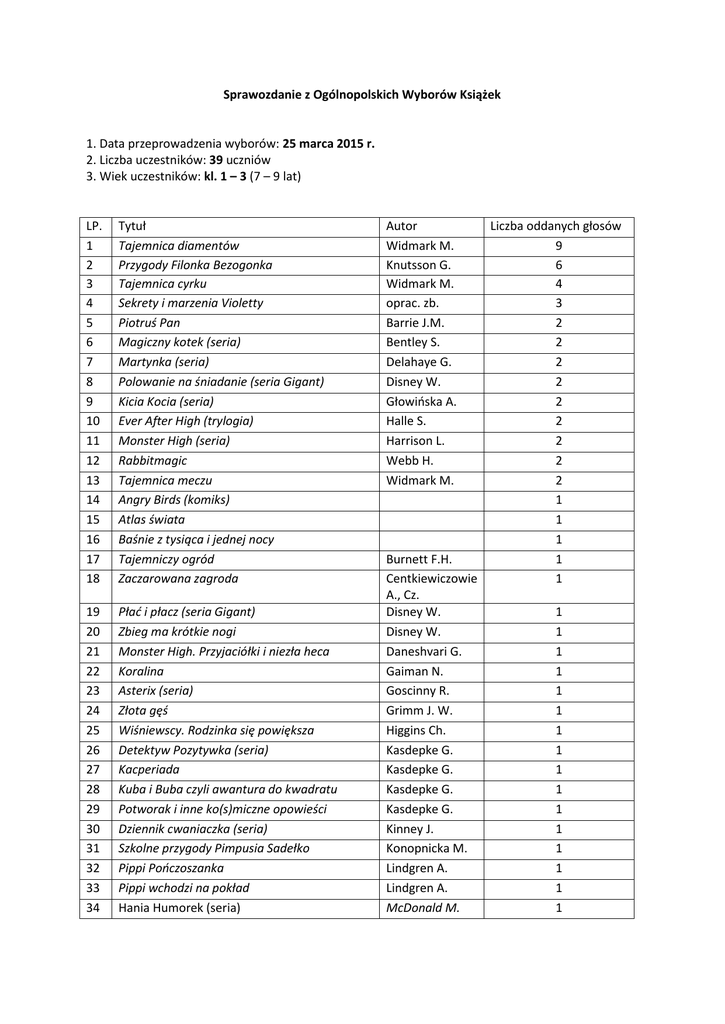 Sprawozdanie z Ogólnopolskich Wyborów Książek 1. Data przeprowadzenia wyborów: 25 marca 2015 r. 2. Liczba uczestników: 39 uczniów 3. Wiek uczestników: kl. 1 – 3 (7 – 9 lat) LP. 1 2 3 4 5 6 7 8 9 10 11 12 13 14 15 16 17 18 Tytuł Tajemnica diamentów Przygody Filonka Bezogonka Tajemnica cyrku Sekrety i marzenia Violetty Piotruś Pan Magiczny kotek (seria) Martynka (seria) Polowanie na śniadanie (seria Gigant) Kicia Kocia (seria) Ever After High (trylogia) Monster High (seria) Rabbitmagic Tajemnica meczu Angry Birds (komiks) Atlas świata Baśnie z tysiąca i jednej nocy Tajemniczy ogród Zaczarowana zagroda 19 20 21 22 23 24 25 26 27 28 29 30 31 32 33 34 Płać i płacz (seria Gigant) Zbieg ma krótkie nogi Monster High. Przyjaciółki i niezła heca Koralina Asterix (seria) Złota gęś Wiśniewscy. Rodzinka się powiększa Detektyw Pozytywka (seria) Kacperiada Kuba i Buba czyli awantura do kwadratu Potworak i inne ko(s)miczne opowieści Dziennik cwaniaczka (seria) Szkolne przygody Pimpusia Sadełko Pippi Pończoszanka Pippi wchodzi na pokład Hania Humorek (seria) Autor Widmark M. Knutsson G. Widmark M. oprac. zb. Barrie J.M. Bentley S. Delahaye G. Disney W. Głowińska A. Halle S. Harrison L. Webb H. Widmark M. Liczba oddanych głosów 9 6 4 3 2 2 2 2 2 2 2 2 2 1 1 1 Burnett F.H. 1 Centkiewiczowie 1 A., Cz. Disney W. 1 Disney W. 1 Daneshvari G. 1 Gaiman N. 1 Goscinny R. 1 Grimm J. W. 1 Higgins Ch. 1 Kasdepke G. 1 Kasdepke G. 1 Kasdepke G. 1 Kasdepke G. 1 Kinney J. 1 Konopnicka M. 1 Lindgren A. 1 Lindgren A. 1 McDonald M. 1 35 36 37 38 Baśniobór (seria) Gałka od łóżka Środek kapusty Najwyższa góra świata 39 40 41 42 43 44 45 46 47 48 49 50 51 52 53 54 Zuźka D Zołzik Pierwszakiem. Królowa ciastek Mała Cyganeczka Tomek Łebski (seria) O psie, który jeździł koleją Polscy poeci dzieciom Polscy poeci. Wiersze dla dzieci Malutka czarownica Harry Potter (seria) Scooby – Doo! Na tropie komiksów (seria) To nie książka Zniszcz ten dziennik A to historia! Opowiadania z dziejów Polski Przygody Tomka Sawyera Animal Magic Tajemnica galopu Tajemnica pływalni Mull B. Norton M. Nowak E. Onichimowska A. Park B. Piasecka W. Pichon L. Pisarski R. Preussler O. Rowling J.K. Smith K. Smith K. Szymeczko K. Twain M. Webb H. Widmark M. Widmark M. 1 1 1 1 1 1 1 1 1 1 1 1 1 1 1 1 1 1 1 1