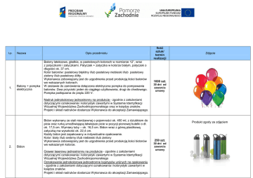 Lp. 1. Nazwa Balony + pompka elektryczna Opis przedmiotu Balony lateksowe, gładkie, w pastelowych kolorach w rozmiarze 12”, wraz z patyczkami i zatyczkami. Patyczek + zatyczka w kolorze białym, patyczek o długości ok. 37 cm. Kolor balonów: pastelowy błękitny i/lub pastelowy niebieski i/lub pastelowy zielony i/lub pastelowy Ŝółty. Wykonawca zobowiązany jest do uzgodnienia przed produkcją ilości balonów we wskazanych kolorach. W zestawie do zamówienia dołączona elektryczna pompka do pompowania balonów. Dwa przyciski: jeden do ciągłego uŜytkowania, drugi do chwilowego. Pompka podłączana do prądu 220 V. Ilość sztuk/ termin realizacji Zdjęcie 1000 szt. 30 dni od zawarcia umowy Nadruk jednokolorowy jednostronny na produkcie - zgodnie z załoŜeniami dotyczącymi oznakowania i kolorystyki zawartymi w Systemie Identyfikacji Wizualnej Województwa Zachodniopomorskiego oraz w księdze znaków. Projekt i skład nadruków dostarcza Wykonawca do akceptacji Zamawiającego. 2. Bidon Bidon wykonany ze stali nierdzewnej o pojemności ok. 450 ml, z dziubkiem do picia oraz rurką umoŜliwiającą łatwiejsze picie w pozycji pionowej butelki o dł. ok. 17,5 cm. Wymiary tuby – ok. 16,5 cm. Bidon wraz z górną plastikową zatyczką ma wysokość ok. 22,4 cm. KaŜdy bidon jest zapakowany w indywidualne opakowanie. Kolor: biały i/lub srebrny i/lub niebieski i/lub zielony Wykonawca zobowiązany jest do uzgodnienia przed produkcją ilości bidonów we wskazanym kolorze. Grawer laserowy jednostronny na produkcie - zgodnie z załoŜeniami dotyczącymi oznakowania i kolorystyki zawartymi w Systemie Identyfikacji Wizualnej Województwa Zachodniopomorskiego Oznakowanie jednokolorowe jednostronne logotypów unijnych na opakowaniu - zgodnie z załoŜeniami dotyczącymi oznakowania i kolorystyki zawartymi w księdze znaków. Projekt i skład nadruków dostarcza Wykonawca do akceptacji Zamawiającego. Produkt zgody ze zdjęciem 250 szt. 30 dni od zawarcia umowy 3. Bidon Bidon jest wykonany z jednowarstwowego aluminium i ma pojemność ok. 600 ml. Bidon posiada gumowane wykończenie. Kolor bidonu: niebieski i/lub zielony i/lub czarny i/lub pomarańczowy i/lub róŜowy i/lub biały KaŜdy bidon jest zapakowany w indywidualne opakowanie. Wykonawca zobowiązany jest do uzgodnienia przed produkcją ilości bidonów we wskazanym kolorze. Grawer laserowy jednostronny na produkcie - zgodnie z załoŜeniami dotyczącymi oznakowania i kolorystyki zawartymi w Systemie Identyfikacji Wizualnej Województwa Zachodniopomorskiego Oznakowanie jednokolorowe jednostronne logotypów unijnych na opakowaniu - zgodnie z załoŜeniami dotyczącymi oznakowania i kolorystyki zawartymi w księdze znaków. Projekt i skład nadruków dostarcza Wykonawca do akceptacji Zamawiającego. Naturalny balsam do ust z filtrem przeciwsłonecznym nie mniejszym niŜ SPF15. Testowany dermatologicznie. Balsam jest na smyczy. Kolor smyczy dopasowany kolorystycznie do koloru opakowania balsamu. Kolor opakowania: niebieski i/lub zielony i/lub granatowy i/lub biały i/lub Ŝółty i/lub czerwony i/lub róŜowy i/lub fioletowy KaŜdy balsam jest zapakowany w indywidualne opakowanie. 4. 5. Balsam do ust na smyczy Compac chusteczki Nadruk jednokolorowy na produkcie - zgodnie z załoŜeniami dotyczącymi oznakowania i kolorystyki zawartymi w Systemie Identyfikacji Wizualnej Województwa Zachodniopomorskiego Oznakowanie jednokolorowe jednostronne logotypów unijnych na opakowaniuzgodnie z załoŜeniami dotyczącymi oznakowania i kolorystyki zawartymi w księdze znaków. Projekt i skład nadruków dostarcza Wykonawca do akceptacji Zamawiającego. 10 szt. skompresowanych chusteczek celulozowych w kształcie pigułki w plastikowym opakowaniu. Po dodaniu wody chusteczki pęcznieją. Rozmiar chusteczek: ok. 230x230 mm, opakowania: ok. Ø 23 X 110 mm Opakowanie typu przeźroczyste i/lub mlecznobiałe Kolor chusteczek: biały Do opakowania dołączona instrukcja korzystania z chusteczek. Tuba z chusteczkami zapakowana indywidualnie w woreczek foliowy. Nadruk jednostronny jednokolorowy na tubie – zgodnie z załoŜeniami dotyczącymi oznakowania i kolorystyki zawartymi w księdze znaków. Projekt i skład nadruków dostarcza Wykonawca do akceptacji Zamawiającego. Produkt zgodny ze zdjęciem 250 szt. 30 dni od zawarcia umowy 200 szt. 30 dni od zawarcia umowy 1000 szt. 30 dni od zawarcia umowy 6. Czapka trucker Czapka bejsbolówka wykonana z poliestru i pianki o gr. ok. 4mm. 5 paneli i zatrzask. Czapka posiada daszek i siatkę w jednakowym kolorze. Kolor siatki i daszka: niebieski i/lub zielony i/lub czarny i/lub granatowy i/lub pomarańczowy i/lub czerwony i/lub Ŝółty Wykonawca zobowiązany jest do uzgodnienia przed produkcją ilości czapek we wskazanym kolorze. KaŜda czapka zapakowana indywidualnie. Oznakowanie jednostronne full kolor na produkcie - zgodnie z załoŜeniami dotyczącymi oznakowania i kolorystyki zawartymi w Systemie Identyfikacji Wizualnej Województwa Zachodniopomorskiego Nadruk jednokolorowy jednostronny logotypów unijnych na produkcie- zgodnie z załoŜeniami dotyczącymi oznakowania i kolorystyki zawartymi w księdze znaków. Projekt i skład nadruków dostarcza Wykonawca do akceptacji Zamawiającego. 7. Długopis z magnesem Długopis plastikowy z niebieskim i/lub czarnym wkładem i z magnetycznym okrągłym pinem na łańcuszku. Okrągły pin przyczepny do metalu (np. do lodówki). Wymiar wkładu do długopisu dopasowany do wielkości długopisu. Wykonawca zobowiązany jest do uzgodnienia przed dostawą ilości długopisów z wkładem niebieskim i/lub czarnym Kolor długopisu: biały z dodatkami w postaci włącznika/wyłącznika, elementu do którego jest mocowany łańcuszek, pinu od spodu itp. w kolorze niebieskim i/lub zielonym i/lub Ŝółtym i/lub białym Nadruk 4 kolory na pinie oraz na długopisie - zgodnie z załoŜeniami dotyczącymi oznakowania i kolorystyki zawartymi w Systemie Identyfikacji Wizualnej Wojewó