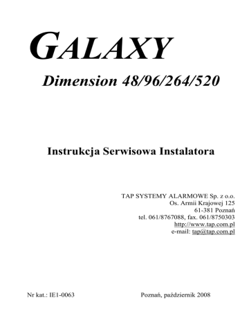 GALAXY Dimension 48/96/264/520 Instrukcja Serwisowa Instalatora TAP SYSTEMY ALARMOWE Sp. z o.o. Os. Armii Krajowej 125 61-381 Poznań tel. 061/8767088, fax. 061/8750303 http://www.tap.com.pl e-mail: [email protected] Nr kat.: IE1-0063 Poznań, październik 2008 SPIS TREŚCI Wstęp Rozdział 1: Przygotowanie do programowania Rozdział 2: Architektura Systemu Płyta centrali Galaxy Dimension Moduł rozszerzający magistralę RS485 Instalacja oraz okablowanie systemu Podłączenie centrali Galaxy Dimension do linii telefonicznej Zasilanie awaryjne - akumulator Zasilacz systemowy na płycie centrali Pamięć Magistrala komunikacyjna RS485 (Linie AB) Konfiguracja okablowania magistrali RS485 Warunki okablowania RS485 Linie dozorowe Adresowanie linii dozorowych Adresowanie linii dozorowych na płycie centrali Linia dozorowa pojedynczą czujką Linia dozorowa z kilkoma czujkami Linia dozorowa typu Klucz Linia dozorowa typu Przycisk Wyjścia Wyjścia - typowe zastosowania Złącze zewnętrznego komunikatora Gniazdo klucza SPI Rozdział 3: Moduły dodatkowe i rozszerzenia Wstęp Podłączenie Konfigurowanie Adresowanie Koncentrator (RIO) – C072 Adresowanie Instalacja koncentratora (RIO) Konfigurowanie koncentratora (RIO) Linie dozorowe Wyjścia Moduł RF RIO – C076 Funkcje Kompatybilność Instalacja modułu RF RIO Adresowanie modułu RF RIO Programowanie modułu RF RIO Zasilacz systemowy Galaxy Power RIO – P026 Konfiguracja Instrukcja instalacji Akumulator Test akumulatora Specyfikacje Zgodność z normą EN50131 1 3 5 6 7 8 9 10 10 10 11 11 12 13 13 14 15 17 17 18 18 19 20 21 23 23 23 23 23 25 25 25 25 26 26 27 27 28 28 28 29 33 33 34 35 35 35 35 Moduł Interfejsu drukarki – A134/A161 Moduł Telekom – E062 Moduł Interfejsu RS232 – E054 Połączenie z komputerem PC Podłączenie drukarki szeregowej Moduł ISDN – A211 Moduł Ethernet – E080 Dwukierunkowy moduł audio – C084 Multiplekser audio – C085 Galaxy Remote Servicing Suite Galaxy User Management Suite Rozdział 4: Klawiatury Klawiatura Galaxy Mk7/KeyProx Warunki zasilania - pobór mocy Podłączenie klawiatury/Keyprox do systemu Adresowanie Procedura instalacji klawiatury Dodanie klawiatury do systemu Usunięcie klawiatury z systemu Auto-test klawiatury Używanie klawiatury/Keyprox Galaxy KeyProx – CP038 Wstęp Adresowanie Działanie Typy kart Procedura automatycznego wczytywania karty Galaxy TouchCenter – CP040 Wstęp Procedura instalacji Galaxy TouchCenter Konfigurowanie Galaxy TouchCenter Ustawienia klawiatury Diagnostyka Specyfikacje Rozdział 5: Kontrola dostępu Kontrola dostępu oparta o grupy Użytkownicy i szablony dostępu Harmonogramy czasowe Galaxy DCM – C080 Czytnik MicroMax – MX11/03 Rozdział 6: Działanie systemu Opcje Menu Wprowadzenie Menu Pełne Szybkie Menu Dostęp do Menu Bezpośredni wybór opcji Sekwencyjny wybór opcji menu Automatyczne wyłączenie menu Tryb Inżyniera Wybranie Trybu Inżyniera Wyjście z Trybu Inżyniera Dostęp wielu użytkowników 36 37 38 38 39 40 41 42 43 45 45 47 47 47 48 48 49 50 50 51 51 55 55 55 55 56 56 57 57 57 58 58 58 58 59 59 59 59 60 64 69 69 69 69 69 70 70 70 70 71 71 71 71 Rozdział 7: Opcje załączania Załączanie systemu za pomocą kodu PIN Pełne załączenie Częściowe załączenie Przerwanie procedury załączenia Wyłączanie systemu za pomocą kodu PIN Wyłączenie systemu przez Inżyniera Opcje załączania przy pomocy linii typu Klucz Załączanie systemu przez linię typu Klucz. Wyłączanie systemu przez linię typu Klucz Opcje załączania przy pomocy karty/breloka Załączanie systemu za pomocą karty zbliżeniowej Wyłączanie systemu za pomocą karty zbliżeniowej Kasowanie alarmów i reset systemu po alarmie Anulowanie awarii i stanów sabotażu Załączanie Rozdział 8: Opcje Menu 11 – 19 Opcja 11 — Omiń Linie (Szybkie Menu Opcja 0) Opcja 12 — Załączenie czasowe Opcja 13 — Załączenie części Opcja 14 — Załączenie wymuszone (Szybkie Menu - Opcja 1) Opcja 15 — GONG (Szybkie Menu - Opcja 2) Opcja 16 — Załączenie szybkie Opcja 17 — Załączenie ciche - części Opcja 18 — Załączenie "Dom" Opcja 19 — Załączenie całości Rozdział 9: Opcje informacyjne Opcja 21 — Wyświetl linie (Szybkie Menu - Opcja 3) Opcja 22 — Wyświetl rejestr (Szybkie Menu - Opcja 4) Opcja 23 — System Opcja 24 — Drukuj (Szybkie Menu - Opcja 5) Opcja 25 — Rejestr kontroli dostępu Rozdział 10: Testowanie systemu Opcja 31 — Test chodzony (Szybkie Menu - Opcja 6) Opcja 32 — Wyjścia Rozdział 11: Opcje modyfikacji Opcja 41 — Czas/Data (Szybkie Menu - Opcja 7) Opcja 42 — Kody (Szybkie Menu - Opcja 8) Opcja 43 — Czas letni (Szybkie Menu - Opcja 9) Opcja 44 — Śledzenie Opcja 45 — Sprawdzenie Zegara Opcja 46 — Omiń Grupę Opcja 47 — Dostęp Zdalny Opcja 48 — Autoryzacja Rozdział 12: Inżynier 1 Opcja 51 — Parametry systemu Opcja 52 — Programowanie linii dozorowych. Opcja 53 — Programowanie wyjść Opcja 54 — Połączenia Opcja 55 — Obserwacja Opcja 56 — Komunikacja 1 = Wewnętrzny Telekom 2 = Zewnętrzny moduł RS232 3 = Moduł ISDN 4 = Moduł Ethernet 5 = Zewnętrzny moduł Telekom 6 = Wewnętrzny interfejs RS232 7 = Moduł audio 73 73 73 74 74 74 74 74 74 74 75 75 75 75 76 76 79 79 81 81 81 81 81 82 82 82 83 83 83 84 85 86 88 88 90 91 91 91 103 103 104 106 107 112 113 113 130 143 158 160 161 162 172 174 178 182 183 185 Opcja 57 — Drukowanie parametrów systemu Opcja 58 — Klawiatura Opcja 59 — Szybkie Menu Rozdział 13: Inżynier 2 Opcja 61 — Diagnostyka Opcja 62 — Pełen Test Opcja 63 — Opcje Opcja 64 — Zdefiniowanie linii Opcja 65 — Zegary Opcja 66— Test Wstępny Opcja 67 – Zdalny Reset Opcja 68 – Dostęp do Menu Opcja 69 – Kontrola dostępu Rozdział 14: Inżynier 3 Opcja 71 – Klucz SPI Dodatek A: Biblioteka Dodatek B: Kody zdarzeń SIA oraz Contact ID Dodatek C: Struktura zdarzenia SIA Dodatek D: Komunikaty rejestru zdarzeń Dodatek E: Tryb emulacji Dodatek F: Spec