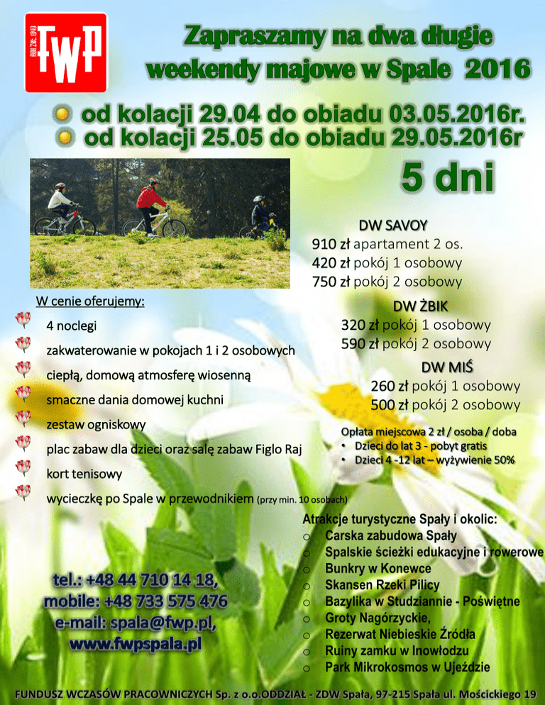 DW SAVOY 910 zł apartament 2 os. 420 zł pokój 1 osobowy 750 zł pokój 2 osobowy W cenie oferujemy: 4 noclegi zakwaterowanie w pokojach 1 i 2 osobowych DW ŻBIK 320 zł pokój 1 osobowy 590 zł pokój 2 osobowy DW MIŚ 260 zł pokój 1 osobowy 500 zł pokój 2 osobowy ciepłą, domową atmosferę wiosenną smaczne dania domowej kuchni zestaw ogniskowy plac zabaw dla dzieci oraz salę zabaw Figlo Raj Opłata miejscowa 2 zł / osoba / doba • Dzieci do lat 3 - pobyt gratis • Dzieci 4 -12 lat – wyżywienie 50% kort tenisowy wycieczkę po Spale w przewodnikiem (przy min. 10 osobach) Atrakcje turystyczne Spały i okolic: o Carska zabudowa Spały o Spalskie ścieżki edukacyjne i rowerowe o Bunkry w Konewce o Skansen Rzeki Pilicy o Bazylika w Studziannie - Poświętne o Groty Nagórzyckie, o Rezerwat Niebieskie Źródła o Ruiny zamku w Inowłodzu o Park Mikrokosmos w Ujeździe FUNDUSZ WCZASÓW PRACOWNICZYCH Sp. z o.o.ODDZIAŁ - ZDW Spała, 97-215 Spała ul. Mościckiego 19
