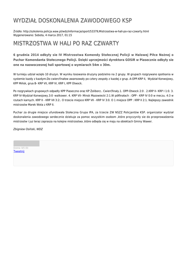 WYDZIAŁ DOSKONALENIA ZAWODOWEGO KSP Źródło: http://szkolenia.policja.waw.pl/wdz/informacje/sport/53379,Mistrzostwa-w-hali-po-raz-czwarty.html Wygenerowano: Sobota, 4 marca 2017, 01:15 MISTRZOSTWA W HALI PO RAZ CZWARTY 6 grudnia 2014 odbyły sie IV Mistrzostwa Komendy Stołecznej Policji w Halowej Piłce Nożnej o Puchar Komendanta Stołecznego Policji. Dzięki uprzejmości dyrektora GOSiR w Piasecznie odbyły sie one na naowoczesnej hali sportowej o wymiarach 54m x 30m. W turnieju udział wzięło 10 druzyn. W wyniku losowania druzyny podzielno na 2 grupy. W grupach rozgrywano spotkania w systemie kazdy z kazdym.Do cwiercfinałow awansowały po cztery zespoły z kazdej z grup. A-OPP.KRP II, Wydział Konwojowy, KPP Mińsk, grua B- KRP VII, KRP IV, KRP I, KPP Otwock. Po rozgrywkach grupowych odpadły KPP Piaseczno oraz KP Żoliborz.. Cwierćfinały.1. OPP-Otwock 2:0 . 2.KRP II- KRP I 1:0. 3. KRP IV-Wydział Konwojowy.3:0 -walkower. 4. KRP VII- Minsk Mazowiecki 2:1.W półfinałach : OPP - KRP IV 0:0 w meczu. 4:3 w rzutach karnych. KRP II - KRP VII 3:2:. O trzecie miejsce KRP VII - KRP IV 3:0. O 1 miejsce OPP : KRP II 2:1. Najlepszy zawodnik mistrzostw Marek Wota z KRP II. Puchar za drugie miejsce ufundowała Stołeczna Grupa IPA, za trzecie ZW NSZZ Policjantów KSP. organizator wydział doskonalenia zawodowego serdecznie dziekuje za pomoc wszystkim osobom ,które przyczyniły sie do przeprowadzenia mistrzostw i juz teraz zaprasza na kolejne mistrzostwa ,które odbęda się w maju na obiektach Gminy Wawer. Zbigniew Osiński, WDZ Ocena: 0/5 (0) Tweetnij