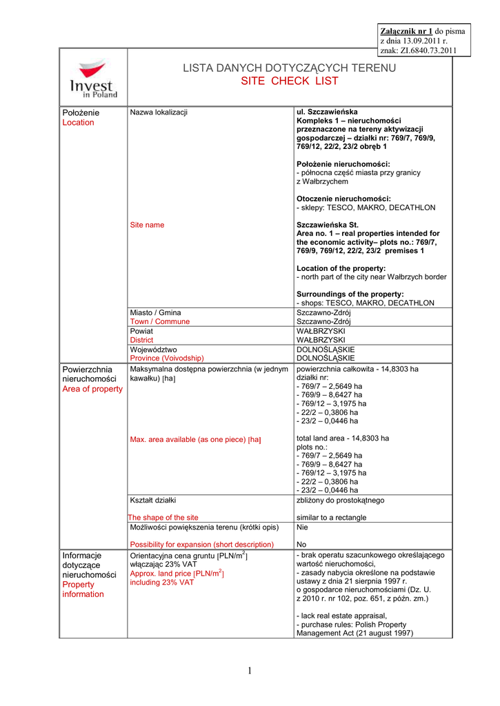 Załącznik nr 1 do pisma z dnia 13.09.2011 r. znak: ZI.6840.73.2011 LISTA DANYCH DOTYCZĄCYCH TERENU SITE CHECK LIST Położenie Location ul. Szczawieńska Kompleks 1 – nieruchomości przeznaczone na tereny aktywizacji gospodarczej – działki nr: 769/7, 769/9, 769/12, 22/2, 23/2 obręb 1 Nazwa lokalizacji Położenie nieruchomości: - północna część miasta przy granicy z Wałbrzychem Otoczenie nieruchomości: - sklepy: TESCO, MAKRO, DECATHLON Szczawieńska St. Area no. 1 – real properties intended for the economic activity– plots no.: 769/7, 769/9, 769/12, 22/2, 23/2 premises 1 Site name Location of the property: - north part of the city near Wałbrzych border Powierzchnia nieruchomości Area of property Miasto / Gmina Town / Commune Powiat District Województwo Province (Voivodship) Maksymalna dostępna powierzchnia (w jednym kawałku) ha Max. area available (as one piece) ha Kształt działki The shape of the site Możliwości powiększenia terenu (krótki opis) Informacje dotyczące nieruchomości Property information Possibility for expansion (short description) 2 Orientacyjna cena gruntu PLN/m włączając 23% VAT 2 Approx. land price PLN/m including 23% VAT Surroundings of the property: - shops: TESCO, MAKRO, DECATHLON Szczawno-Zdrój Szczawno-Zdrój WAŁBRZYSKI WAŁBRZYSKI DOLNOŚLĄSKIE DOLNOŚLĄSKIE powierzchnia całkowita - 14,8303 ha działki nr: - 769/7 – 2,5649 ha - 769/9 – 8,6427 ha - 769/12 – 3,1975 ha - 22/2 – 0,3806 ha - 23/2 – 0,0446 ha total land area - 14,8303 ha plots no.: - 769/7 – 2,5649 ha - 769/9 – 8,6427 ha - 769/12 – 3,1975 ha - 22/2 – 0,3806 ha - 23/2 – 0,0446 ha zbliżony do prostokątnego similar to a rectangle Nie No - brak operatu szacunkowego określającego wartość nieruchomości, - zasady nabycia określone na podstawie ustawy z dnia 21 sierpnia 1997 r. o gospodarce nieruchomościami (Dz. U. z 2010 r. nr 102, poz. 651, z późn. zm.) - lack real estate appraisal, - purchase rules: Polish Property Management Act (21 august 1997) 1 Właściciel / właściciele Uzdrowiskowa Gmina Miejska Szczawno-Zdrój Owner(s) Aktualny plan zagospodarowania przestrzennego (T/N) Valid zoning plan (Y/N) City of Szczawno-Zdrój Tak Przeznaczenie w miejscowym planie zagospodarowania przestrzennego tereny aktywizacji gospodarczej: - usługi komercyjne, - działalność produkcyjna, - handel hurtowy i detaiiczny, - obiekty handlowe o powierzchni sprzedaży 2 powyżej 1000 m , - bazy transportowe i przeładunkowe, - składy i magazyny; Zoning economic activity areas: - commercial services, - production, - wholesale and retail, 2 - shops over a sales areas of 1000 m , - transport and reloading bases, - warehouses; R – grunty orne klasy: IIIb (7,7884 ha), IVa (3,2872 ha); Ł – łąki klasy: III (3,7101 ha), W - rowy (0,0446 ha), odrolnienie – nie wymagane Yes Charakterystyka Klasa gruntów wraz z powierzchnią ha działki Land specification R – arable land class: IIIb (7,7884 ha), IVa (3,2872 ha); Ł – meadow class: III (3,7101 ha), W – ditch (0,0446 ha) change the status of farm land – not required różnica w zakresie pojedynczych działek ok. 2-7 m Soil class with area ha Różnica poziomów terenu m altitude difference between separate plots approx. 2-7 m Teren nieużytkowany Differences in land level m Obecne użytkowanie Present usage Unused area Zanieczyszczenia wód powierzchniowych i gruntowych (T/N) Soil and underground water pollution (Y/N) Nie Poziom wód gruntowych m ok. 2-4 m poniżej poziomu terenu Underground water level m approx. 2-4 m below the ground level Czy były prowadzone badania geologiczne terenu (T/N) Were geological research done (Y/N) Nie Ryzyko wystąpienia zalań lub obsunięć terenu (T/N) Risk of flooding or land slide (Y/N) Nie Przeszkody podziemne (T/N) Nie Underground obstacles (Y/N) No Przeszkody występujące na powierzchni terenu (T/N) Ground and overhead obstacles (Y/N) rów wodny – działka nr 23/2, obręb 1 2 No No No ditch - plot no 23/2 premises 1 Połączenia transportowe Transport links Istniejące ograniczenia ekologiczne (T/N) Nie Ecological restrictions (Y/N) No Budynki i zabudowania na terenie (T/N) Nie Buildings / other constructions on site (Y/N) No Droga dojazdowa do terenu (rodzaj drogi i jej szerokość) obwodnica Szczawna-Zdroju, droga wojewódzka nr 376 - ul. Szczawieńska, nawierzchnia - asfaltowa, pasy ruchu – 2 x 2, szerokość w liniach rozgraniczających - 40 m kategoria G; Access road to the plot (type and width of access road) Szczawno-Zdrój ring road, provincial road no. 376 Szczawieńska St., hard-surfaced road, existing number of traffic lanes – 2 x 2, width within demarcation - 40 m, category G; autostrada A4 – 35 km droga krajowa nr 35 – 2 km droga krajowa nr 5 – 20 km Autostrada / droga krajowa km Nearest motorway / national road km motorway A4 – 35 km national road no. 35 – 2 km national road no. 5 – 20 km Porty rzeczne i morskie w odległości do 200 km port rzeczny we Wrocławiu – 70 km port rzeczny w Opolu – 150 km Sea and river ports located up to 200 km Istniejąca infrastruktura Existing infrastructure river port Wrocław – 70 km river port Opole – 150 km Kolej km Wałbrzych – 5 km Railway line km Wałbrzych – 5 km Bocznica kolejowa km Wałbrzych – 1 km Railway siding km Wałbrzych – 1 km Najbliższe lotnisko międzynarodowe km Wrocław - 70 km Nearest international airport km Wrocław - 70 km Najbliższe miasto wojewódzkie km Wrocław - 70 km Nearest province capital km Wrocław - 70 km Elektryczność na terenie (T/N) Tak Electricity (Y/N) Yes Odległość przyłącza od granicy terenu Connection point (distance from boundary) m Napięcie Voltage V bezpośrednio directly 380 380 400 Dostępna moc Available capacity kW 400 Gaz na terenie (T/N) Gas (Y/N) Tak Yes 3 Odległość przyłącza od granicy działki Connection point (distance from boundary) m Wartość kaloryczna 3 Calorific value MJ/Nm Średnica rury Pipe dia