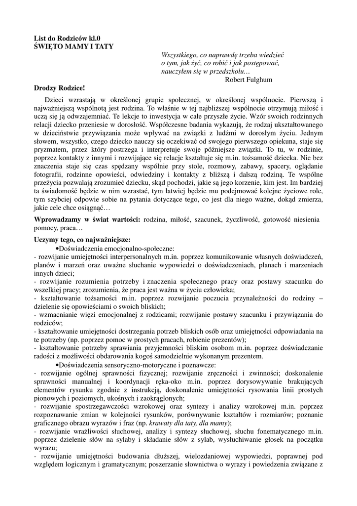 List do Rodziców kl.0 ŚWIĘTO MAMY I TATY Wszystkiego, co naprawdę trzeba wiedzieć o tym, jak żyć, co robić i jak postępować, nauczyłem się w przedszkolu… Robert Fulghum Drodzy Rodzice! Dzieci wzrastają w określonej grupie społecznej, w określonej wspólnocie. Pierwszą i najważniejszą wspólnotą jest rodzina. To właśnie w tej najbliższej wspólnocie otrzymują miłość i uczą się ją odwzajemniać. Te lekcje to inwestycja w całe przyszłe życie. Wzór swoich rodzinnych relacji dziecko przeniesie w dorosłość. Współczesne badania wykazują, że rodzaj ukształtowanego w dzieciństwie przywiązania może wpływać na związki z ludźmi w dorosłym życiu. Jednym słowem, wszystko, czego dziecko nauczy się oczekiwać od swojego pierwszego opiekuna, staje się pryzmatem, przez który postrzega i interpretuje swoje późniejsze związki. To tu, w rodzinie, poprzez kontakty z innymi i rozwijające się relacje kształtuje się m.in. tożsamość dziecka. Nie bez znaczenia staje się czas spędzany wspólnie przy stole, rozmowy, zabawy, spacery, oglądanie fotografii, rodzinne opowieści, odwiedziny i kontakty z bliższą i dalszą rodziną. Te wspólne przeżycia pozwalają zrozumieć dziecku, skąd pochodzi, jakie są jego korzenie, kim jest. Im bardziej ta świadomość będzie w nim wzrastać, tym łatwiej będzie mu podejmować kolejne życiowe role, tym szybciej odpowie sobie na pytania dotyczące tego, co jest dla niego ważne, dokąd zmierza, jakie cele chce osiągnąć… Wprowadzamy w świat wartości: rodzina, miłość, szacunek, życzliwość, gotowość niesienia pomocy, praca… Uczymy tego, co najważniejsze: •Doświadczenia emocjonalno-społeczne: - rozwijanie umiejętności interpersonalnych m.in. poprzez komunikowanie własnych doświadczeń, planów i marzeń oraz uważne słuchanie wypowiedzi o doświadczeniach, planach i marzeniach innych dzieci; - rozwijanie rozumienia potrzeby i znaczenia społecznego pracy oraz postawy szacunku do wszelkiej pracy; zrozumienia, że praca jest ważna w życiu człowieka; - kształtowanie tożsamości m.in. poprzez rozwijanie poczucia przynależności do rodziny – dzielenie się opowieściami o swoich bliskich; - wzmacnianie więzi emocjonalnej z rodzicami; rozwijanie postawy szacunku i przywiązania do rodziców; - kształtowanie umiejętności dostrzegania potrzeb bliskich osób oraz umiejętności odpowiadania na te potrzeby (np. poprzez pomoc w prostych pracach, robienie prezentów); - kształtowanie potrzeby sprawiania przyjemności bliskim osobom m.in. poprzez doświadczanie radości z możliwości obdarowania kogoś samodzielnie wykonanym prezentem. •Doświadczenia sensoryczno-motoryczne i poznawcze: - rozwijanie ogólnej sprawności fizycznej; rozwijanie zręczności i zwinności; doskonalenie sprawności manualnej i koordynacji ręka-oko m.in. poprzez dorysowywanie brakujących elementów rysunku zgodnie z instrukcją, doskonalenie umiejętności rysowania linii prostych pionowych i poziomych, ukośnych i zaokrąglonych; - rozwijanie spostrzegawczości wzrokowej oraz syntezy i analizy wzrokowej m.in. poprzez rozpoznawanie zmian w kolejności rysunków, porównywanie kształtów i rozmiarów; poznanie graficznego obrazu wyrazów i fraz (np. krawaty dla taty, dla mamy); - rozwijanie wrażliwości słuchowej, analizy i syntezy słuchowej, słuchu fonematycznego m.in. poprzez dzielenie słów na sylaby i składanie słów z sylab, wysłuchiwanie głosek na początku wyrazu; - rozwijanie umiejętności budowania dłuższej, wielozdaniowej wypowiedzi, poprawnej pod względem logicznym i gramatycznym; poszerzanie słownictwa o wyrazy i powiedzenia związane z tematami zajęć (np. przysłowia i powiedzenia dotyczące pracy, nazwy zawodów i narzędzia związane z zawodami); ćwiczenia słowotwórcze – wyszukiwanie określeń „mamy”; utrwalanie określeń stopnia pokrewieństwa; ćwiczenia ruchomych narządów artykulacyjnych, w szczególności warg i języka, ćwiczenia oddechowe; - rozwijanie myślenia twórczego poprzez próby obmyślenia etymologii nazw dni tygodnia (dlaczego dzień nosi taką a nie inną nazwę), poprzez robienie listy pomysłów na wspólne spędzanie czasu z tatą, z mamą, pomysłów na sprawianie rodzicom przyjemności; - utrwalanie pojęcia „tydzień” i rozumienia, że tydzień to także 7 dni liczone niezależnie od dnia tygodnia, przypomnienie nazw dni tygodnia i uświadamianie ich stałego następstwa. Jak wspierać dziecko? •Warto dostrzegać nawet najmniejsze gesty miłości względem bliskich. Czas tak szybko mija. Dzieci nie będą miały jeszcze raz 5 czy 6 lat, nie powtórzymy tych dni ani lat. Warto zatrzymać się od czasu do czasu każdego dnia, uśmiechnąć, przytulić, wysłuchać, nawet w tym najbardziej zapędzonym dniu. Pokazać, że jestem „dla Ciebie”. Warto porozmawiać o… miłości! •Jeśli na co dzień brakuje czasu lub pretekstu, aby zacząć rozmowę o tym, jak ważni są dla siebie wzajemnie członkowie rodziny, to różnego rodzaju święta, w tym Dzień Mamy, Dzień Taty i tydzień, w którym w zerówce dzieci rozmawiają o rodzicach, można potraktować jak dobrą okazję do porozmawiania o uczuciach w rodzinie, do nazwania uczuć i więzi, które łączą bliskich. Trudno przecenić wartość tak spędzonego czasu! Będzie to wzmacniało relacje i kształtowało poczucie tożsamości dziecka, budziło większą świadomość siebie i świadomość innych. •Warto także zachęcić dzieci, by porozmawiały ze swoimi rodzicami, dziadkami, ciociami i wujkami o ich dzieciństwie, by dzieliły się z nimi swoimi doświadczeniami, nurtującymi je pytaniami. W ten sposób dzieci nie tylko czerpią przyjemność ze wspólnego przebywania, ale poznają swoich bliskich, uczą się opowiadać o sobie i uczą się budowania głębokich relacji. Warto poczytać… M. Rusinek, Wierszyki rodzinne Z. Stanecka, Basia i Mama w pracy A. Stel