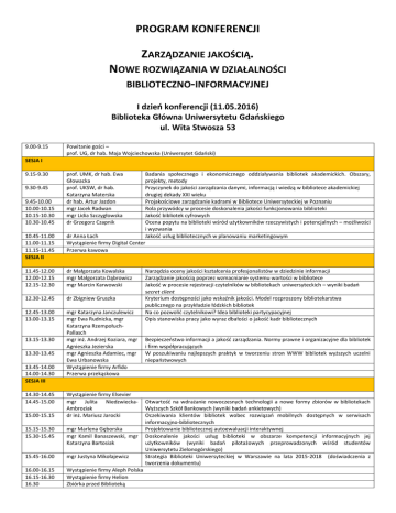 PROGRAM KONFERENCJI ZARZĄDZANIE JAKOŚCIĄ. NOWE ROZWIĄZANIA W DZIAŁALNOŚCI BIBLIOTECZNO-INFORMACYJNEJ I dzień konferencji (11.05.2016) Biblioteka Główna Uniwersytetu Gdańskiego ul. Wita Stwosza 53 9.00-9.15 Powitanie gości – prof. UG, dr hab. Maja Wojciechowska (Uniwersytet Gdański) SESJA I 9.15-9.30 9.30-9.45 9.45-10.00 10.00-10.15 10.15-10.30 10.30-10.45 10.45-11.00 11.00-11.15 11.15-11.45 SESJA II prof. UMK, dr hab. Ewa Głowacka prof. UKSW, dr hab. Katarzyna Materska dr hab. Artur Jazdon mgr Jacek Radwan mgr Lidia Szczygłowska dr Grzegorz Czapnik Badania społecznego i ekonomicznego oddziaływania bibliotek akademickich. Obszary, projekty, metody Przyczynek do jakości zarządzania danymi, informacją i wiedzą w bibliotece akademickiej drugiej dekady XXI wieku Projakościowe zarządzanie kadrami w Bibliotece Uniwersyteckiej w Poznaniu Rola przywódcy w procesie doskonalenia jakości funkcjonowania biblioteki Jakość bibliotek cyfrowych Ocena popytu na biblioteki wśród użytkowników rzeczywistych i potencjalnych – możliwości i wyzwania dr Anna Łach Jakość usług bibliotecznych w planowaniu marketingowym Wystąpienie firmy Digital Center Przerwa kawowa 11.45-12.00 12.00-12.15 12.15-12.30 dr Małgorzata Kowalska mgr Małgorzata Dąbrowicz mgr Marcin Karwowski 12.30-12.45 dr Zbigniew Gruszka 12.45-13.00 13.00-13.15 mgr Katarzyna Janczulewicz mgr Ewa Rudnicka, mgr Katarzyna RzempołuchPallasch mgr inż. Andrzej Koziara, mgr Agnieszka Jezierska mgr Agnieszka Adamiec, mgr Ewa Urbanowska Wystąpienie firmy Arfido Przerwa przekąskowa 13.15-13.30 13.30-13.45 13.45-14.00 14.00-14.30 SESJA III 14.30-14.45 14.45-15.00 15.00-15.15 Wystąpienie firmy Elsevier mgr Julita NiedzwieckaAmbroziak dr inż. Mariusz Jarocki 15.15-15.30 15.30-15.45 mgr Marlena Gęborska mgr Kamil Banaszewski, mgr Katarzyna Bartosiak 15.45-16.00 mgr Justyna Mikołajewicz 16.00-16.15 16.15-16.30 16.30 Wystąpienie firmy Aleph Polska Wystąpienie firmy Helion Zbiórka przed Biblioteką Narzędzia oceny jakości kształcenia profesjonalistów w dziedzinie informacji Zarządzanie jakością poprzez wzmacnianie systemu wartości w bibliotece Jakość w procesie rejestracji czytelników w bibliotekach uniwersyteckich – wyniki badań secret client Kryterium dostępności jako wskaźnik jakości. Model rozproszony bibliotekarstwa publicznego na przykładzie łódzkich bibliotek Na co pozwolić czytelnikowi? Idea biblioteki partycypacyjnej Opis stanowiska pracy jako wyraz dbałości o jakość kadr bibliotecznych Bezpieczeństwo informacji a jakość zarządzania. Normy prawne i organizacyjne dla bibliotek i firm współpracujących W poszukiwaniu najlepszych praktyk w tworzeniu stron WWW bibliotek wyższych uczelni niepaństwowych Otwartość na wdrażanie nowoczesnych technologii a nowe formy zbiorów w bibliotekach Wyższych Szkół Bankowych (wyniki badań ankietowych) Oczekiwania klientów bibliotek wobec rozwiązań mobilnych dostępnych w serwisach informacyjno-bibliotecznych Projektowanie bibliotecznej autoewaluacji interaktywnej Doskonalenie jakości usług biblioteki w obszarze kompetencji informacyjnych jej użytkowników (wyniki badań pilotażowych przeprowadzonych wśród studentów Uniwersytetu Zielonogórskiego) Strategia Biblioteki Uniwersyteckiej w Warszawie na lata 2015-2018 (doświadczenia z tworzenia dokumentu) 17.15-19.00 19.00 Uroczysta kolacja w Restauracji Filharmonia Zwiedzanie Starego Miasta z przewodnikiem II dzień konferencji (12.05.2016) Politechnika Gdańska ul. Narutowicza 11/12 Nowy Gmach Wydziału ETI 8.00-9.00 9.00-9.10 SESJA IV Zwiedzanie Biblioteki Politechniki Gdańskiej (Gmach Główny PG, zbiórka przy wejściu głównym) Otwarcie drugiego dnia konferencji - Bożena Hakuć (Dyrektor Biblioteki Politechniki Gdańskiej) 9.10-9.30 9.30-9.45 Prof. PG, dr hab. Piotr Grudowski dr Natalia Pamuła-Cieślak 9.45-10.00 10.00-10.15 10.15-10.30 mgr Edyta Strzelczyk mgr Daniel Ziarkowski mgr Urszula Knop 10.30-10.45 10.45-11.15 SESJA Va Wystąpienie firmy PWN Przerwa kawowa 11.15-11.30 11.30-11.45 11.45-12.00 12.15-12.30 mgr Magdalena Paul mgr Renata Borońska mgr Emilia Lepkowska, mgr Anna Szymczak mgr Iwona Osmulska mgr Dorota Janik mgr Justyna Garbarczyk 12.30-12.45 mgr Lidia Mikołajuk 12.45-13.00 mgr Alla Tarasiuk, mgr Alina Maniowiec Przerwa kawowa 12.00-12.15 13.00-13.30 SESJA Vb Systemowe zarządzanie jakością ze szczególnym uwzględnieniem usług biblioteki naukowej Czy można zmierzyć jakość otwartości? Polskie czasopisma otwartego dostępu wobec nowych wytycznych Directory of Open Access Journal Jakość postrzegana jako satysfakcja użytkowników Etyczne aspekty kultury organizacyjnej bibliotek Jakość usług biblioteczno-informacyjnych w bibliotece akademickiej w okresie rozwoju zasobów Open Access – wybrane zagadnienia Wpływ społeczny bibliotek publicznych Wybrane problemy zarządzania książkami elektronicznymi w bibliotece akademickiej Techniki motywowania dwóch pokoleń bibliotekarzy oraz ich znaczenie dla nowoczesnego zarządzania biblioteką akademicką Jakość usług bibliotecznych na przykładzie Biblioteki Państwowej Wyższej Szkoły Zawodowej w Elblągu Innowacje misją nowoczesnej Książnicy. Cyfryzacja administracji publicznej w Polsce a działalność Głównej Biblioteki Pracy i Zabezpieczenia Społecznego Transfer metadanych między platformą Repozytorium Uniwersytetu Łódzkiego a innymi systemami informacyjnymi Czas przemian. Gminna Biblioteka Publiczna w Wisznicach wobec wyzwań XXI wieku 11.15-11.30 mgr Monika Curyło 11.30-11.45 dr Magdalena Seta 11.45-12.00 mgr Mariola Augustyniak 12.00-12.15 12.15-12.30 mgr Mariola Nawrocka, mgr Magdalena Wiederek mgr Marzena Błach 12.30-12.45 mgr Sławomir Sobczyk 12.45-13.00 Michał Żytomirski 13.00-13.30 WARSZTATY Przerwa kawowa 13.30-15.30 mgr Jacek Radwan mgr Anna Jeglińska mgr Marcin Karwowski mgr Magdalena SzuflitaŻurawska Przerwa obiadowa Wykorzystanie metody zarządzania jakości