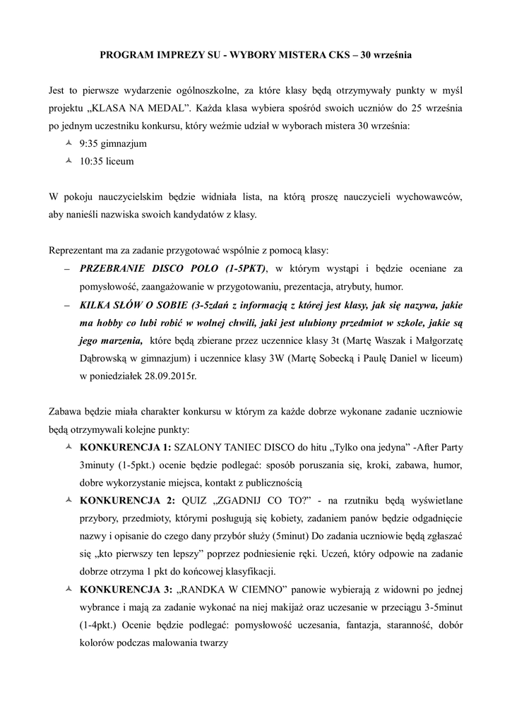PROGRAM IMPREZY SU - WYBORY MISTERA CKS – 30 września Jest to pierwsze wydarzenie ogólnoszkolne, za które klasy będą otrzymywały punkty w myśl projektu „KLASA NA MEDAL”. Każda klasa wybiera spośród swoich uczniów do 25 września po jednym uczestniku konkursu, który weźmie udział w wyborach mistera 30 września: 9:35 gimnazjum 10:35 liceum W pokoju nauczycielskim będzie widniała lista, na którą proszę nauczycieli wychowawców, aby nanieśli nazwiska swoich kandydatów z klasy. Reprezentant ma za zadanie przygotować wspólnie z pomocą klasy: PRZEBRANIE DISCO POLO (1-5PKT), w którym wystąpi i będzie oceniane za pomysłowość, zaangażowanie w przygotowaniu, prezentacja, atrybuty, humor. KILKA SŁÓW O SOBIE (3-5zdań z informacją z której jest klasy, jak się nazywa, jakie ma hobby co lubi robić w wolnej chwili, jaki jest ulubiony przedmiot w szkole, jakie są jego marzenia, które będą zbierane przez uczennice klasy 3t (Martę Waszak i Małgorzatę Dąbrowską w gimnazjum) i uczennice klasy 3W (Martę Sobecką i Paulę Daniel w liceum) w poniedziałek 28.09.2015r. Zabawa będzie miała charakter konkursu w którym za każde dobrze wykonane zadanie uczniowie będą otrzymywali kolejne punkty: KONKURENCJA 1: SZALONY TANIEC DISCO do hitu „Tylko ona jedyna” -After Party 3minuty (1-5pkt.) ocenie będzie podlegać: sposób poruszania się, kroki, zabawa, humor, dobre wykorzystanie miejsca, kontakt z publicznością KONKURENCJA 2: QUIZ „ZGADNIJ CO TO?” - na rzutniku będą wyświetlane przybory, przedmioty, którymi posługują się kobiety, zadaniem panów będzie odgadnięcie nazwy i opisanie do czego dany przybór służy (5minut) Do zadania uczniowie będą zgłaszać się „kto pierwszy ten lepszy” poprzez podniesienie ręki. Uczeń, który odpowie na zadanie dobrze otrzyma 1 pkt do końcowej klasyfikacji. KONKURENCJA 3: „RANDKA W CIEMNO” panowie wybierają z widowni po jednej wybrance i mają za zadanie wykonać na niej makijaż oraz uczesanie w przeciągu 3-5minut (1-4pkt.) Ocenie będzie podlegać: pomysłowość uczesania, fantazja, staranność, dobór kolorów podczas malowania twarzy KONKURENCJA 4: ŻYCZENIA DZIEWCZYN – na rzutniku zostaną odtworzone życzenia dziewczyn z każdej klasy, które same przygotowały i nagrały do 28.09.2015r. Życzenia można przesłać drogą elektroniczną do pani Ewy Gapskiej na adres [email protected] i do pani Izy Tomaszewskiej na adres [email protected] bądź poprzez przekazanie nagrania na przenośnym nośniku pendrive. Ocenie będzie podlegać (treść, pomysłowość nagrania, miejsce, humor, zaangażowanie) Można uzyskać od 1-10pkt. Klasa, która nie wywiążę się z zadanie otrzymuje 0pkt. Po przeprowadzonych konkurencjach będzie czas dla jury, które ogłosi werdykt i wręczy szarfy dla misterów.