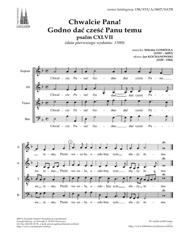 numer katalogowy: 158/XVI/A/0607/SATB Chwalcie Pana! Godno dać cześć Panu temu psalm CXLVII (data pierwszego wydania: 1580) muzyka: Mikołaj GOMÓŁKA (1535? - 1609?) słowa: Jan KOCHANOWSKI (1530 - 1584) Sopran &b c ˙ œ œ œ &b c ˙ œ œ œ Vb c ˙ œ œ œ ?b c ˙ œ Chwal - cie Alt Tenor Bas Pa - na! S A T &b œ nu œ- Go Chwal - cie Pa - na! Go - Go - œ te - mu, œ Pieśń œœ œœ œ te - mu, œ ?b œ œ œ œ nu œ œ te - mu, te - mu, Pieśń œ Pieśń œ Pieśń œ Pa - na! 5 j œ. œ œ œ œ. ˙ œ - Pa - na! Vb œœœ nu B œ Go Chwal - cie Chwal - cie &b œ ˙ dno œ dno œ œ J œ œ we - so - ła, o - zdo- bny dno œ dno œ œ rym œ œ dać œ cześć Pa - nu Pa - œ. œ. - j œ cześć Pa - œ. - - dać cześć Pa - - j j œ œ œ dać cześć œ œ dać œ œ œJ J œ œ œ ˙ słu - Ŝy Je œ J œ J - - U - w mu. U j œ œ œ œ œ œ œ w we - so - ła, o - zdo- bny rym słu - Ŝy Je -n mu. œ œ œ œ œ. œ œ. œ œ œ œ œ œ œ œ U w J J œ . œj œ œ œ œ . we - so - ła, o - zdo - bny rym œ œ œ œ œ œ we - so - ła, o - zdo- bny 2007 © Związek Chórów Kościelnych Caecilianum Zarząd Główny: ul. Dewajtis 3 , 01-815 Warszawa tel./fax: (22) 561 01 38 , e-mail: [email protected] http://www.caecilianum.webd.pl słu - Ŝy Je œ . œj œ œ œ ˙ rym słu - Ŝy Je - - mu. U w mu. Do uŜytku publicznego. http://www.biblioteka.caecilianum.webd.pl psalm CXLVII - Mikołaj GOMÓŁKA PSALM CXLVII Laudate Dominum, quoniam bonus est psalmus 1. Chwalcie Pana! Godno dać cześć Panu temu, Pieśń wesoła, ozdobny rym słuŜy Jemu. 11. W tych się kocha, którzy mu słuŜą statecznie I co na łaskę Jego kaŜą bezpiecznie. 2. Miasto jerozolimskie On znowu sadzi, A wygnance do własnych domów prowadzi. 12. Panu jerozolimskie obronne wały, Panu daj cześć, posado syjońskiej skały, 3. On smutne serca cieszy, troski lekuje, Rany wiąŜe, boleści wszelkie ujmuje. 13. Który w Ŝelezie szczerym bramy twe kowal I synom twym dóbr hojność wielką zgotował; 4. On wszytkich gwiazd niebieskich liczbę ma w głowie I kaŜdą swoim własnym imieniem zowie. 14. Który pokojem usłał Twoje granice, A ciebie łojem karmi tłustej pszenice; 5. Bóg nasz, Bóg wielkiej siły, wielkiej moŜności, Niepojęty, niezmierny w swojej mądrości. 15. Który skoro ziemi swe powie wyroki, Słowa Jego nie cierpią Ŝadnej odwłoki; 6. On skromne, On pokorne na górę sadza, A harde niepoczesnie na dół sprowadza. 16. Który śniegiem by wełną pola odziewa, A śrzeŜ po ziemi jako popiół rozsiewa. 7. Panu, czyniąc powinne dzięki, śpiewajcie, Panu na słodkobrzmiących cytarach grajcie. 17. Lód z nieba miece jako blachy łupane, Którego srogie zimno komu wytrwane? 8. Który burze zgromadza, ziemię dŜdŜem chłodzi, Trawę bujną po górach wysokich rodzi. 18. Rzecze słowo, a lody natychmiast tają; Wienie duch Jego, a wnet wody wzbierają. 9. Który Ŝywność wszelakim dawa zwierzętom I biednym, co wołają k'Niemu, kruczętom. 19. Ten wyroki, Ten sądy swe Jakubowi, Ten oznajmił zakon swój Izraelowi. 10. Nie patrzą on na dzielność wyprawnych koni Ani oka za chybkim szermierzem skłoni; 20. śadnemu narodowi Pan się nie stawił Tak łaskawie ani praw swoich objawił. -2- http://www.biblioteka.caecilianum.webd.pl